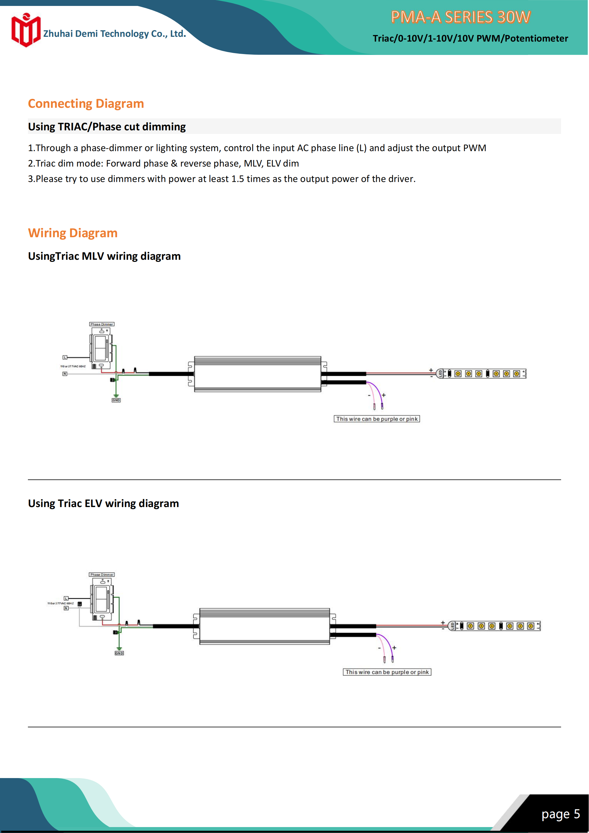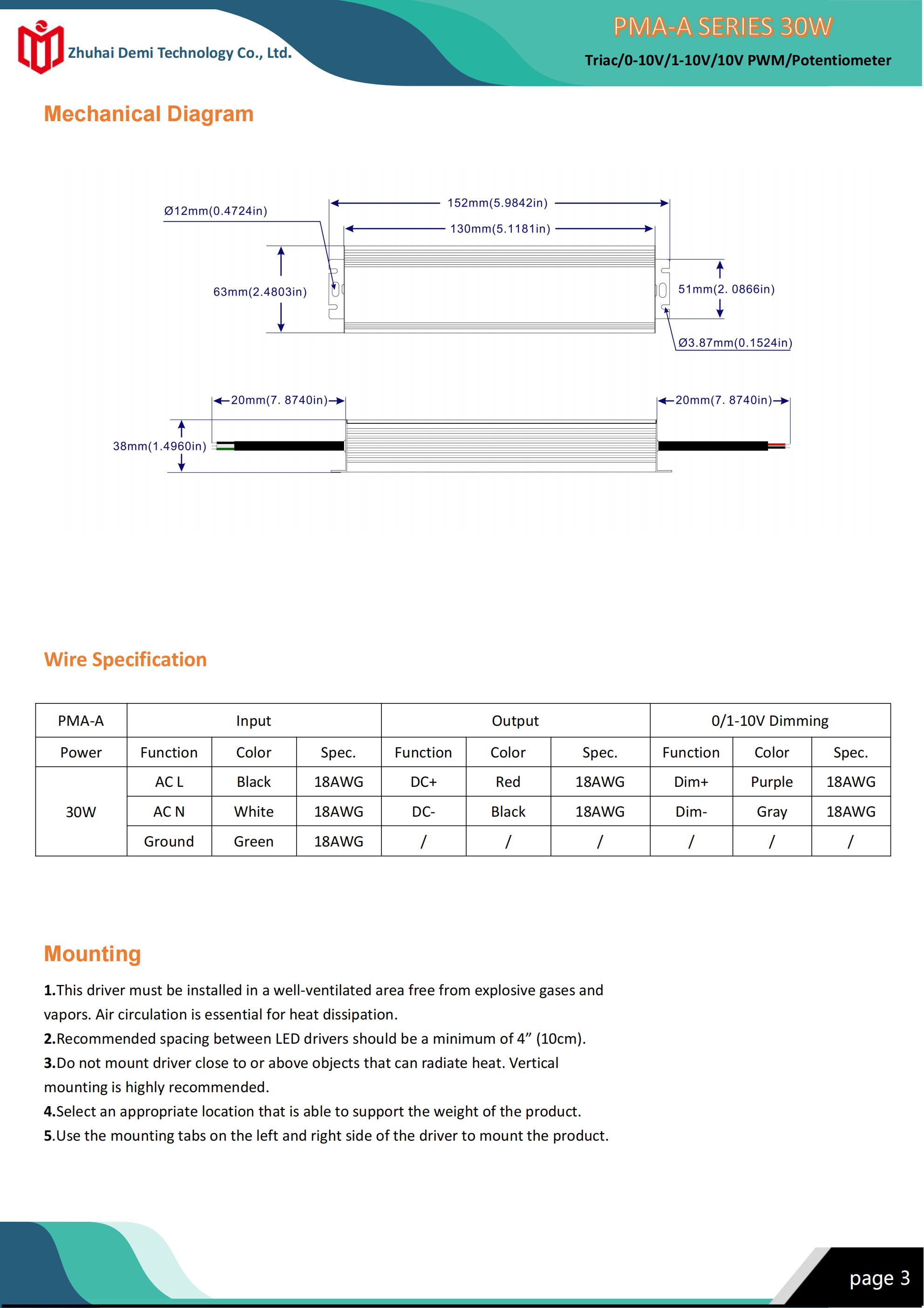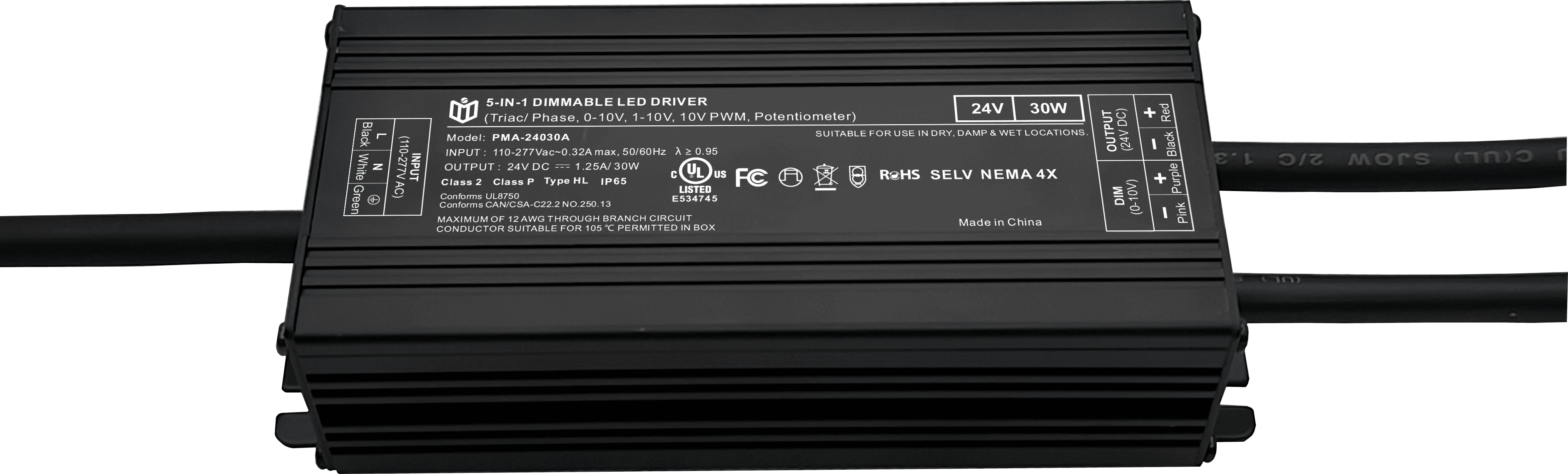 Item number: PMA-12030A.PMA-24030A PMA-48030A Dim: Triac/0-10V/1-10V/10V PWM / Potentiometer Dimming method: PWM Input Voltage: 110-277V Output Voltage: 12V/24V/48V PF: ≥0.9 Efficiency: ≥85% Protection: short circuit,overload,over-temperature, Certificate: UL list Brand: DEMI