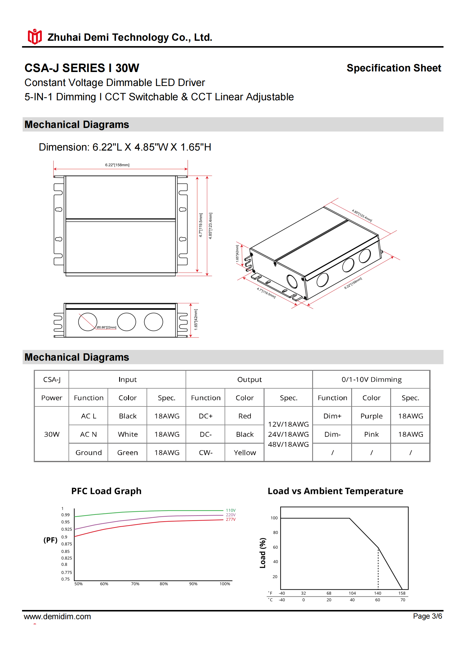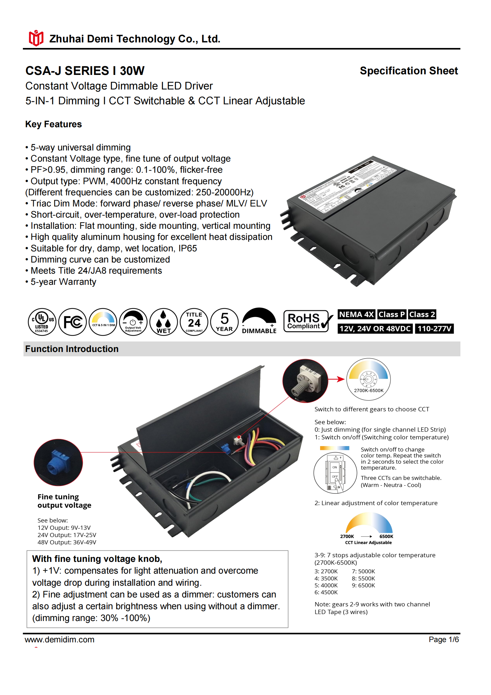 tem number: CSA-12030J,CSA-24030J,CSA-48030J Type : Constant voltage Dim: Triac/0-10V/1-10V/10V PWM / Potentiometer Output Method: PWM Input Voltage: 110-277V Output Voltage: 12V/24V/48V PF: ≥0.9 Efficiency: ≥85% Protection: short circuit,overload,over-temperature, Certificate: UL list Brand: DEMI