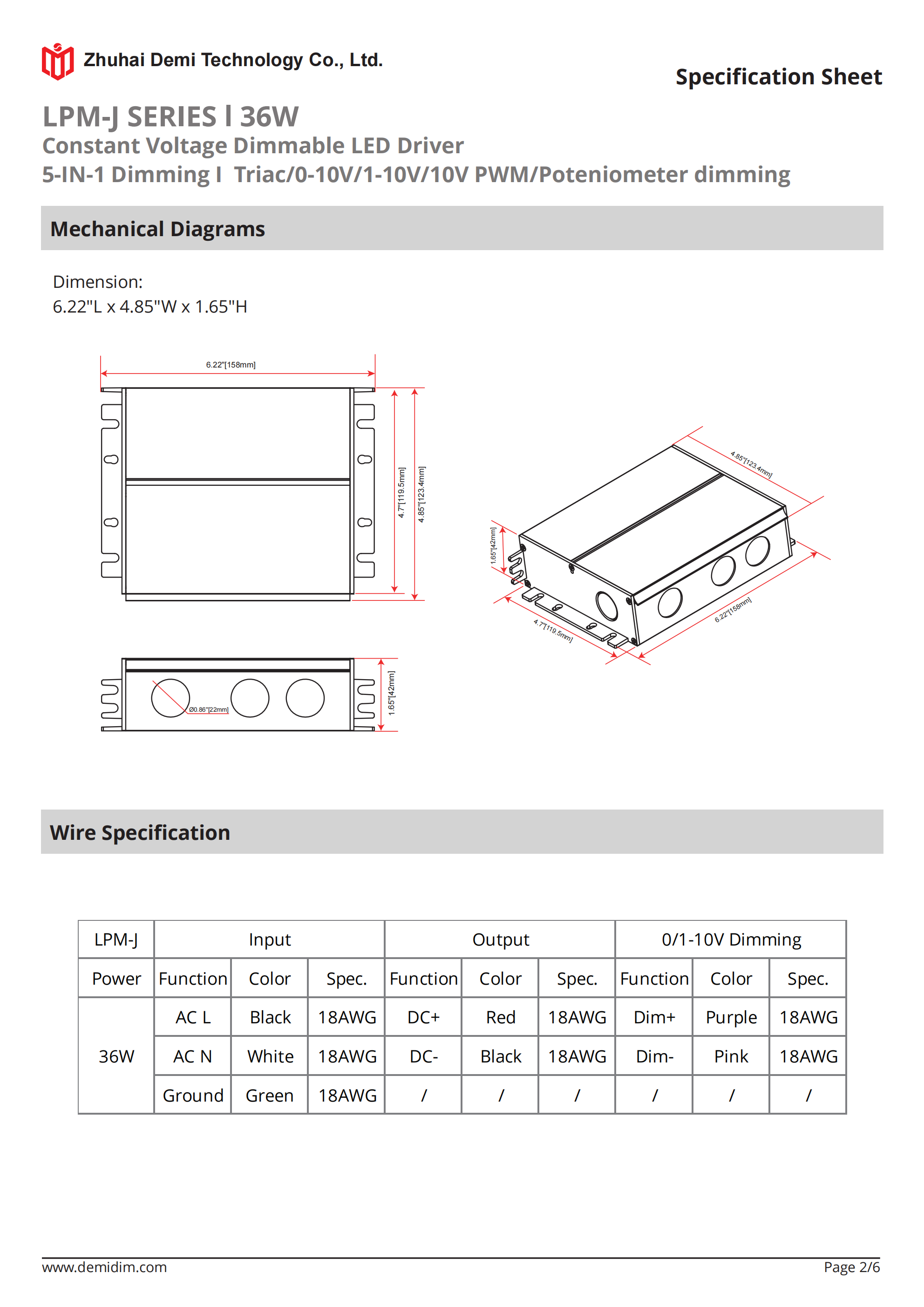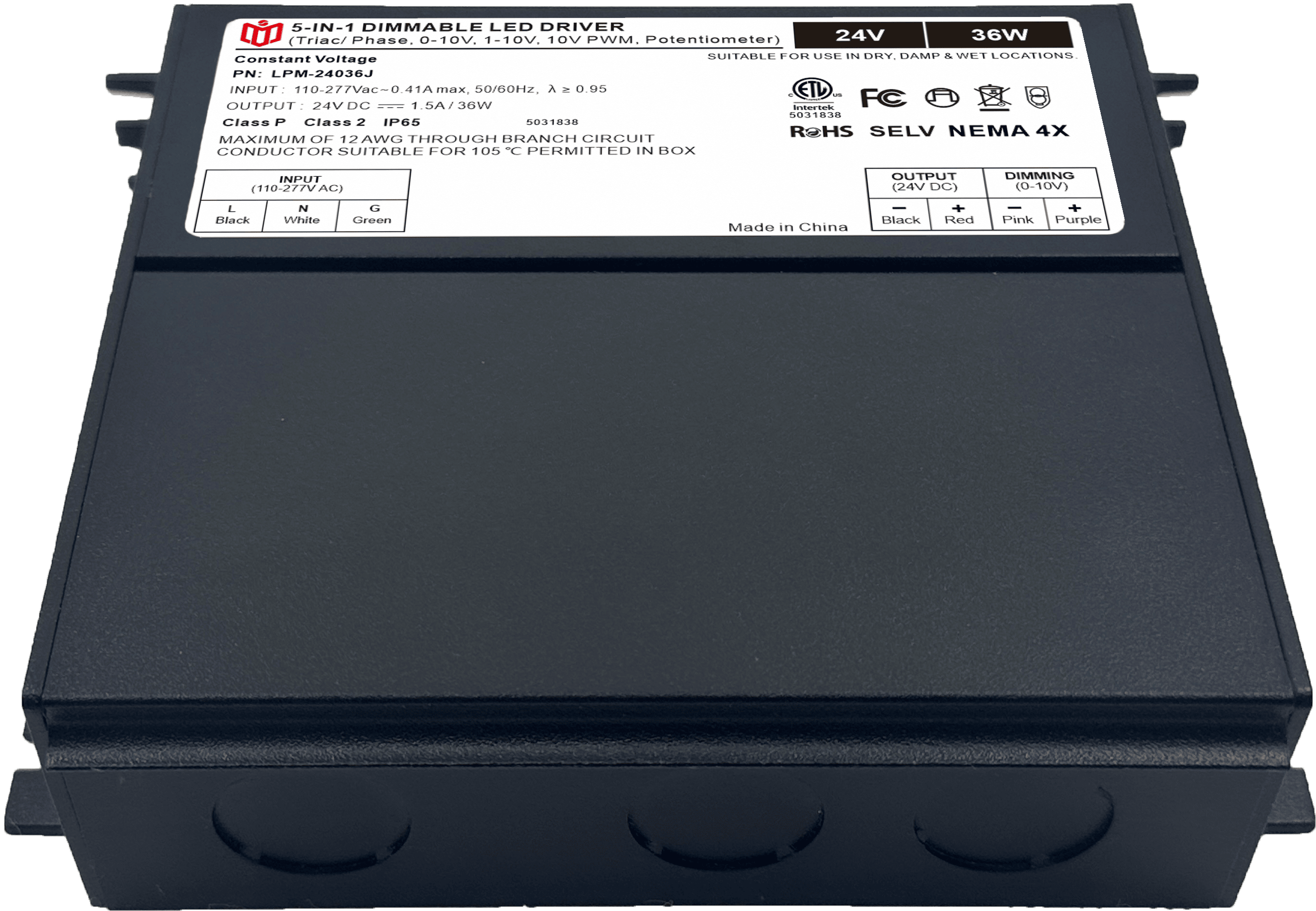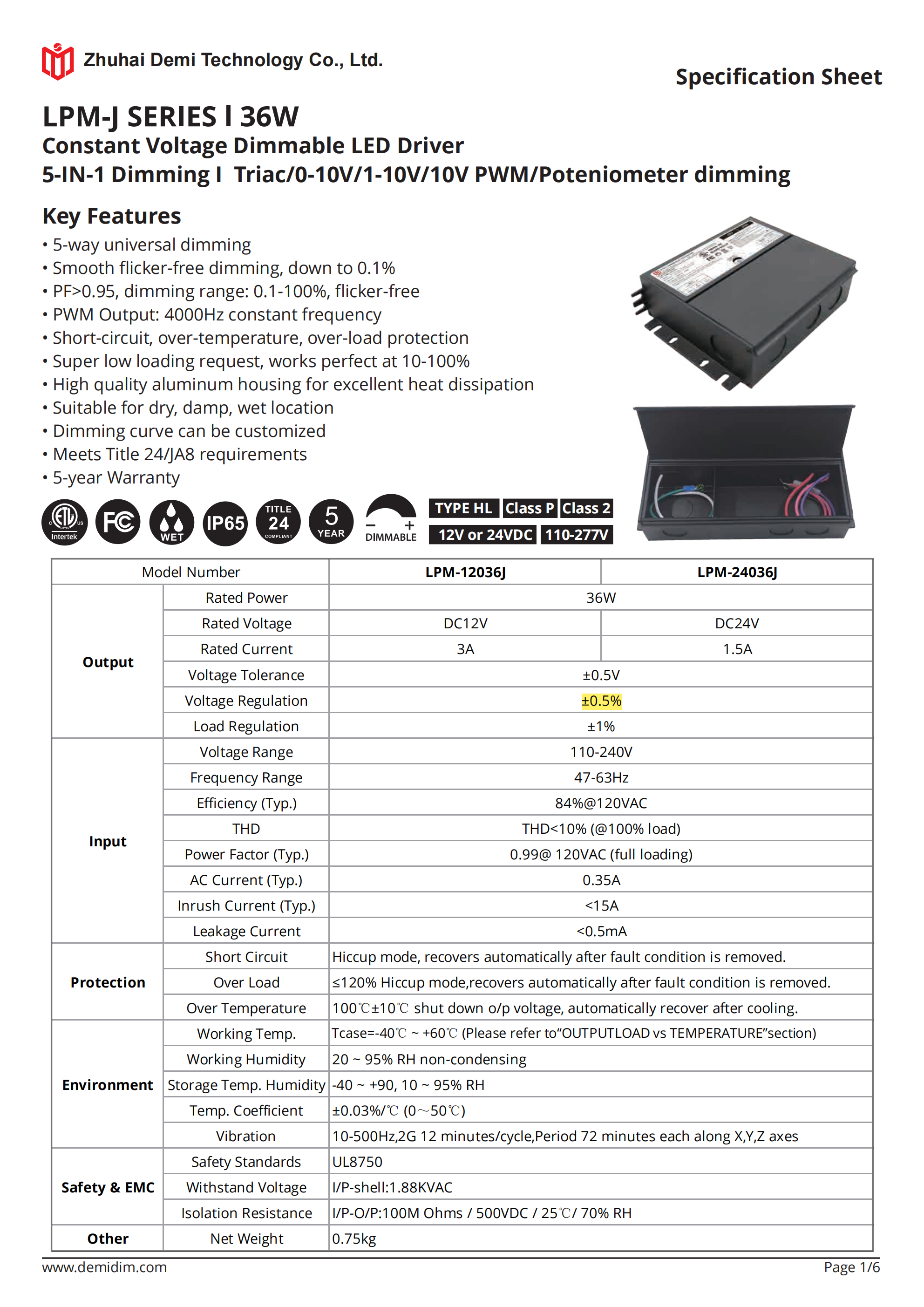 Item number: LPM-12036J,LPM-24036J Dim: Triac/0-10V/1-10V/10V PWM / Potentiometer Dimming method: PWM Input Voltage: 110-277V Output Voltage: 12V/24V PF: ≥0.9 Efficiency: ≥84% Warranty: 5 years. Protection: short circuit,overload,over-temperature, Certificate: ETL list Brand: DEMI
