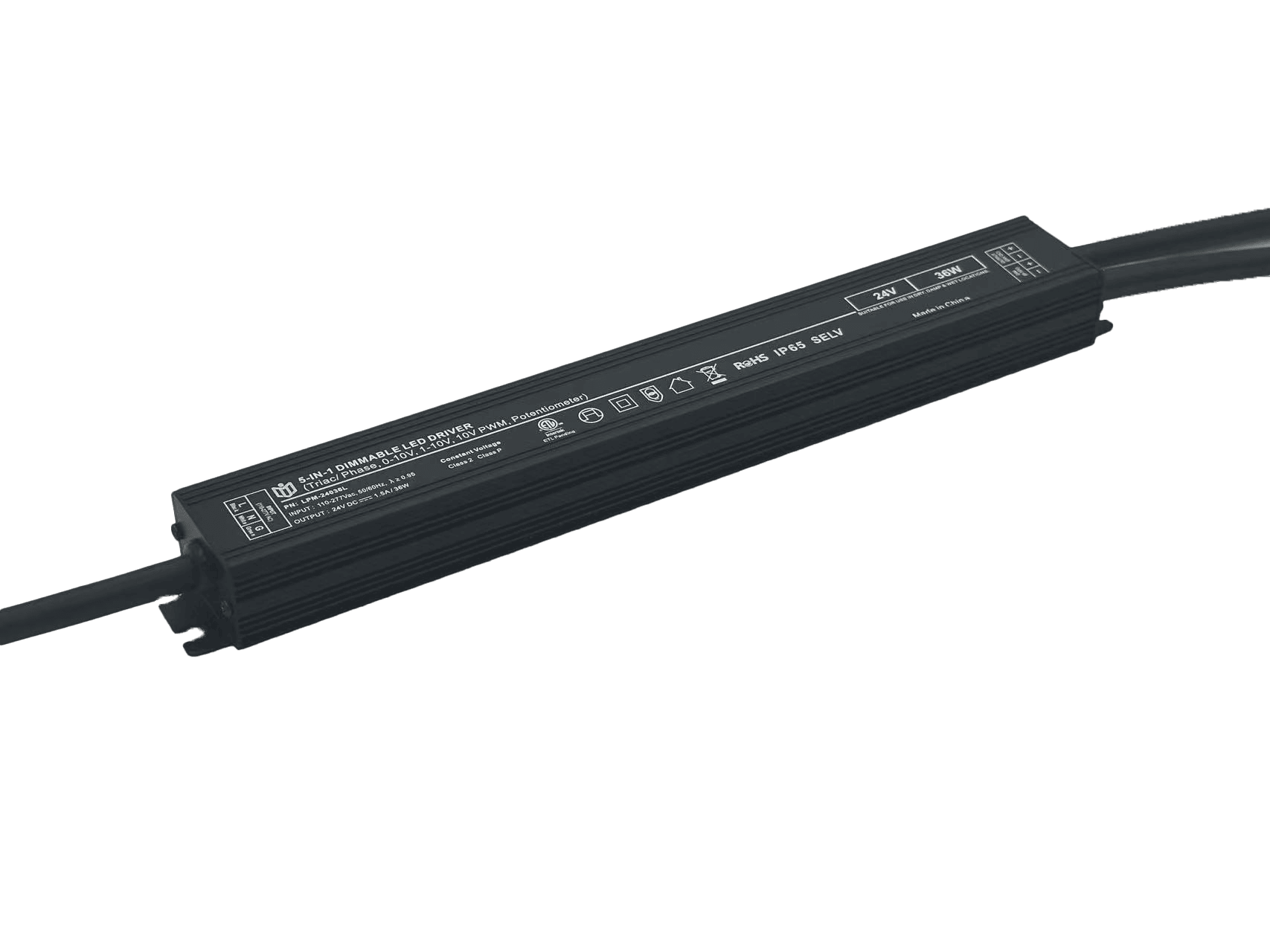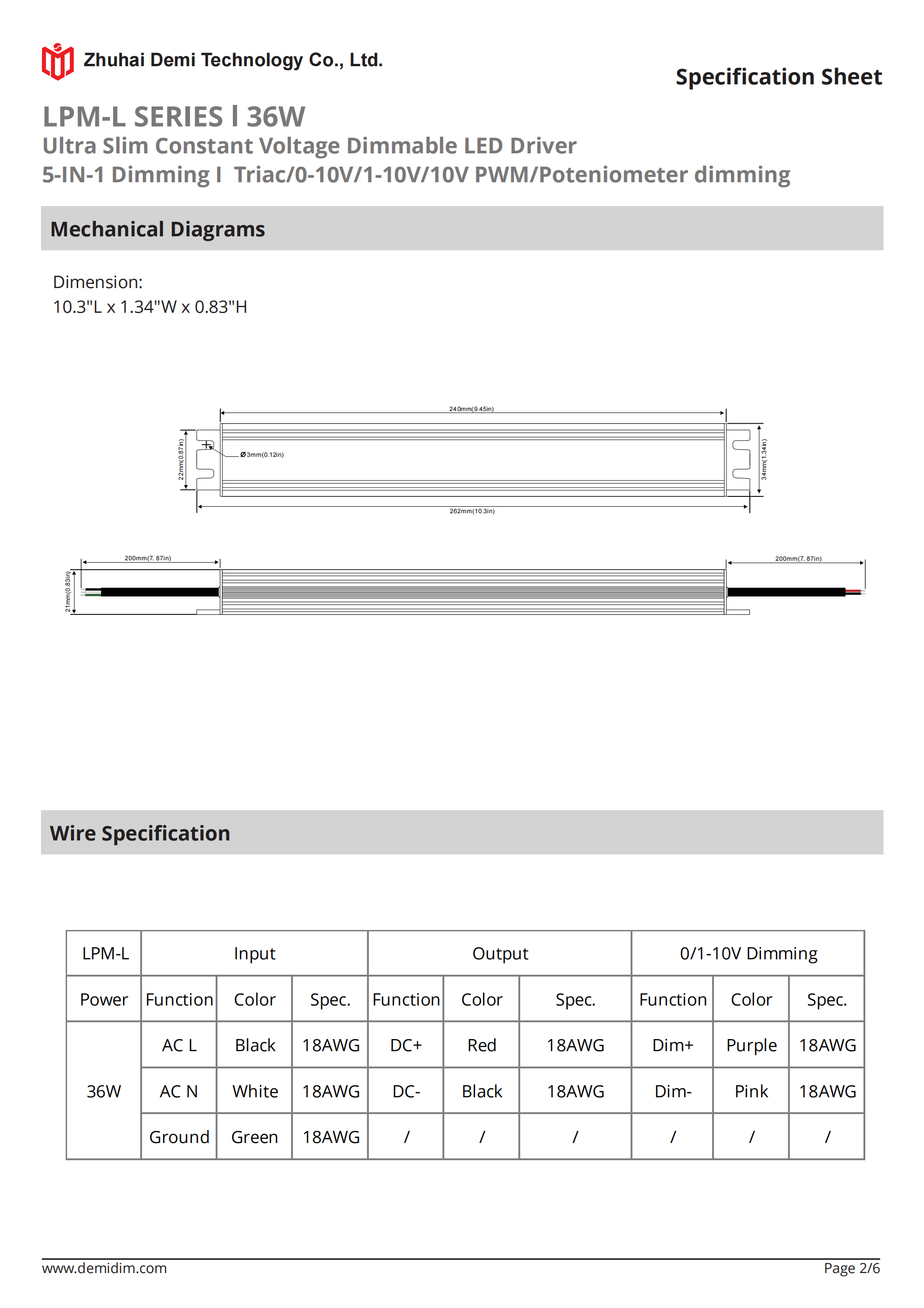 Item number: LPM-12036L,LPM-24036L Dim: Triac/0-10V/1-10V/10V PWM / Potentiometer Dimming method: PWM Input Voltage: 110-277V Output Voltage: 12V/24V PF: ≥0.9 Efficiency: ≥84% Warranty: 5 years. Protection: short circuit,overload,over-temperature, Certificate: ETL list Brand: DEMI