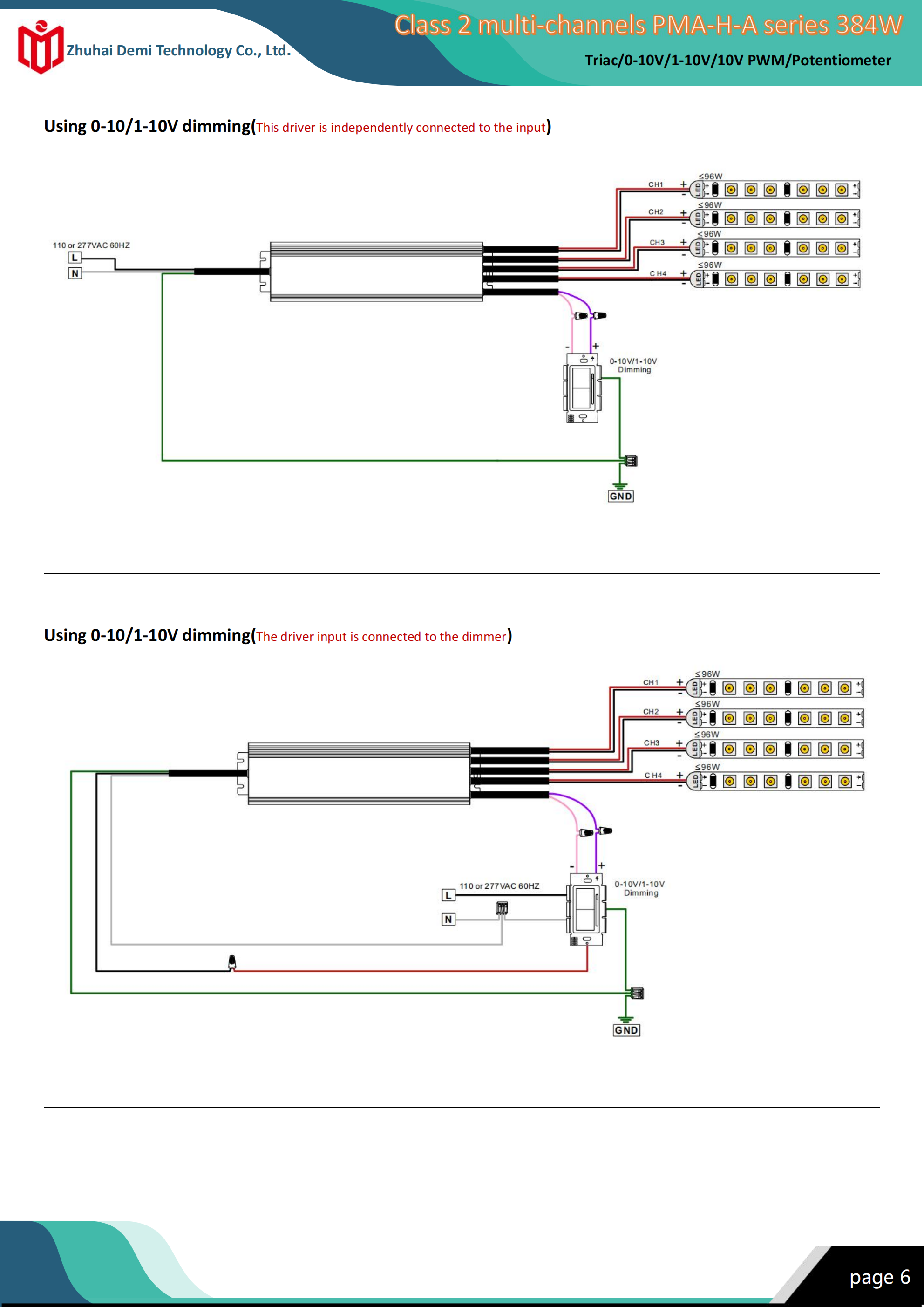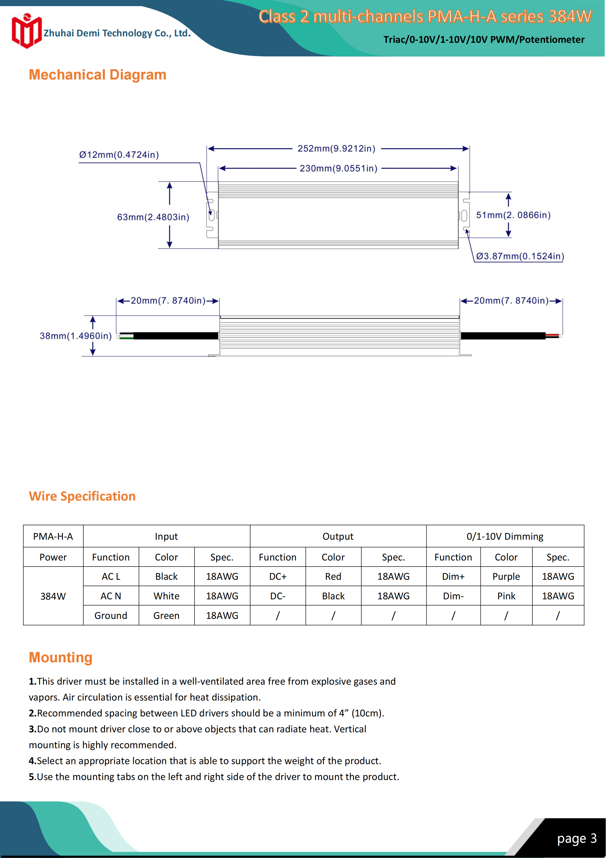 Item number: PMA-H24384A PMA-H48384A Dim: Triac/0-10V/1-10V/10V PWM / Potentiometer Output Method: PWM Input Voltage: 110-277V Output Voltage: 24V/48V PF: ≥0.9 Efficiency: ≥85% Warranty: 5 years. Protection: short circuit,overload,over-temperature, Certificate: UL list Brand: DEMI