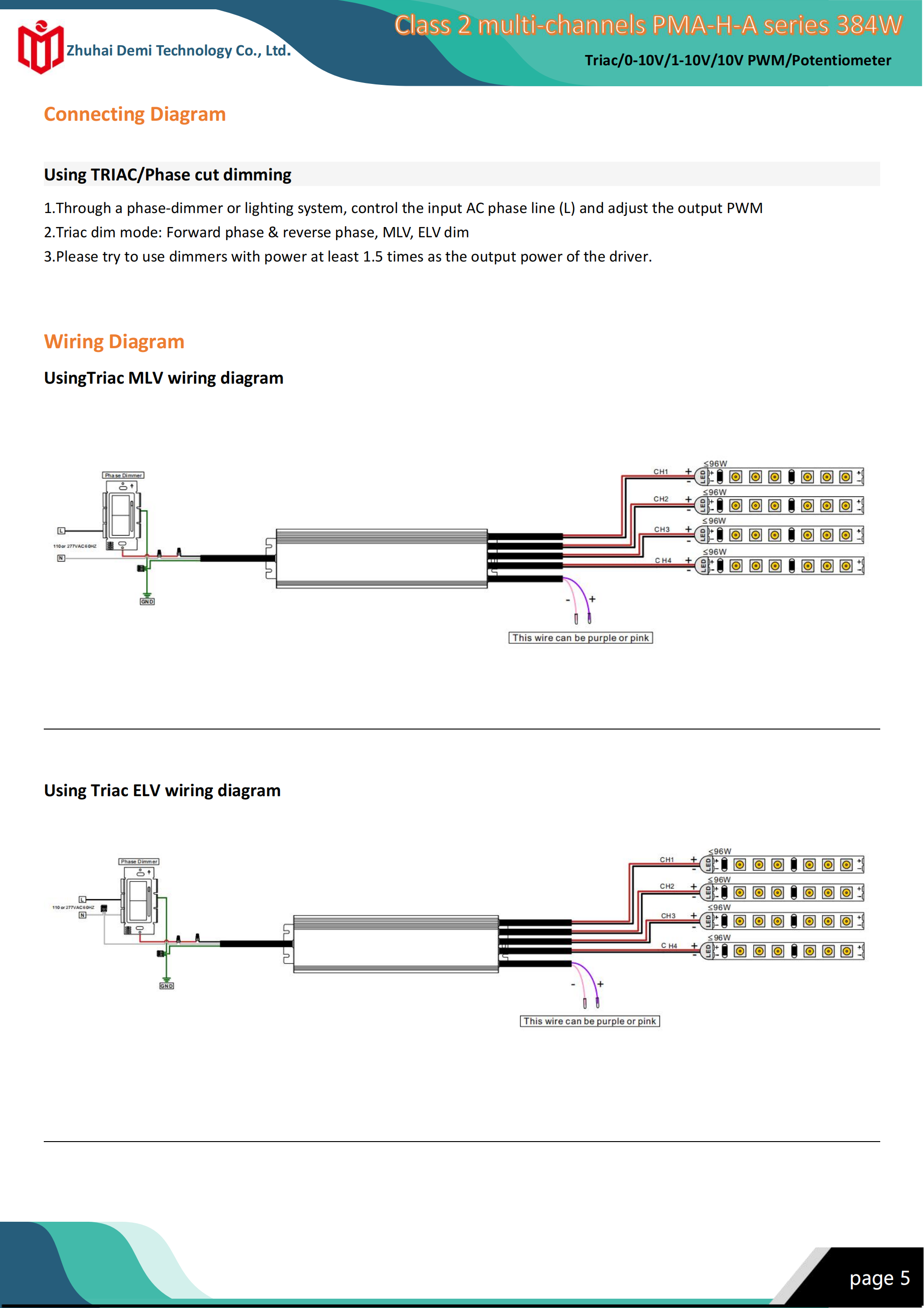 Item number: PMA-12150A PMA-24150A PMA-48150A Dim: Triac/0-10V/1-10V/10V PWM / Potentiometer Output Method: PWM Input Voltage: 110-277V Output Voltage: 12V/24V/48V PF: ≥0.9 Efficiency: ≥85% Warranty: 5 years. Protection: short circuit,overload,over-temperature, Certificate: UL list Brand: DEMI