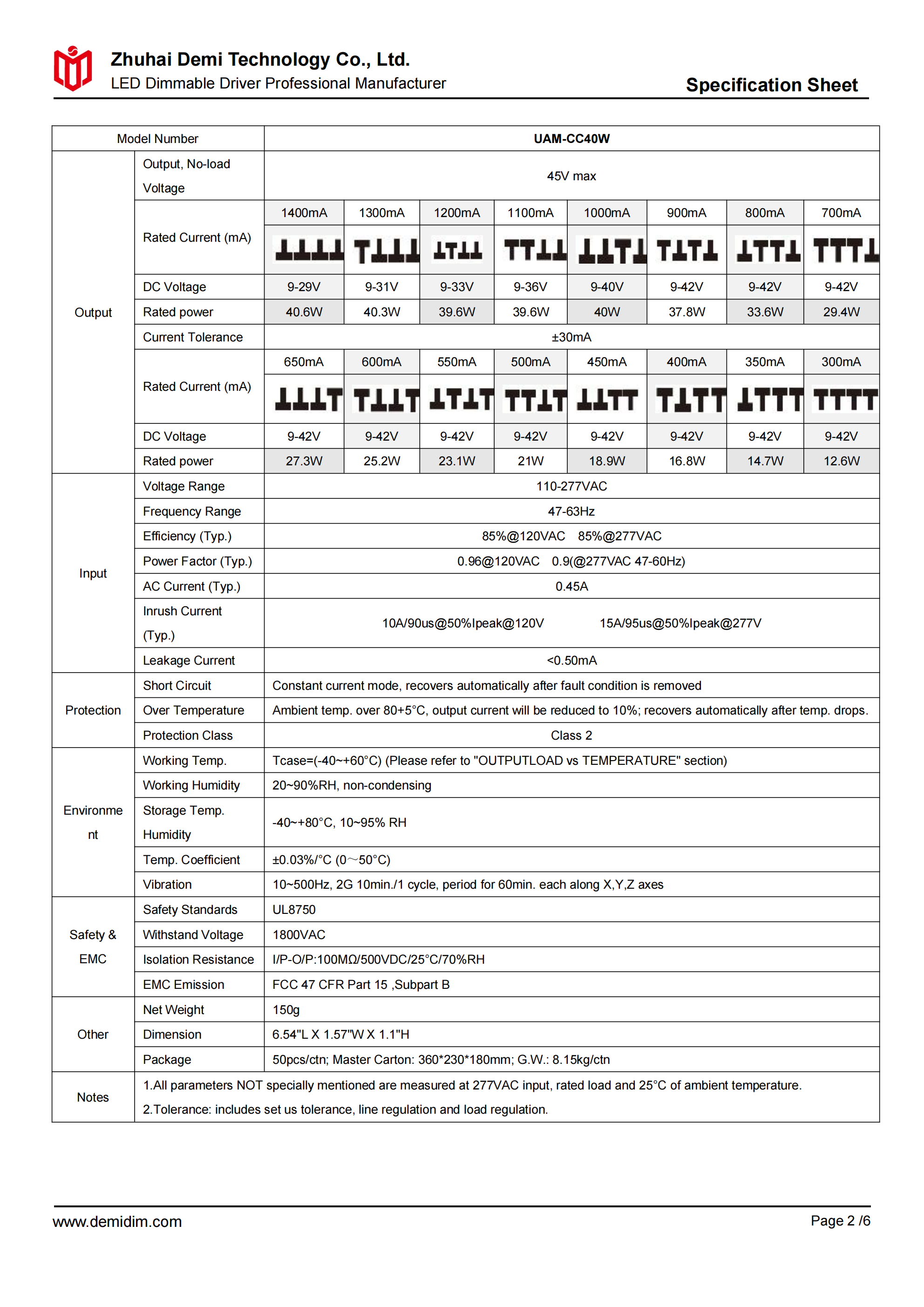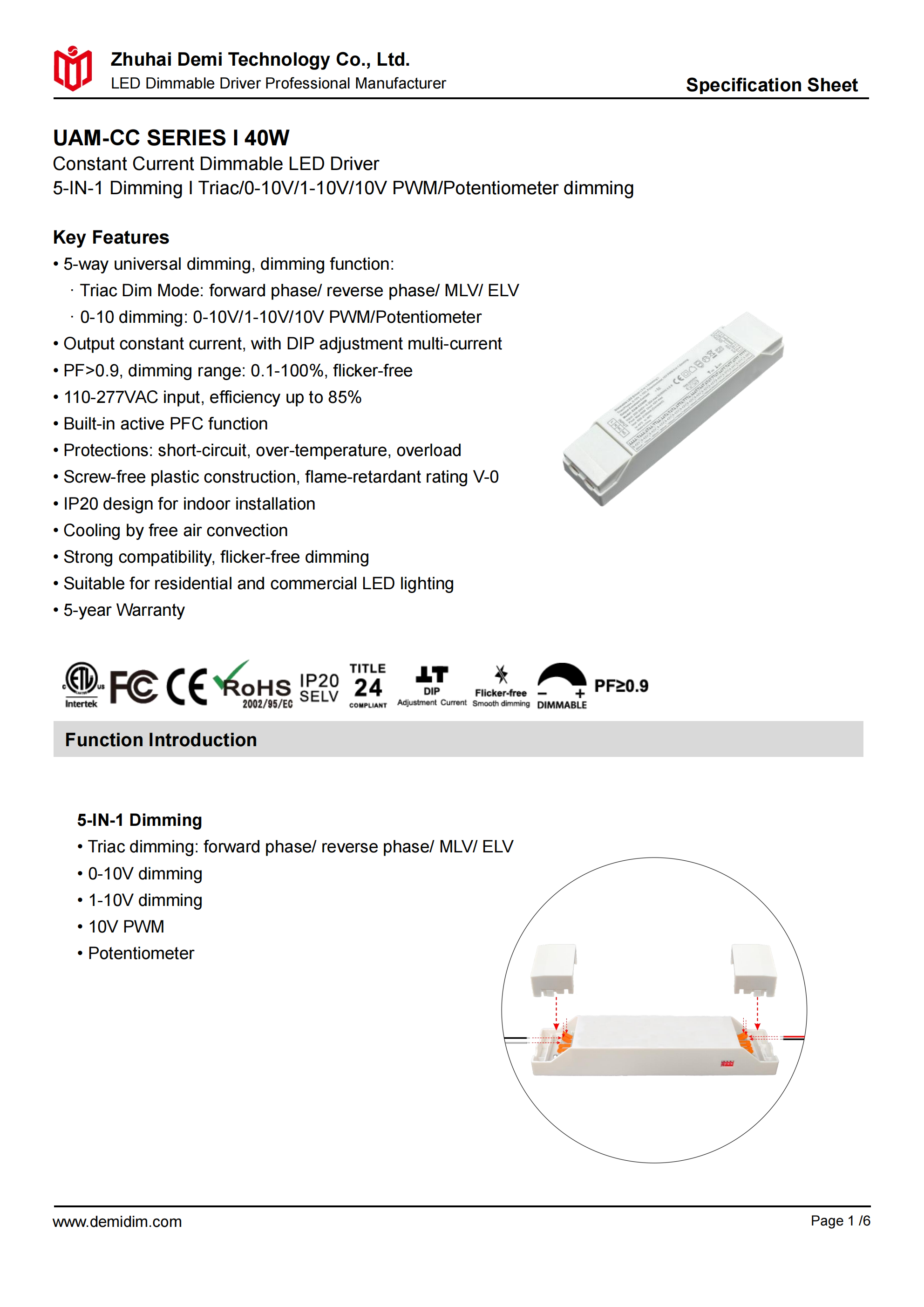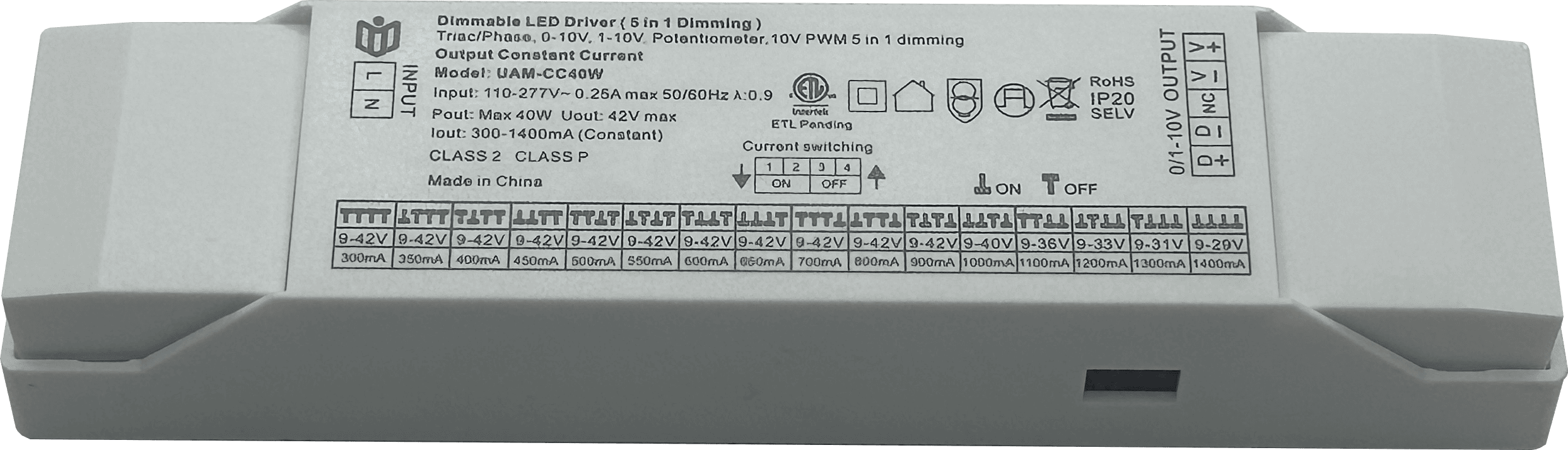 Item number: UAM-CC40W Type : constant current Dimming Mode: Triac/0-10V/1-10V/10V PWM / Potentiometer Output Method: Output current can be selected based on DIP switch Input Voltage: 110-277V Output current: PF: ≥0.9 Efficiency: ≥85% Warranty: 5 years. Protection: short circuit,overload,over-temperature, Certificate: ETL Brand: DEMI