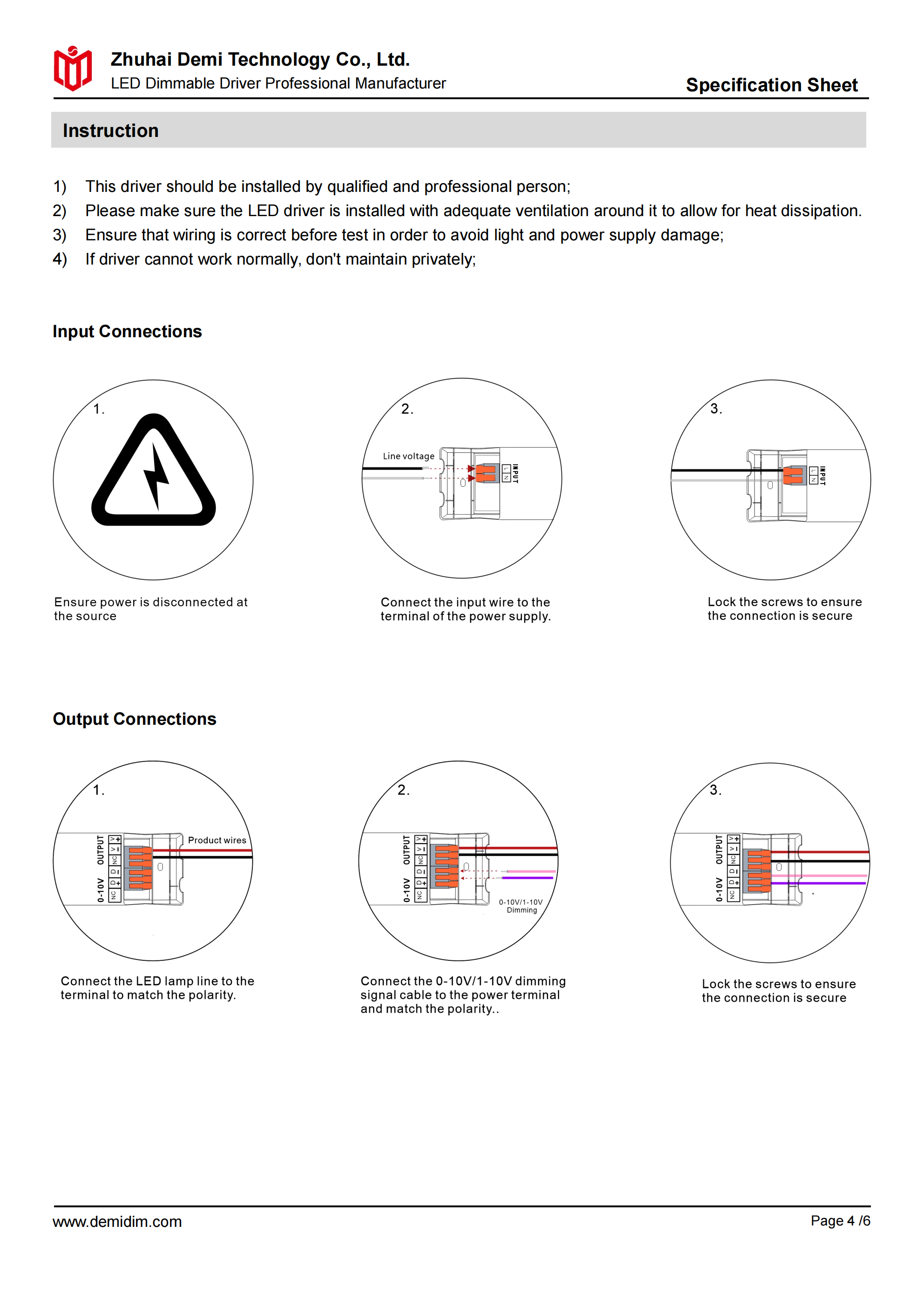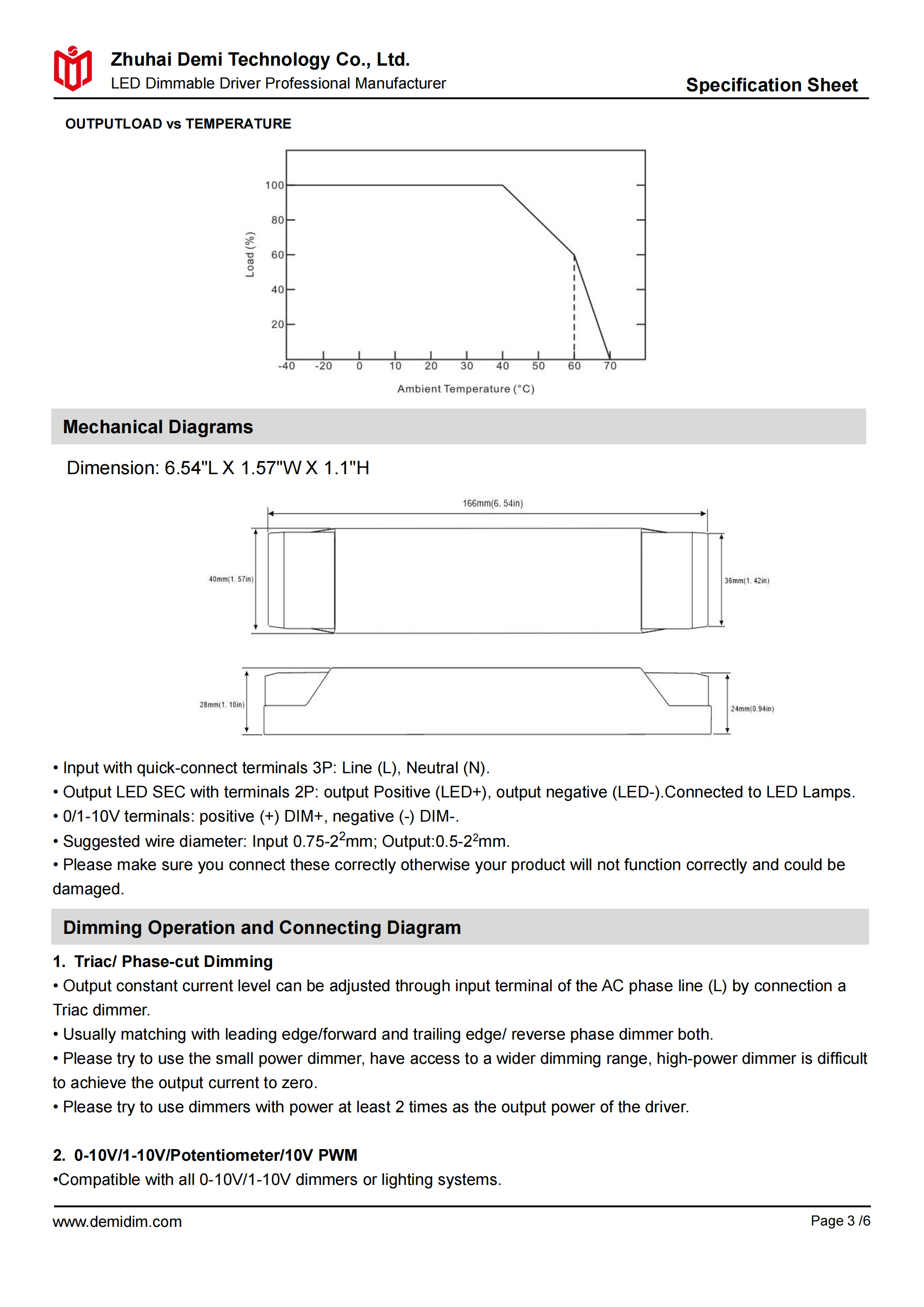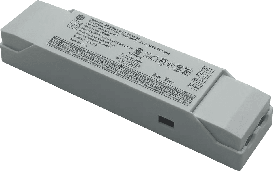 Item number: UAM-CC40W Type : constant current Dimming Mode: Triac/0-10V/1-10V/10V PWM / Potentiometer Output Method: Output current can be selected based on DIP switch Input Voltage: 110-277V Output current: PF: ≥0.9 Efficiency: ≥85% Warranty: 5 years. Protection: short circuit,overload,over-temperature, Certificate: ETL Brand: DEMI