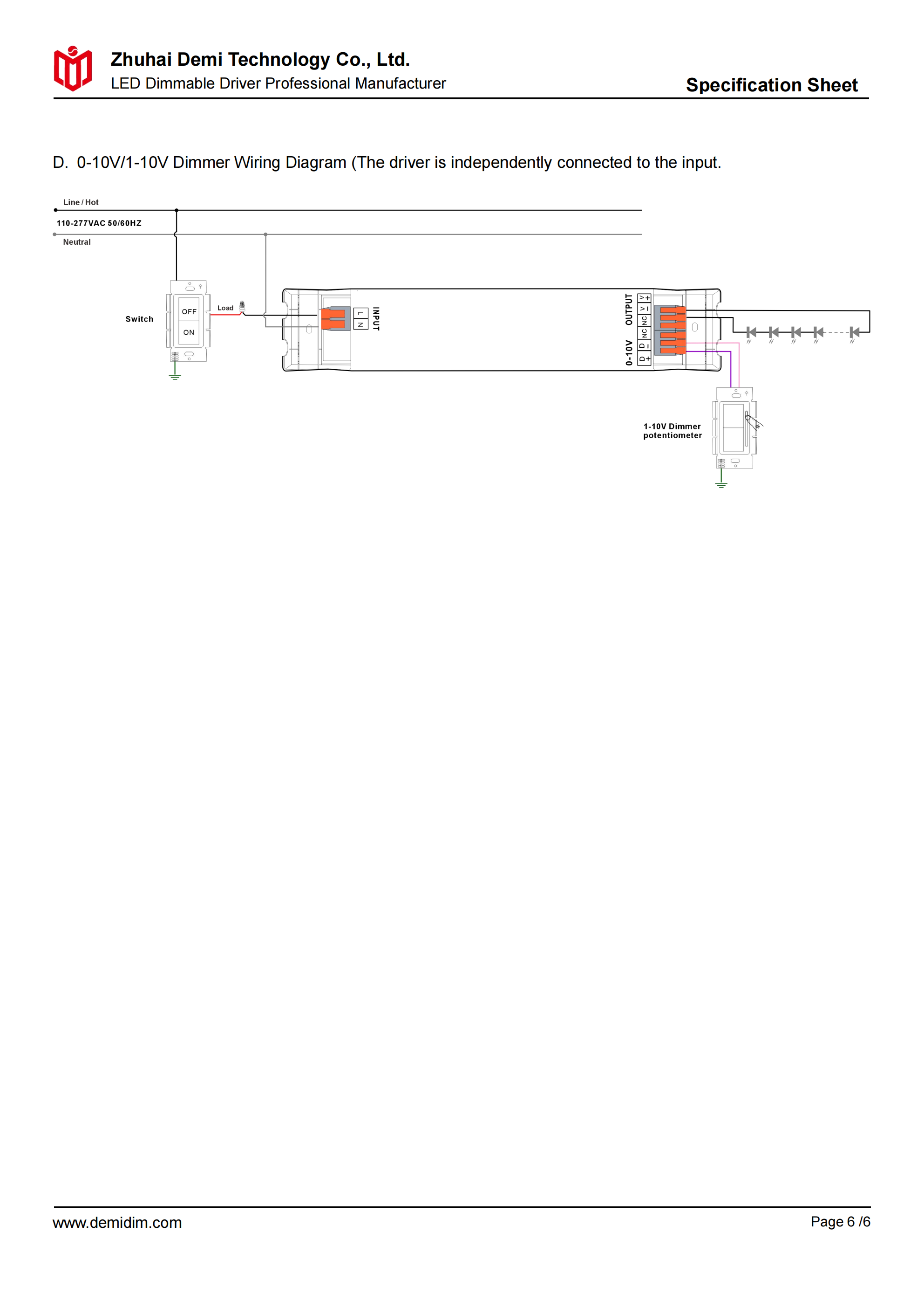Item number: UAM-CC10W Type : constant current Dimming Mode: Triac/0-10V/1-10V/10V PWM / Potentiometer Output Method: Output current can be selected based on DIP switch Input Voltage: 110-277V Output current: PF: ≥0.9 Efficiency: ≥85% Warranty: 5 years. Protection: short circuit,overload,over-temperature, Certificate: ETL Brand: DEMI