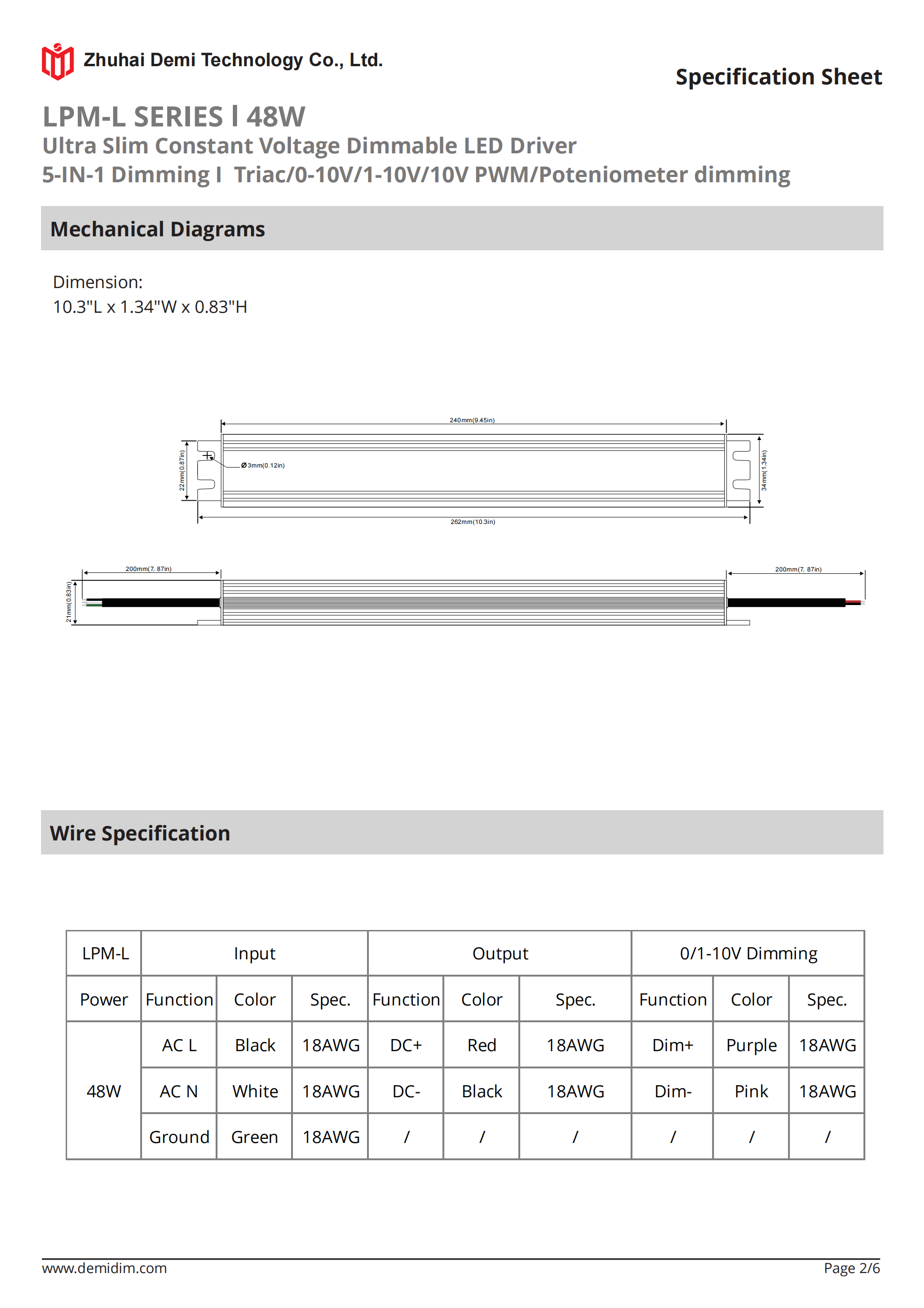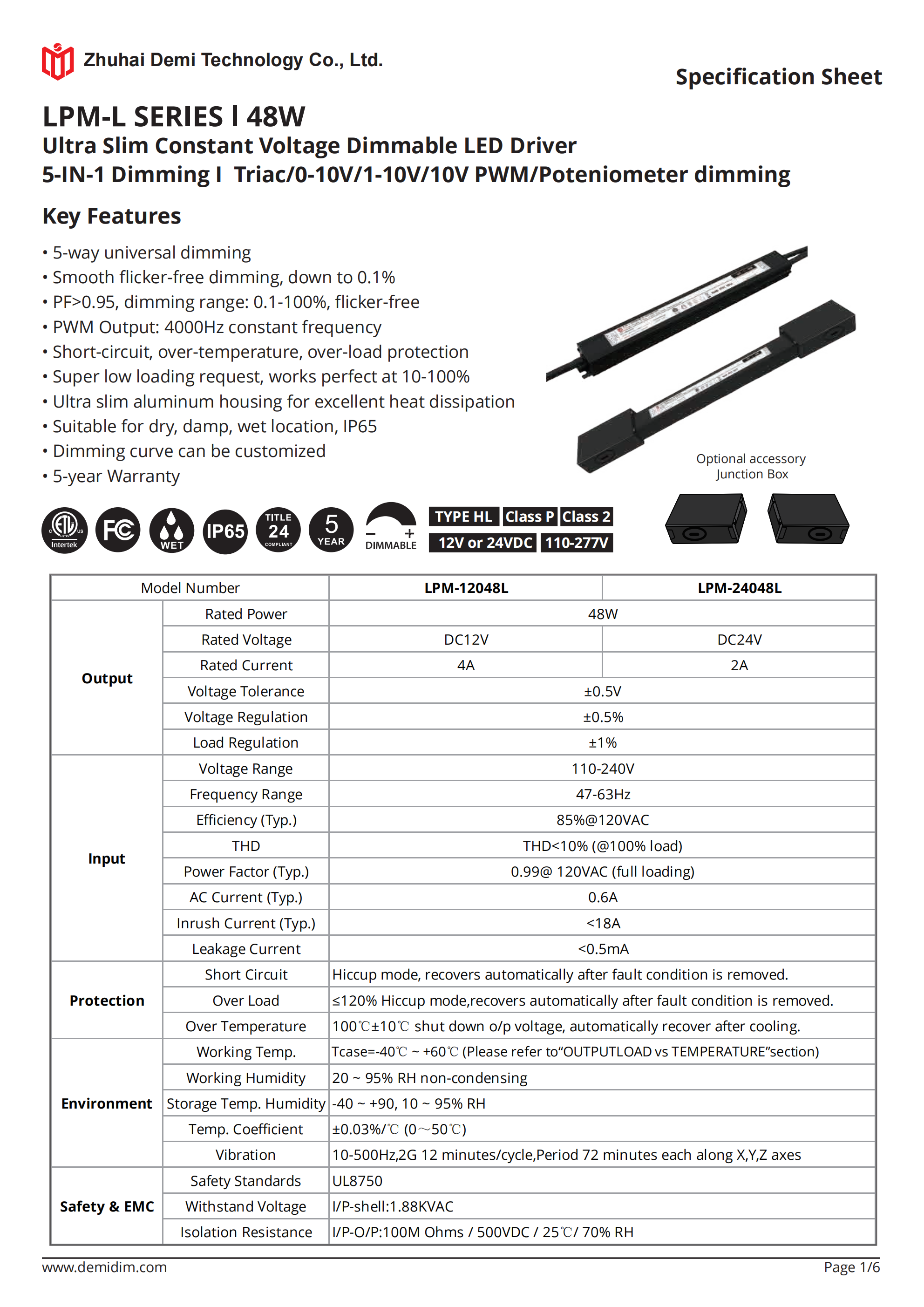 Item number: LPM-12048L,LPM-24048L Dim: Triac/0-10V/1-10V/10V PWM / Potentiometer Dimming method: PWM Input Voltage: 110-277V Output Voltage: 12V/24V PF: ≥0.9 Efficiency: ≥85% Warranty: 5 years. Protection: short circuit,overload,over-temperature, Certificate: ETL list Brand: DEMI