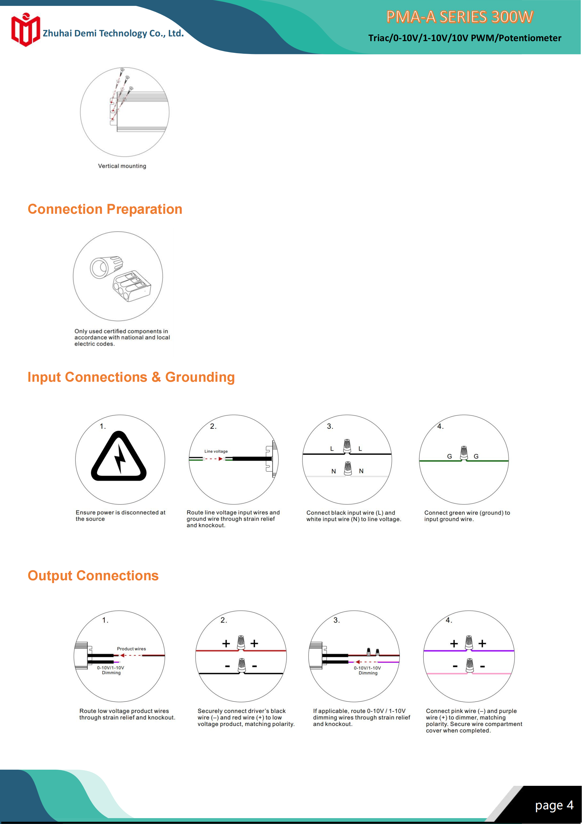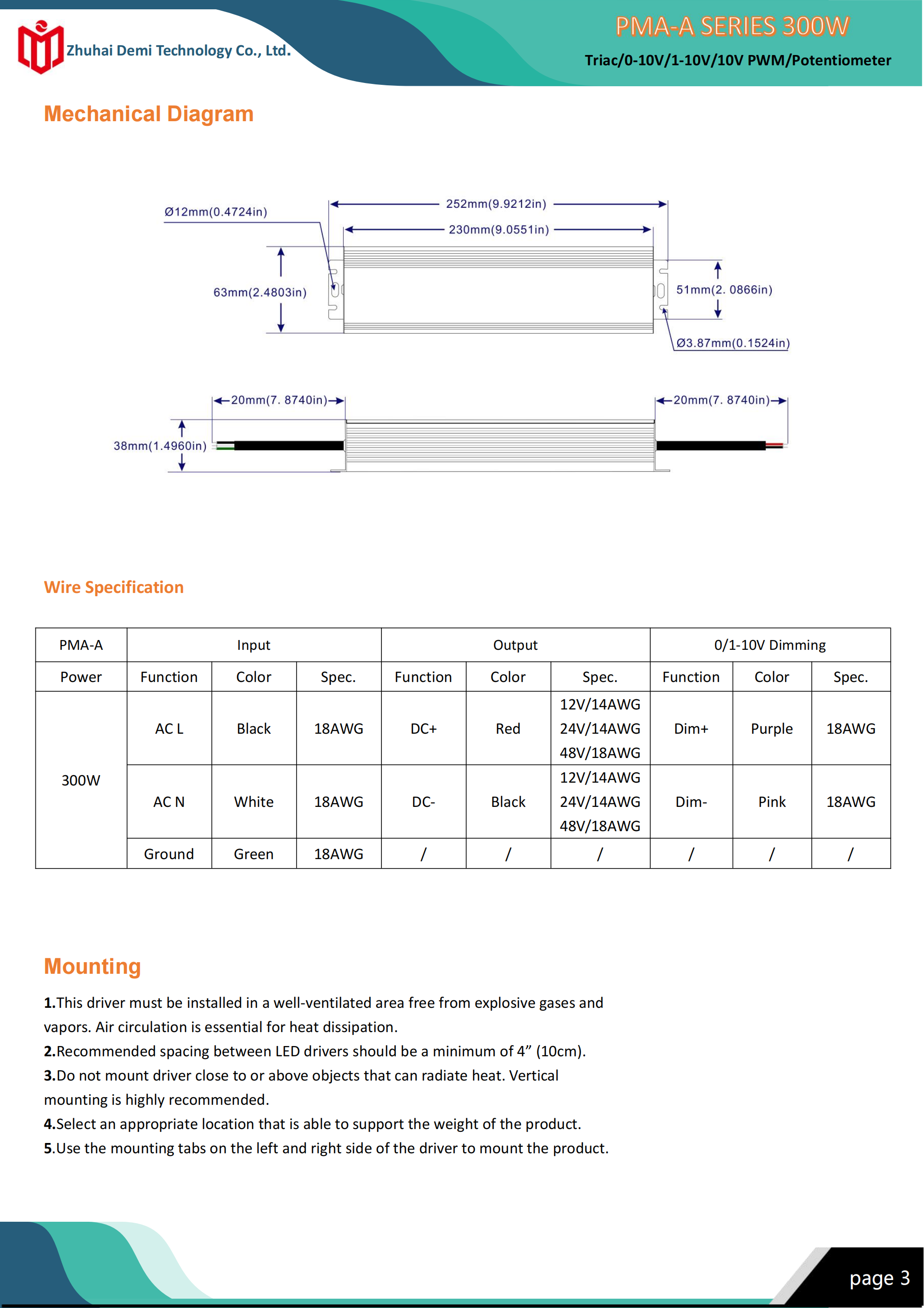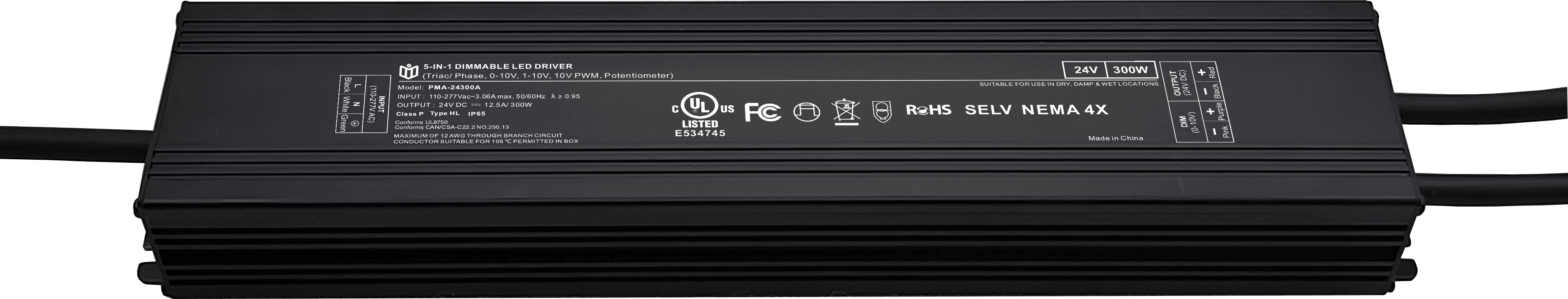 Item number:PMA-12300A PMA-24300A PMA-48300A Dim: Triac/0-10V/1-10V/10V PWM / Potentiometer Output Method: PWM Input Voltage: 110-277V Output Voltage: 12V/24V/48V PF: ≥0.9 Efficiency: ≥85% Warranty: 5 years. Protection: short circuit,overload,over-temperature, Certificate: UL list Brand: DEMI