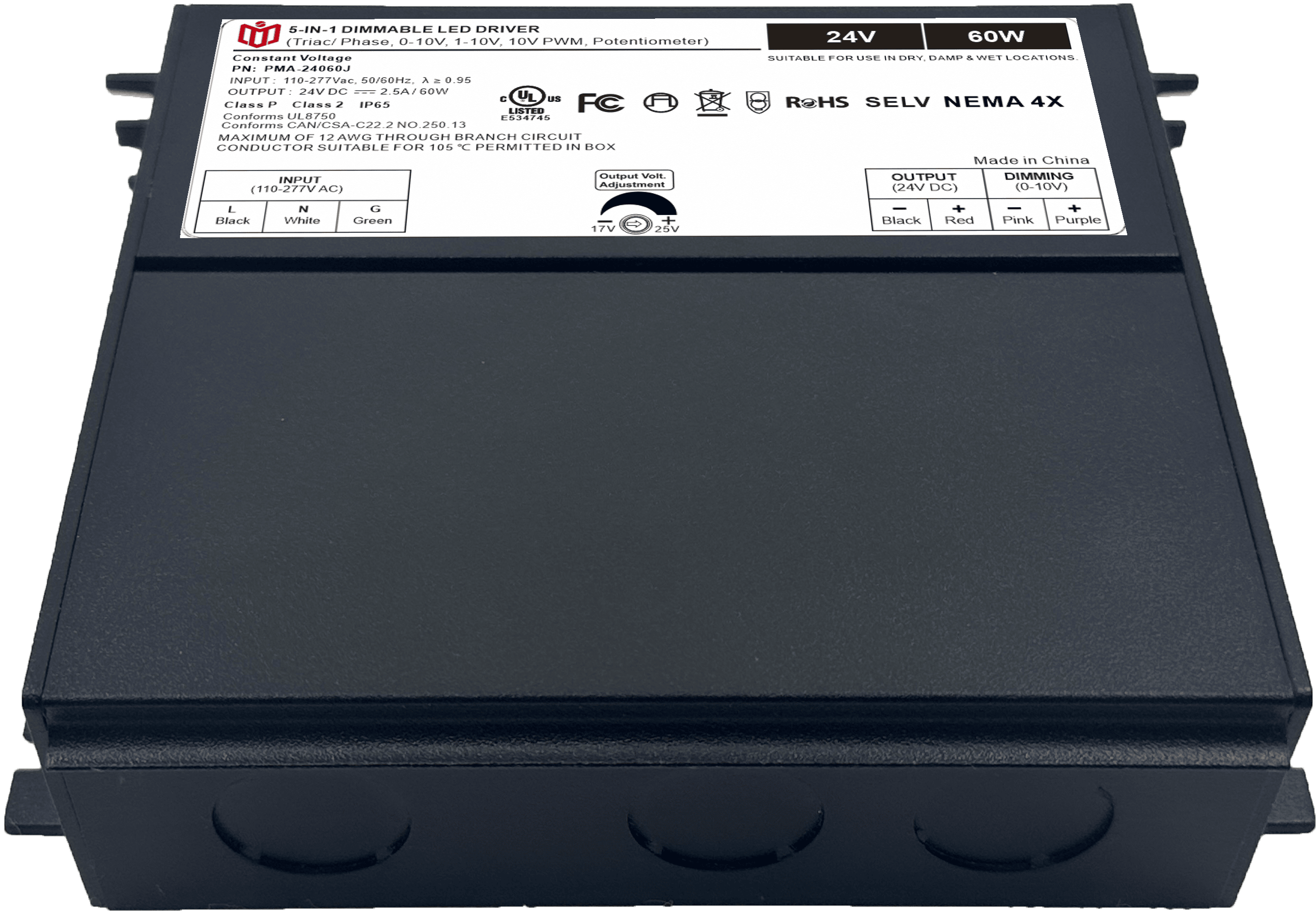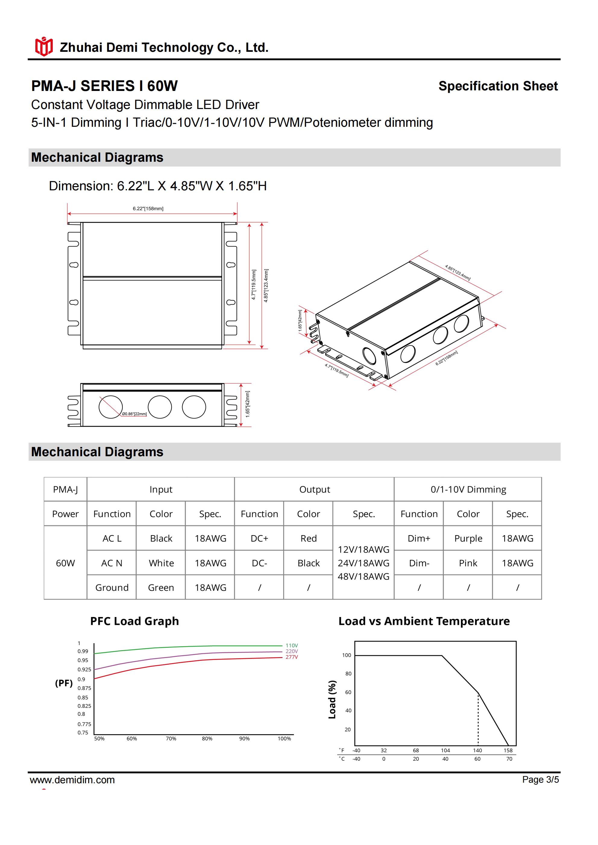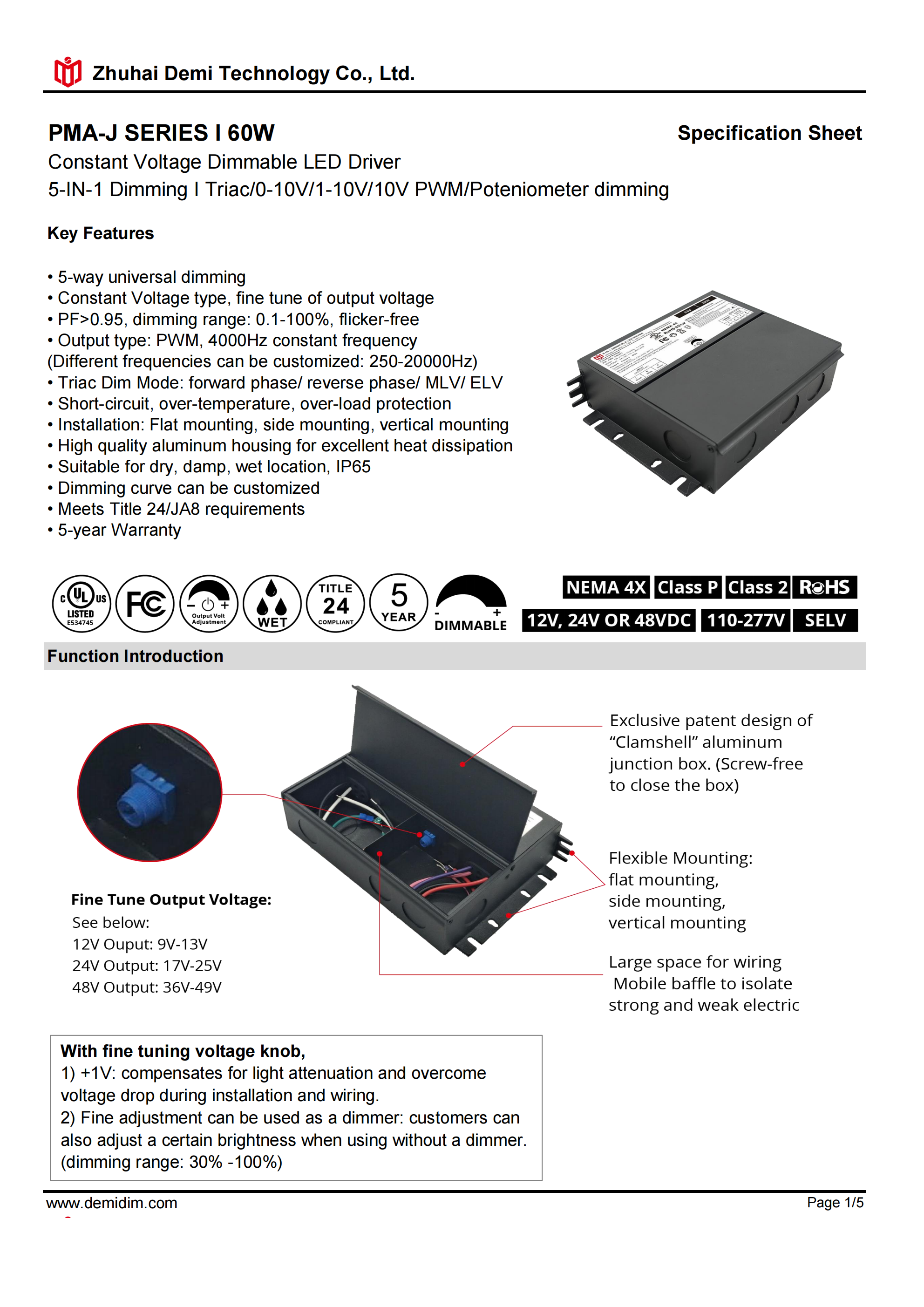 Item number: PMA-12060J,PMA-24060J,PMA-48060J, Type: Constant Voltage Dim: Triac/0-10V/1-10V/10V PWM / Potentiometer Output Method: PWM Input Voltage: 110-277V Output Voltage: 12V/24V/48V PF: ≥0.9 Efficiency: ≥87% Warranty: 5 years. Protection: short circuit,overload,over-temperature, Certificate: UL list Brand: DEMI