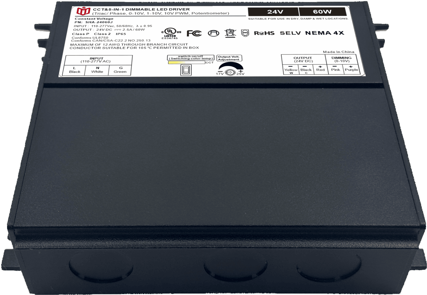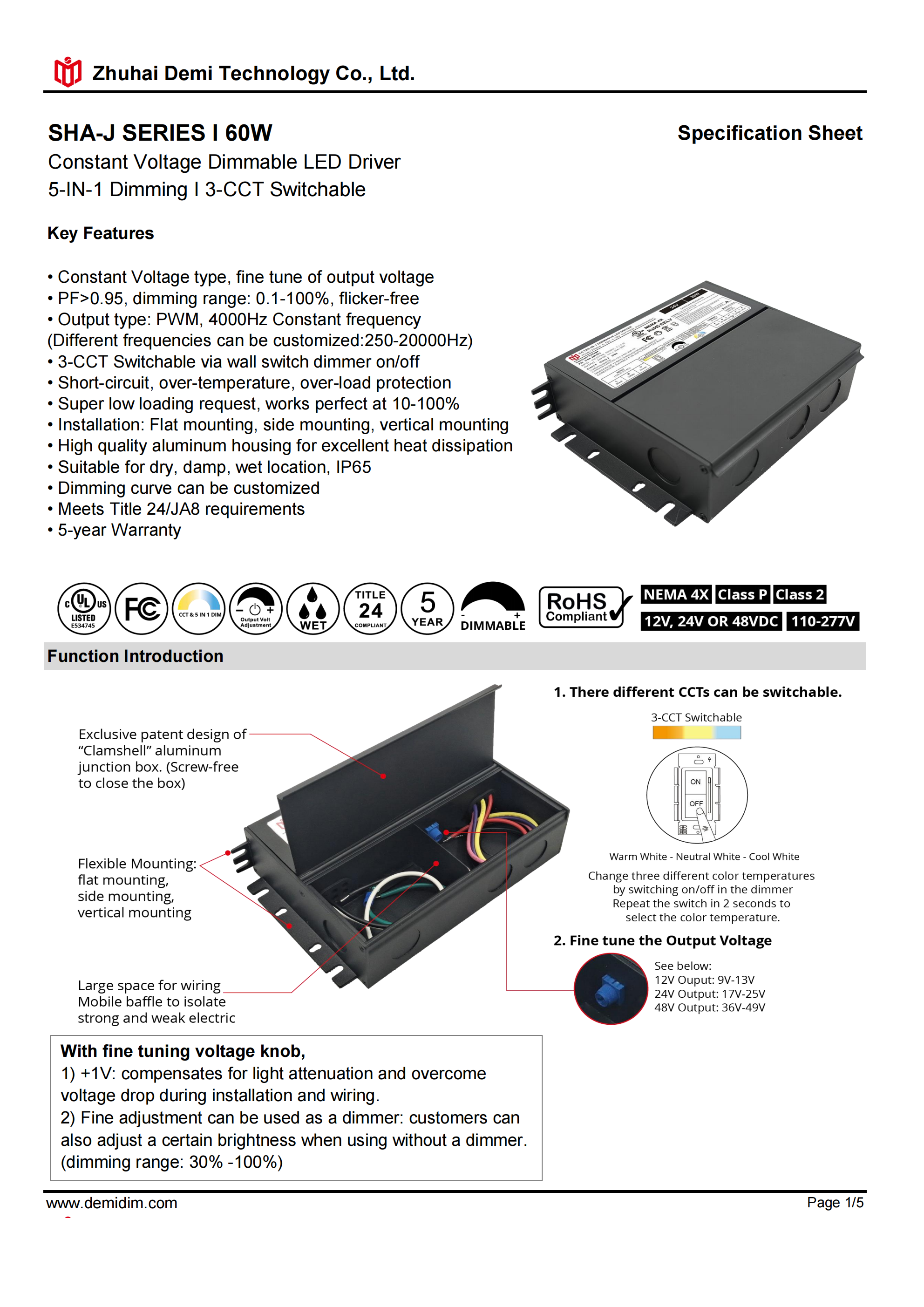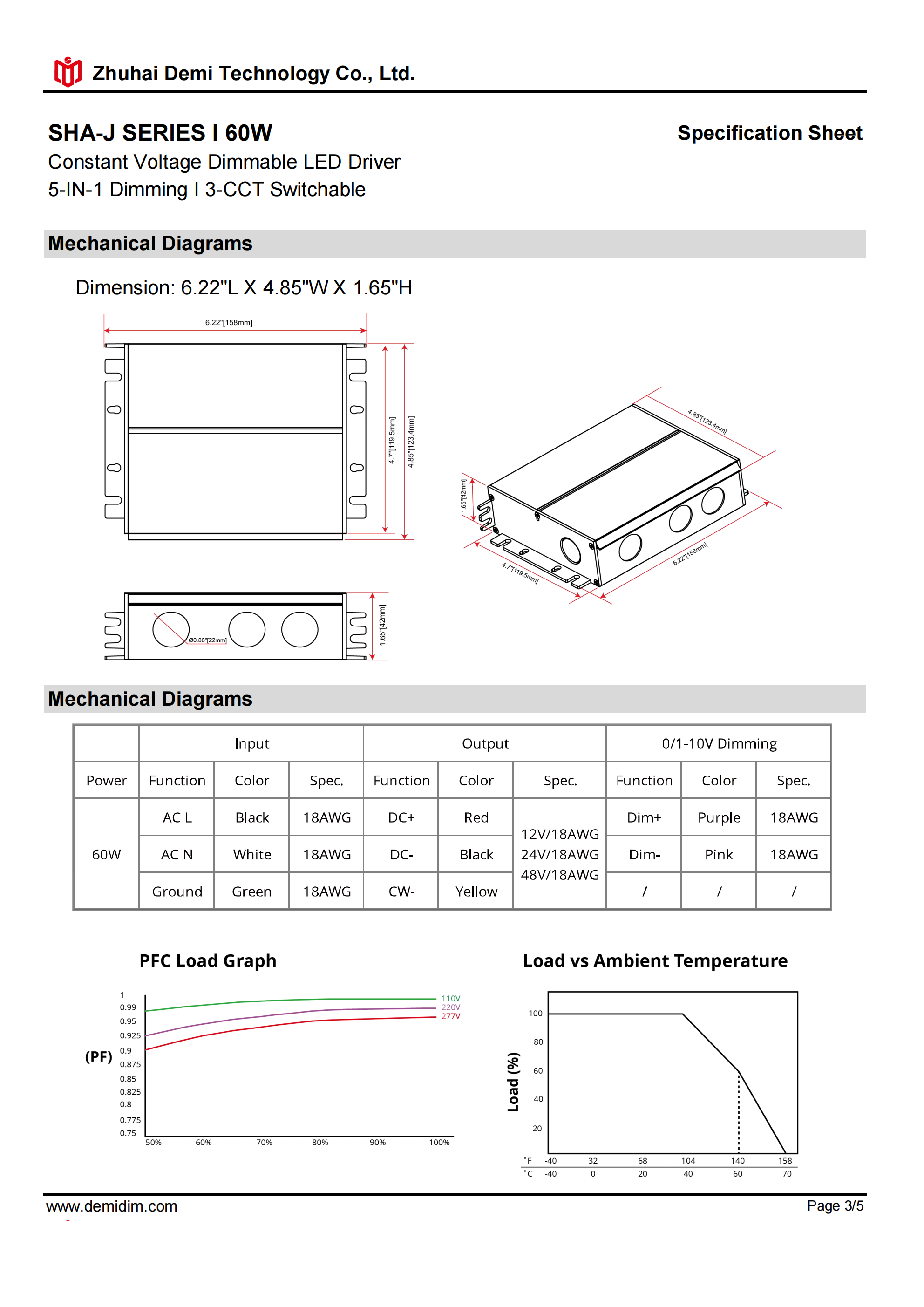 Item number: SHA-12060J,SHA-24060J,SHA-48060J Dim: Triac/0-10V/1-10V/10V PWM / Potentiometer Output Method: PWM Input Voltage: 110-277V Output Voltage: 12V/24V/48V PF: ≥0.9 Efficiency: ≥87% Warranty: 5 years. Protection: short circuit,overload,over-temperature, Certificate: UL list Brand: DEMI
