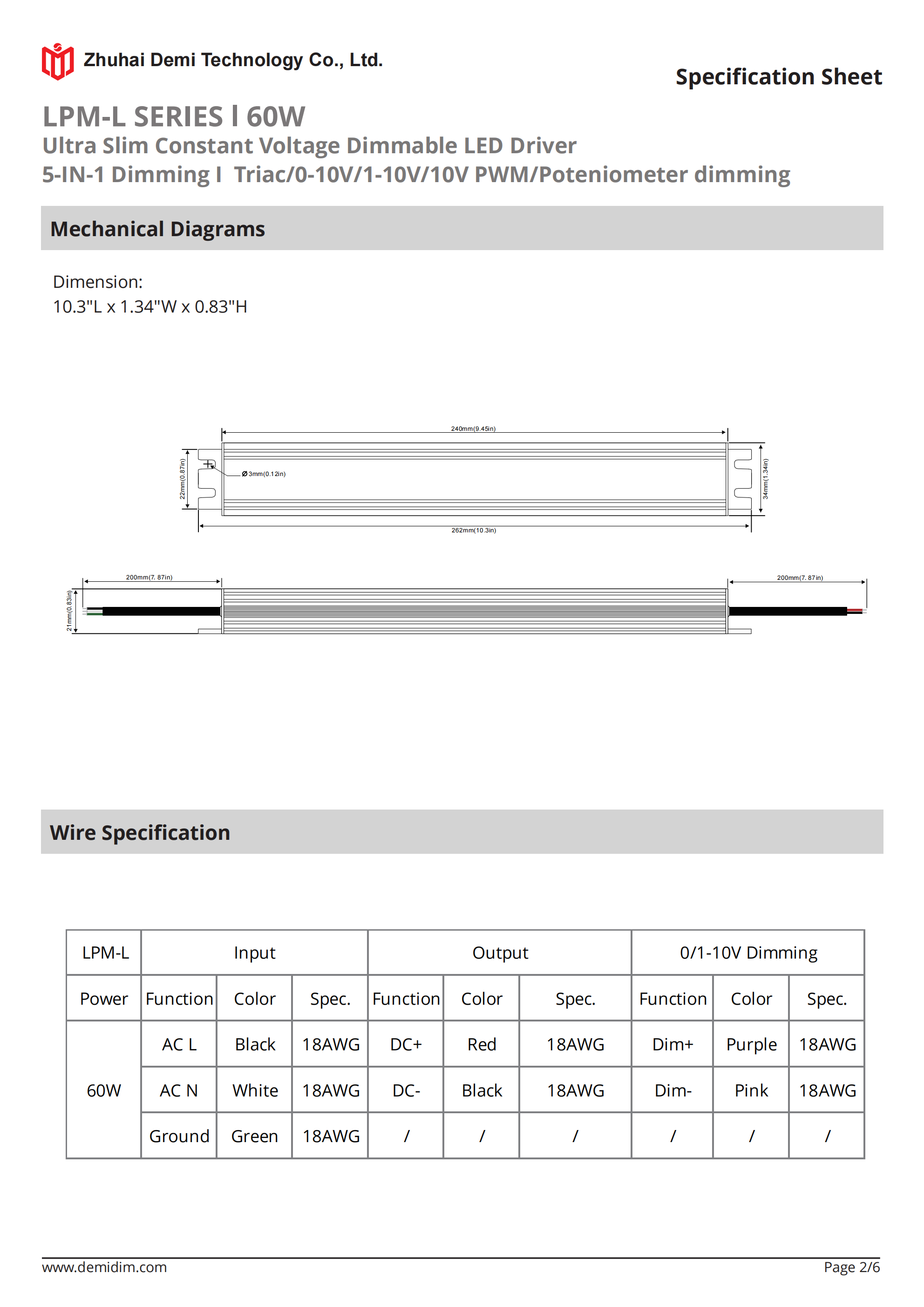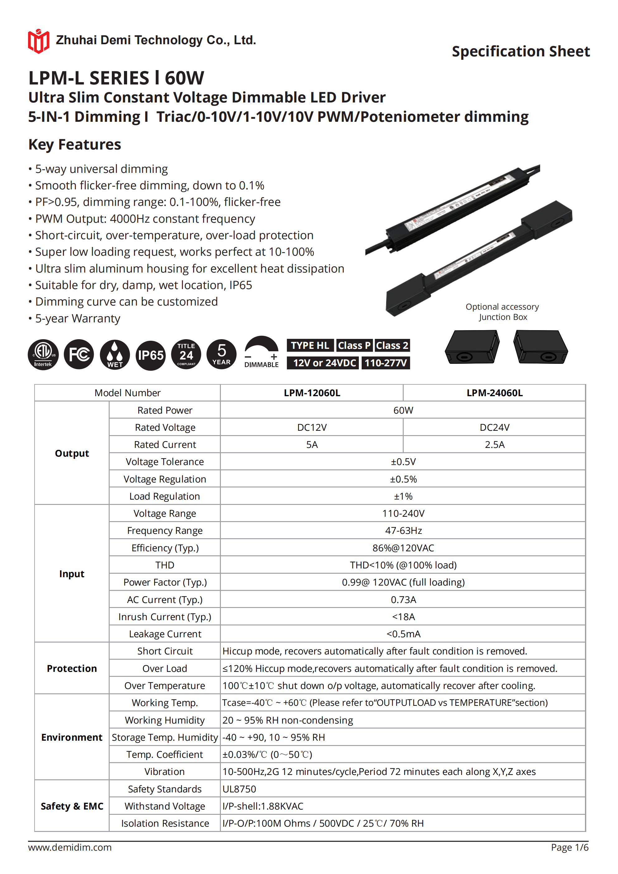 Item number: LPM-12060L,LPM-24060L Dim: Triac/0-10V/1-10V/10V PWM / Potentiometer Dimming method: PWM Input Voltage: 110-277V Output Voltage: 12V/24V PF: ≥0.9 Efficiency: ≥86% Warranty: 5 years. Protection: short circuit,overload,over-temperature, Certificate: ETL list Brand: DEMI