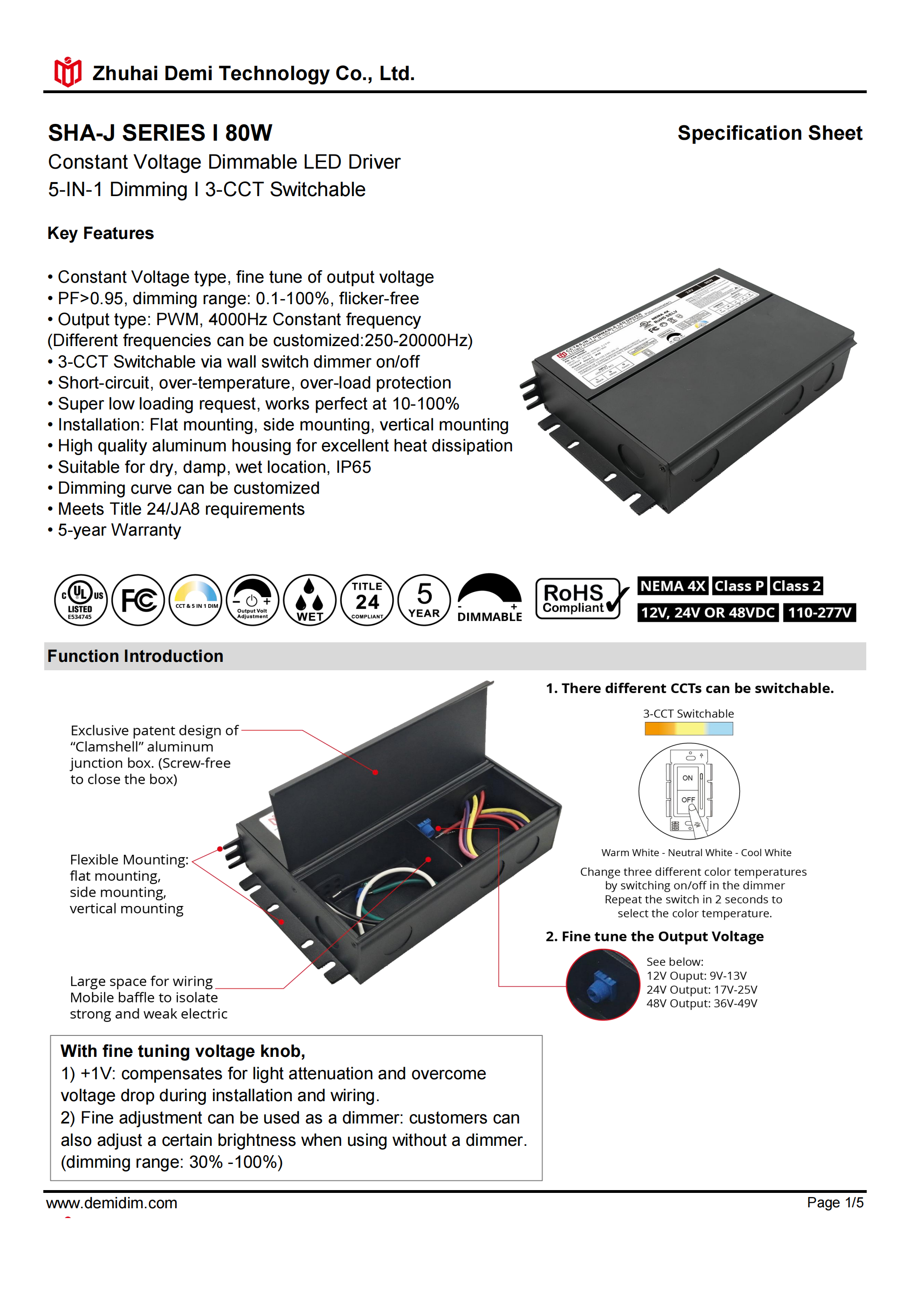 Item number: SHA-12080J,SHA-24080J,SHA-48080J Dim: Triac/0-10V/1-10V/10V PWM / Potentiometer Output Method: PWM Input Voltage: 110-277V Output Voltage: 12V/24V/48V PF: ≥0.9 Efficiency: ≥88% Warranty: 5 years. Protection: short circuit,overload,over-temperature, Certificate: UL list Brand: DEMI
