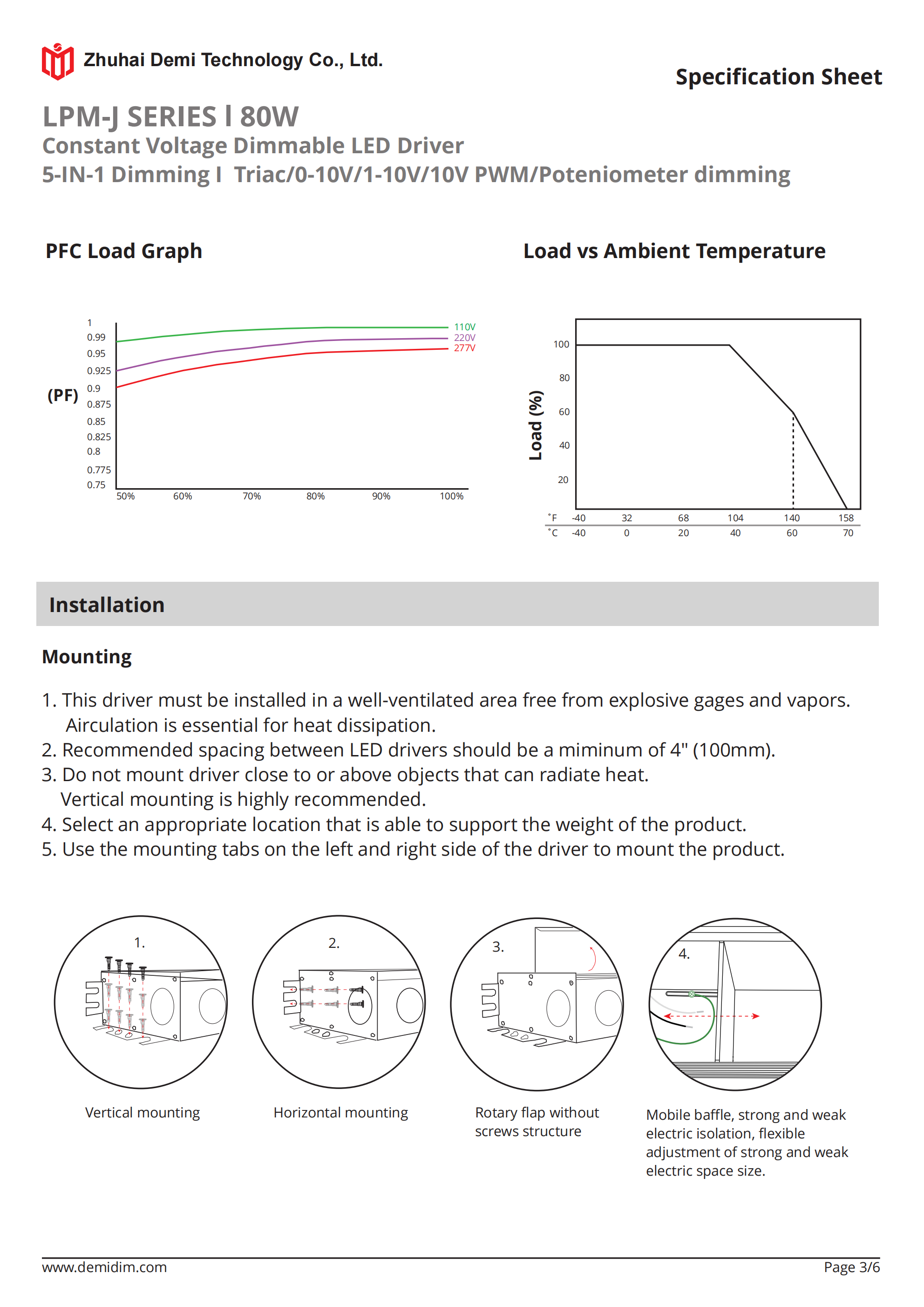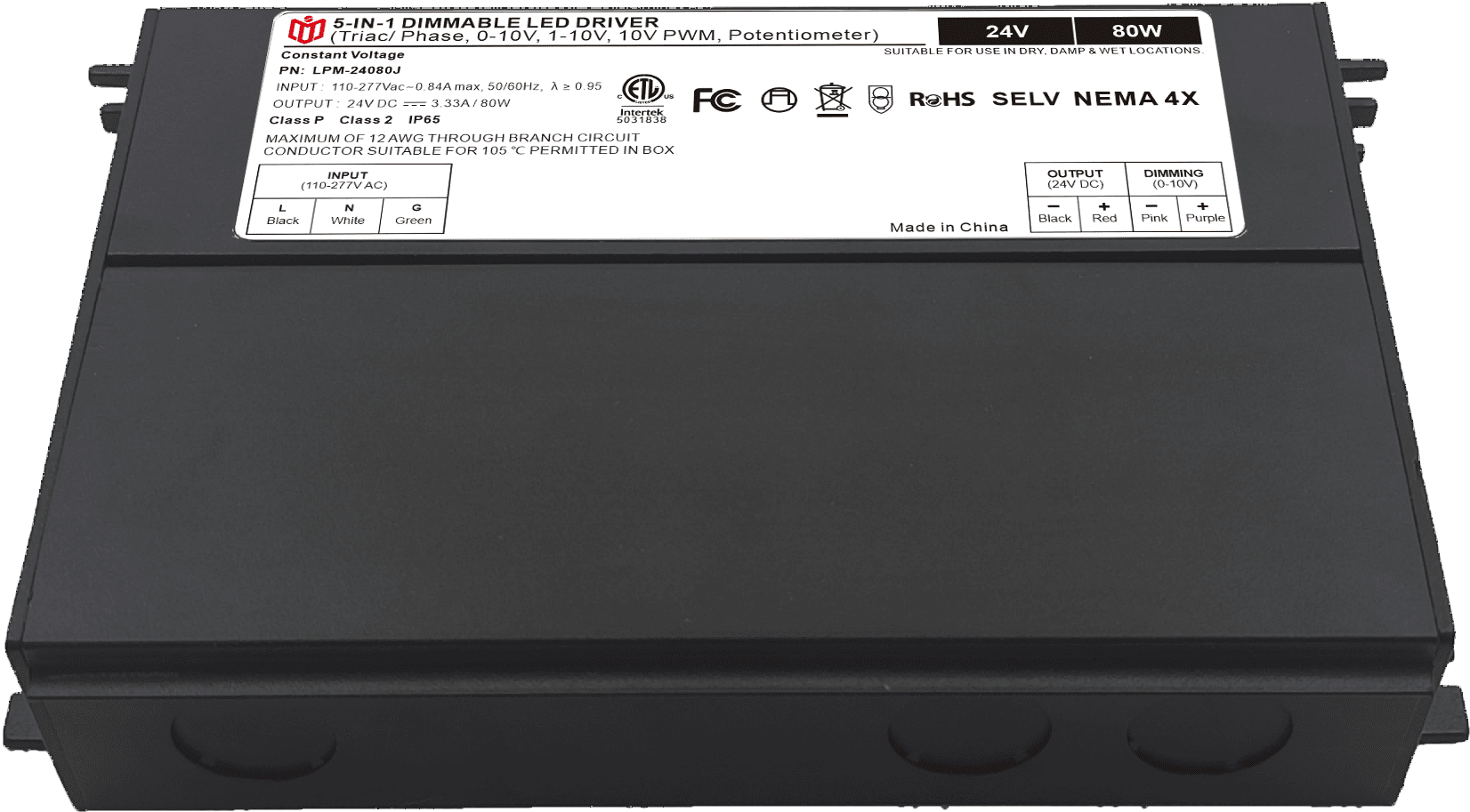 Item number: LPM-12080J,LPM-24080J Dim: Triac/0-10V/1-10V/10V PWM / Potentiometer Dimming method: PWM Input Voltage: 110-277V Output Voltage: 12V/24V PF: ≥0.9 Efficiency: ≥87% Warranty: 5 years. Protection: short circuit,overload,over-temperature, Certificate: ETL list Brand: DEMI