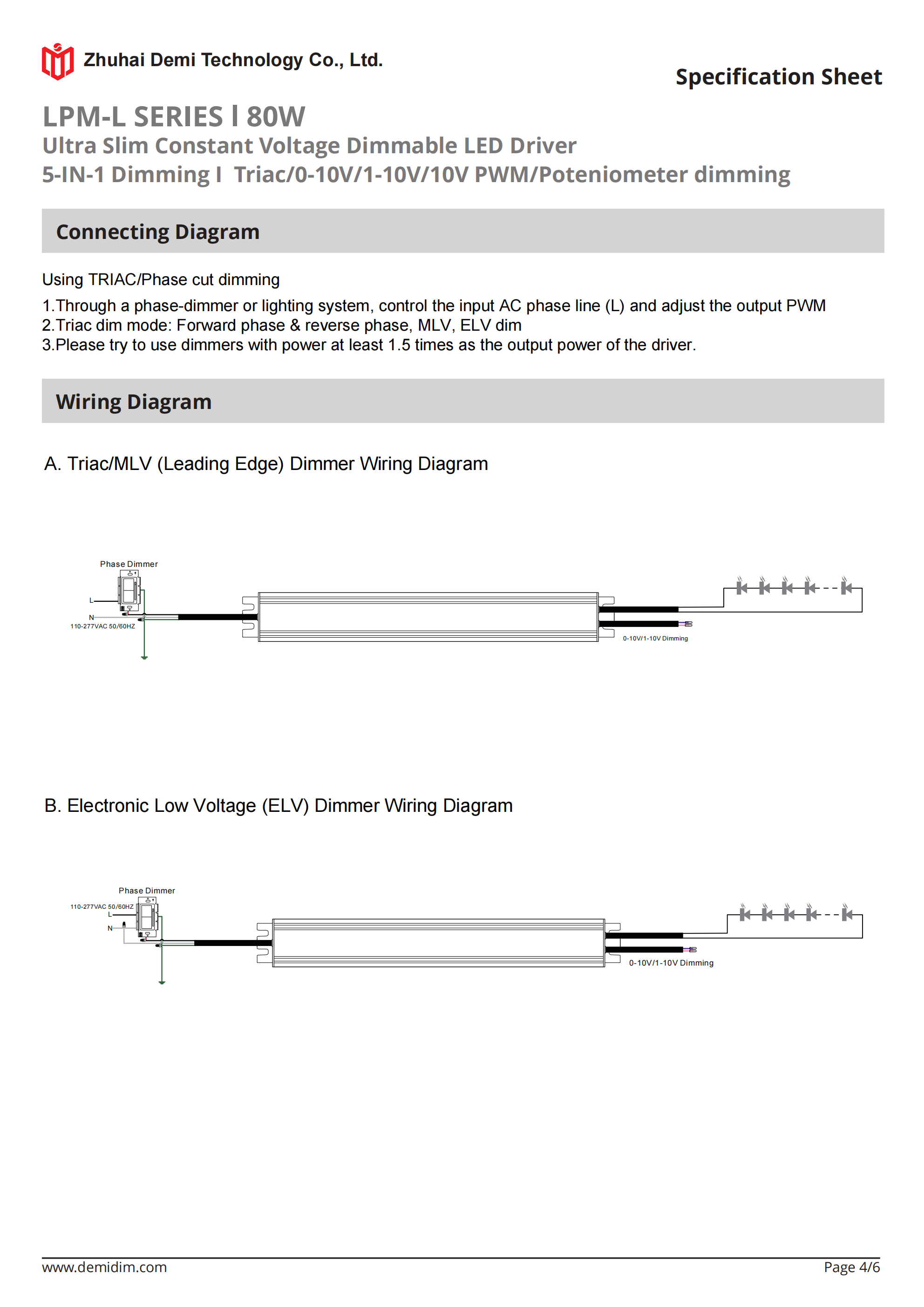 Item number: LPM-12080L,LPM-24080L Dim: Triac/0-10V/1-10V/10V PWM / Potentiometer Dimming method: PWM Input Voltage: 110-277V Output Voltage: 12V/24V PF: ≥0.9 Efficiency: ≥87% Warranty: 5 years. Protection: short circuit,overload,over-temperature, Certificate: ETL list Brand: DEMI