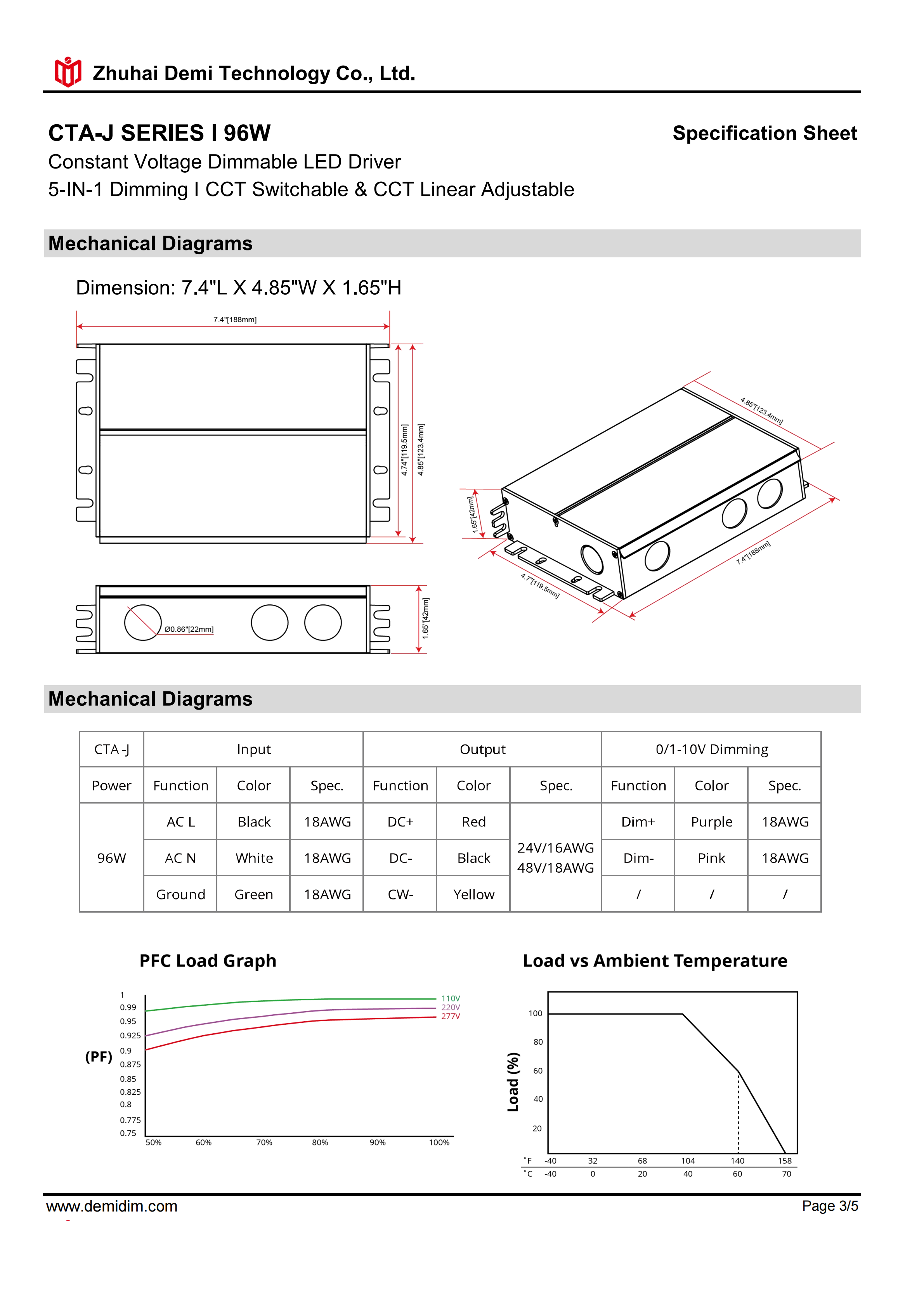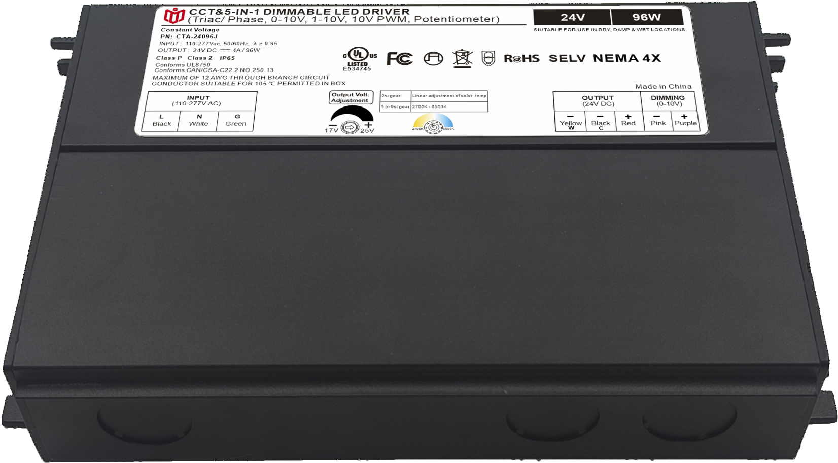 Item number: CTA-24096J,CTA-48096J Dim: Triac/0-10V/1-10V/10V PWM / Potentiometer Dimming method: PWM Input Voltage: 110-277V Output Voltage: 24V/48V PF: ≥0.9 Efficiency: ≥89% Protection: short circuit,overload,over-temperature, Certificate: UL list Brand: DEMI