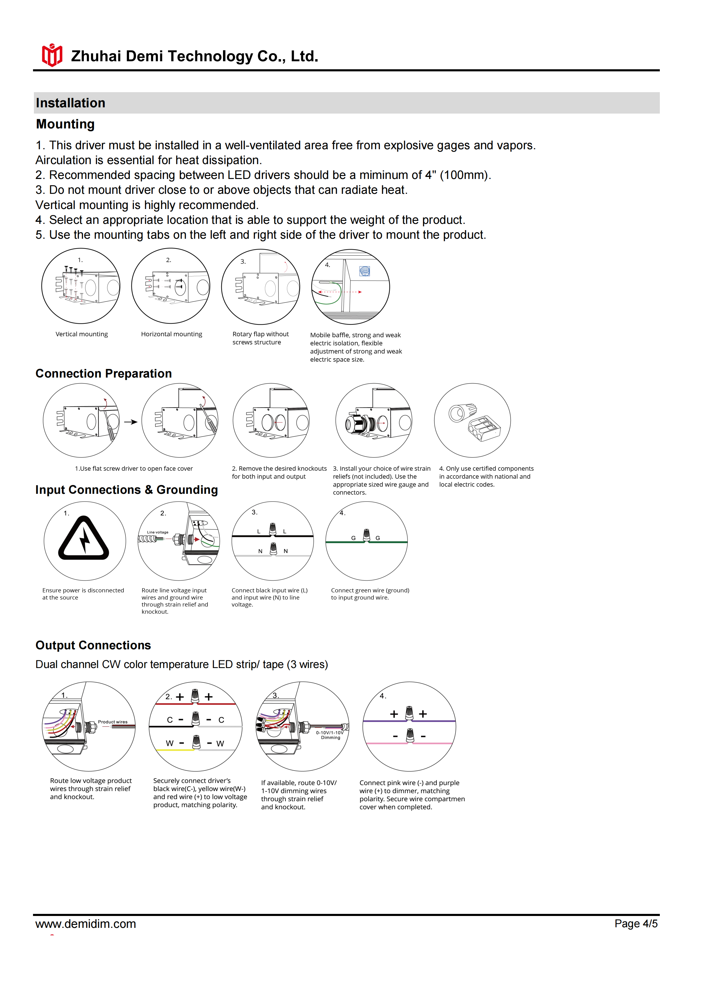 Item number: CTA-12300J,CTA-24300J,CTA-48300J Dim: Triac/0-10V/1-10V/10V PWM / Potentiometer Dimming method: PWM Input Voltage: 110-277V Output Voltage: 12V/24V/48V PF: ≥0.9 Efficiency: ≥90% Protection: short circuit,overload,over-temperature, Certificate: UL list Brand: DEMI Item number: CTA-H12120J,CTA-H24120J,CTA-48192J Dim: Triac/0-10V/1-10V/10V PWM / Potentiometer Dimming method: PWM Input Voltage: 110-277V Output Voltage: 12V/24V/48V PF: ≥0.9 Efficiency: ≥91% Protection: short circuit,overload,over-temperature, Certificate: UL list Brand: DEM