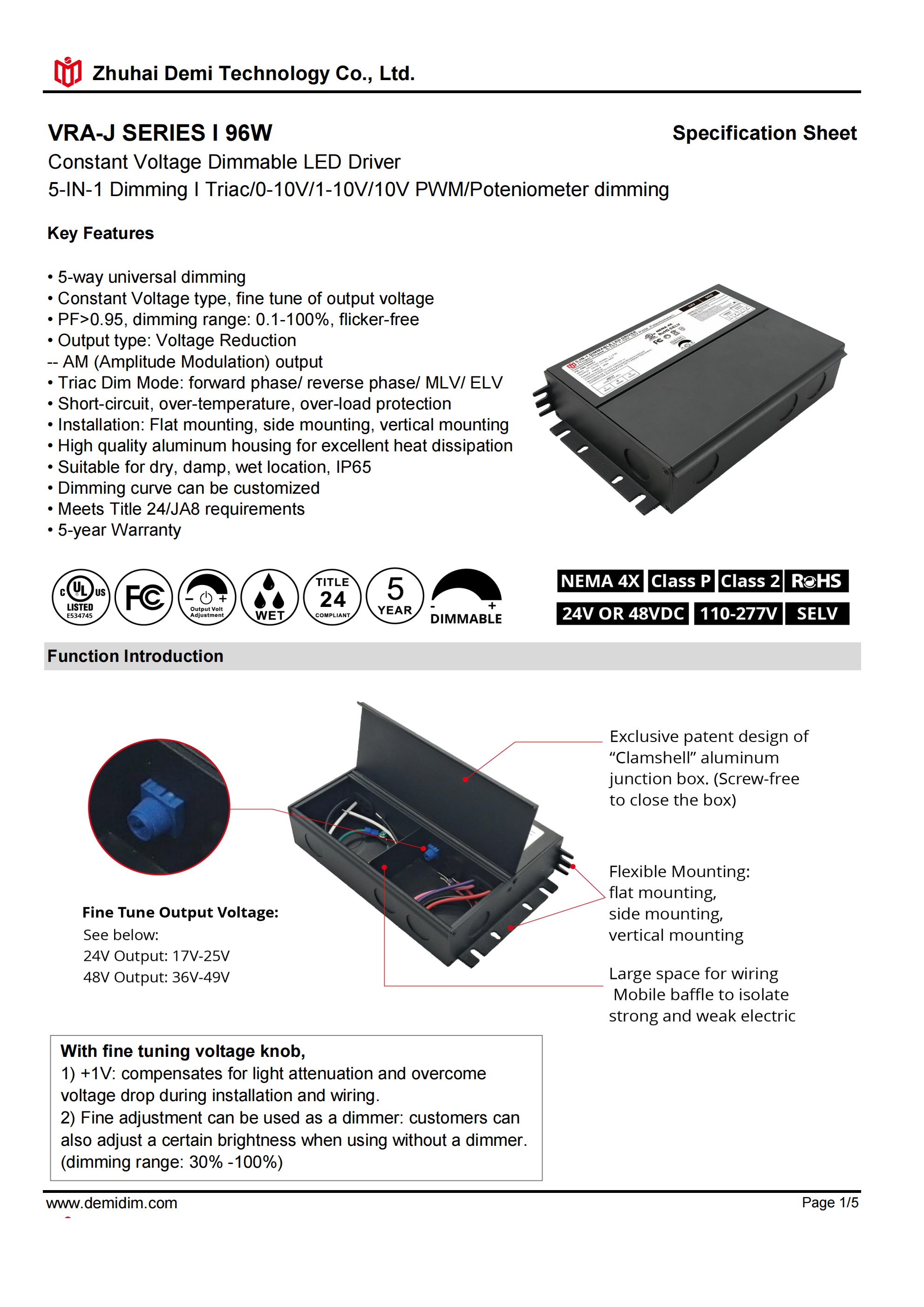 Item number: VRA-24096J,VRA-48096J Type : Constant voltage Dimming Mode: Triac/0-10V/1-10V/10V PWM / Potentiometer Output Method: Amplitude Modulation Input Voltage: 110-277V Output Voltage: 24V/48V PF: ≥0.9 Efficiency: ≥89% Warranty: 5 years. Protection: short circuit,overload,over-temperature, Certificate: UL list Brand: DEMI