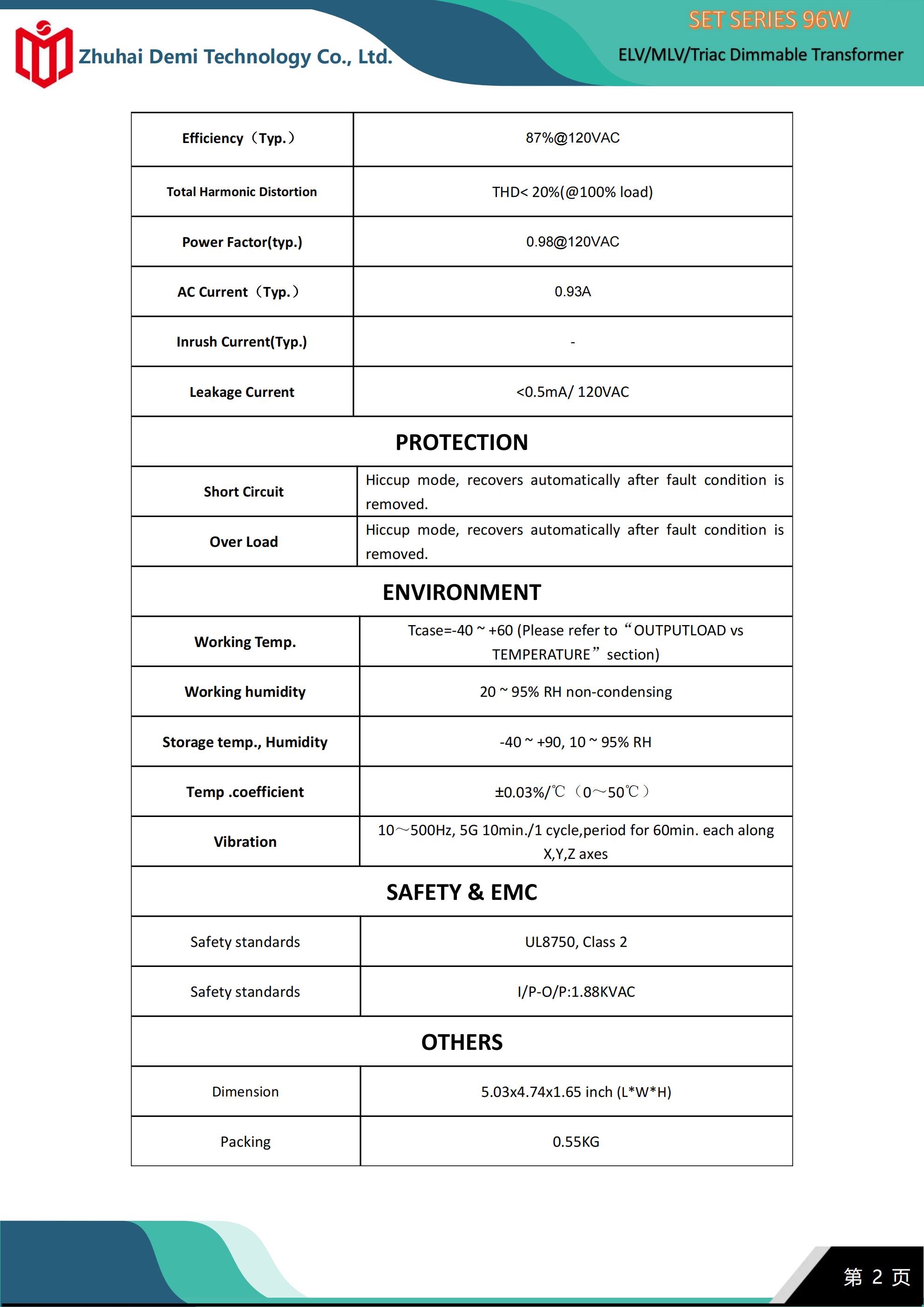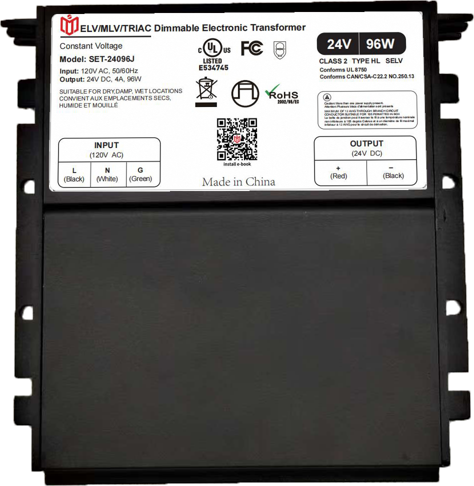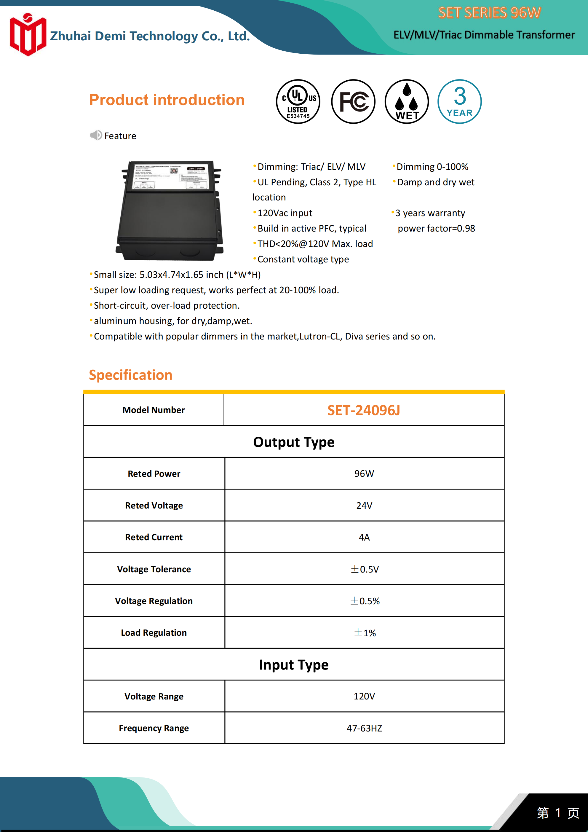 Item number: SET-24096J Dim: Triac/ELV/MLV Input Voltage: 120V Output Voltage: 24V PF: ≥0.9 Efficiency: ≥87% Warranty: 3 years. Protection: short circuit,overload,over-temperature, Certificate: UL list Brand: DEMI