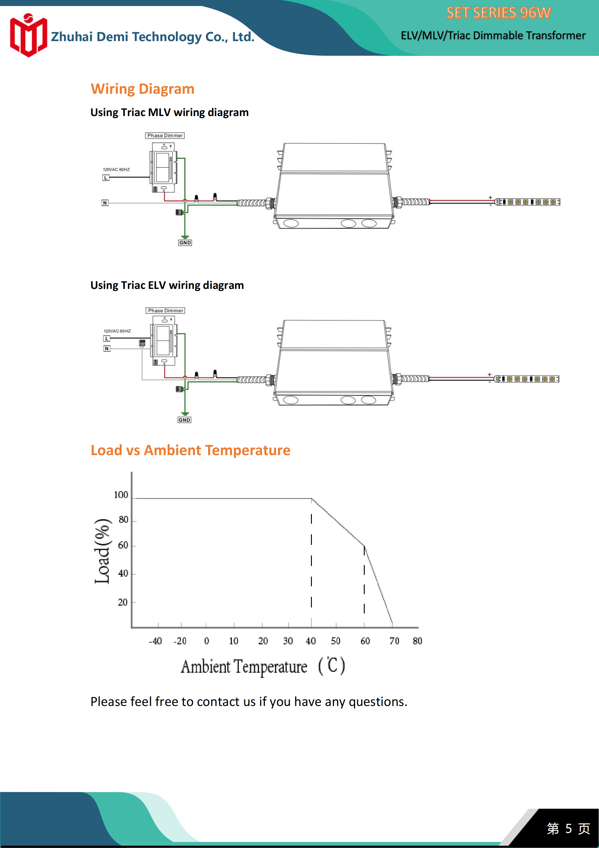 Item number: SET-12060J,SET-24060J Dim: Triac/ELV/MLV Input Voltage: 120V Output Voltage: 12V/24V PF: ≥0.9 Efficiency: ≥87% Warranty: 3 years. Protection: short circuit,overload,over-temperature, Certificate: UL list Brand: DEMI