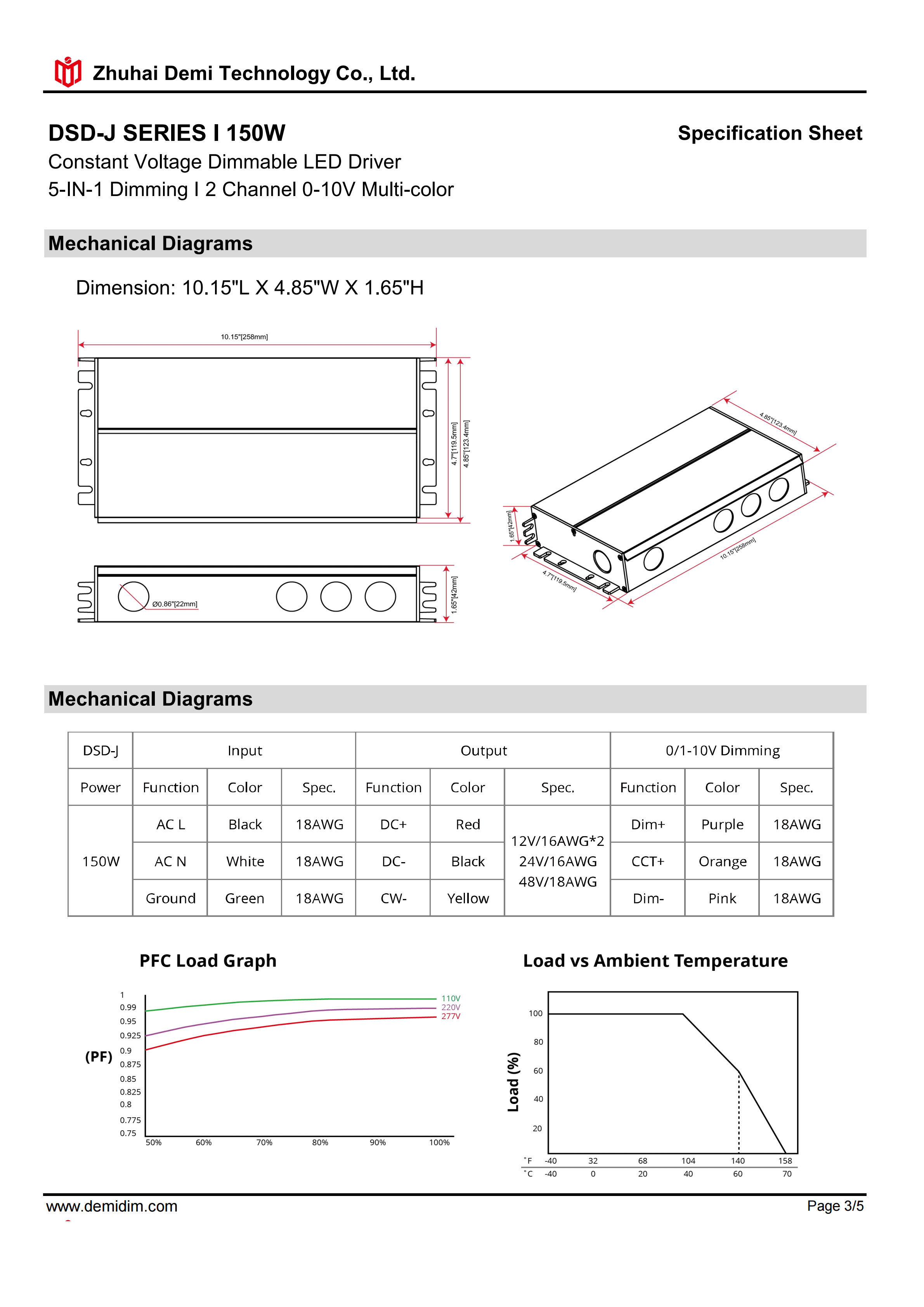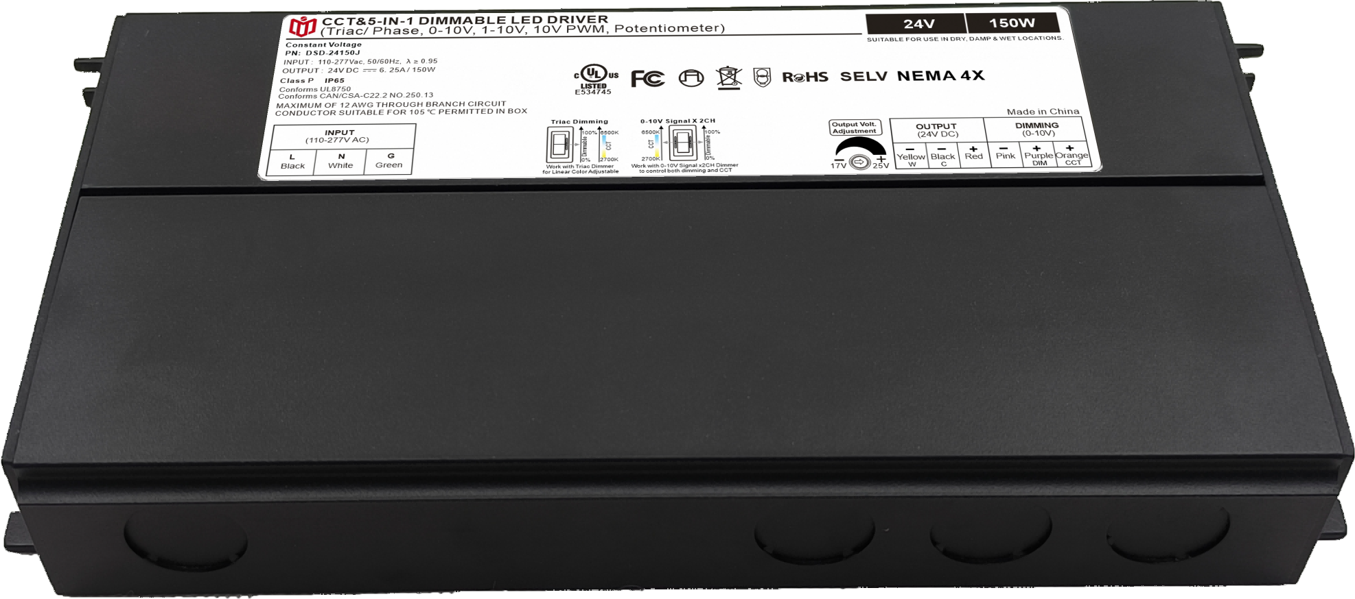 Item number: DSD-12150J,DSD-24150J,DSD-48150J Dim: Triac/0-10V/1-10V/10V PWM / Potentiometer Dimming method: PWM Input Voltage: 110-277V Output Voltage: 12V/24V/48V PF: ≥0.9 Efficiency: ≥90% Protection: short circuit,overload,over-temperature, Certificate: UL list Brand: DEMI