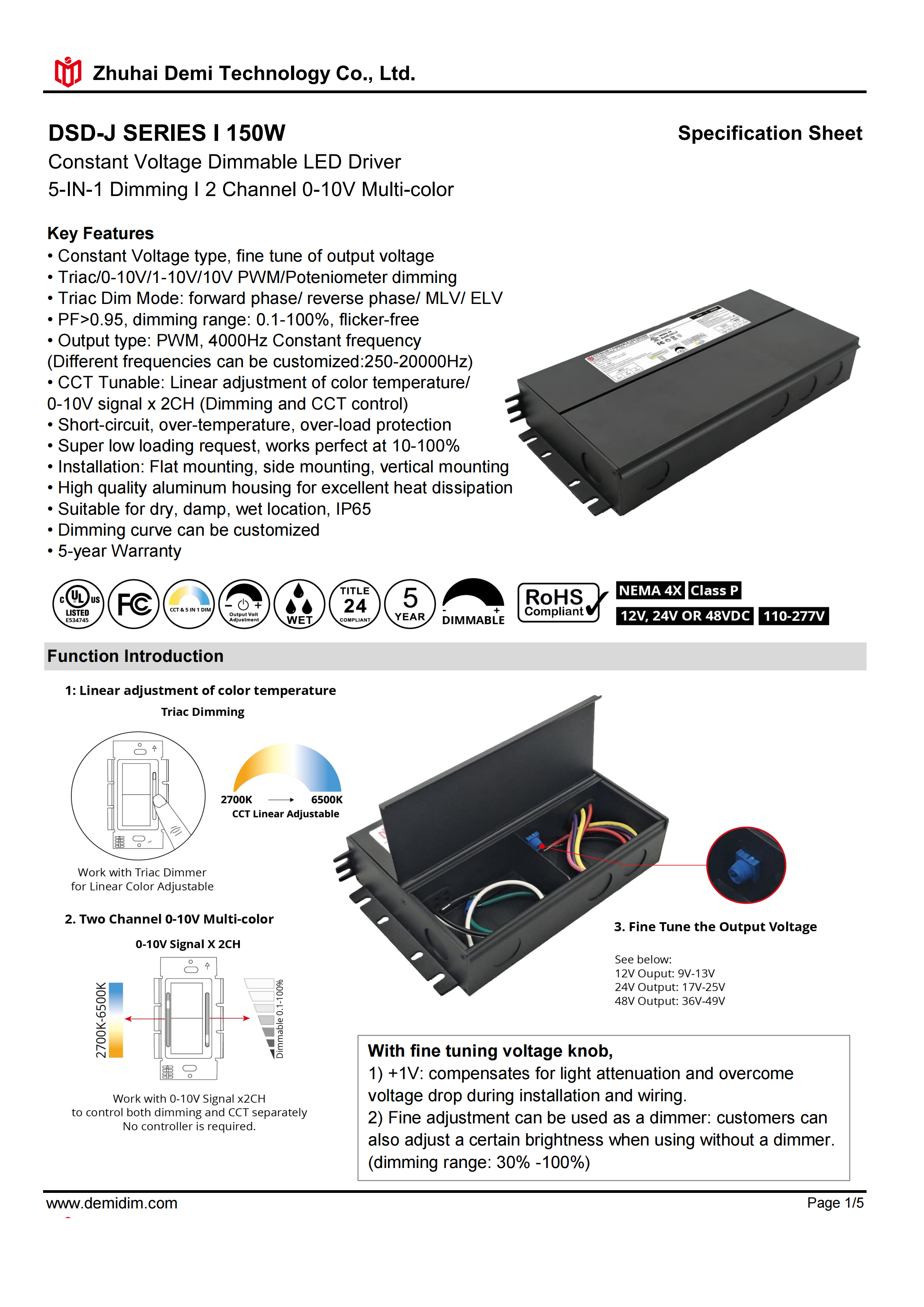 Item number: DSD-H12120J,DSD-H24120J Dim: Triac/0-10V/1-10V/10V PWM / Potentiometer Dimming method: PWM Input Voltage: 110-277V Output Voltage: 12V/24V PF: ≥0.9 Efficiency: ≥90% Protection: short circuit,overload,over-temperature, Certificate: UL list Brand: DEMI