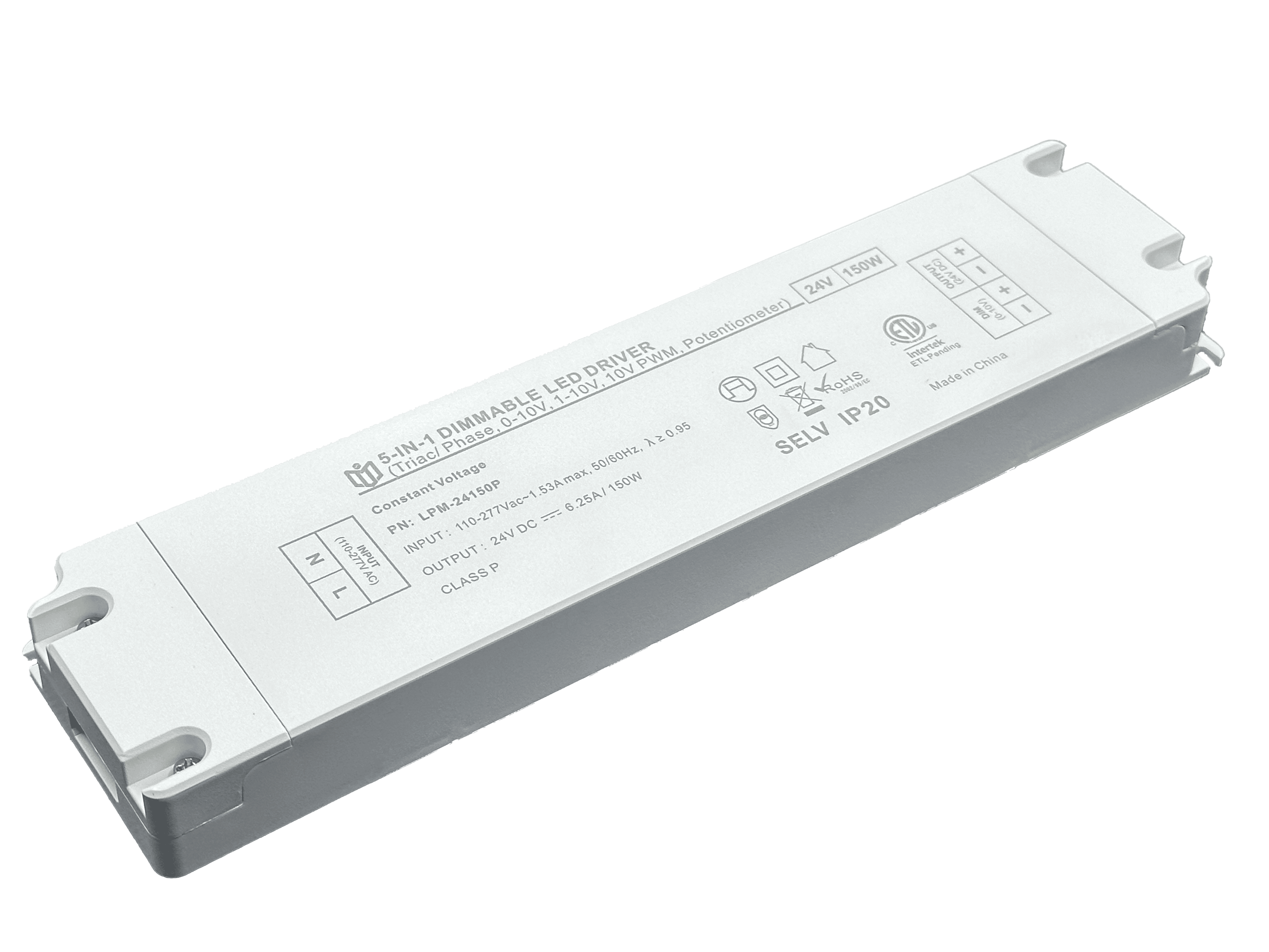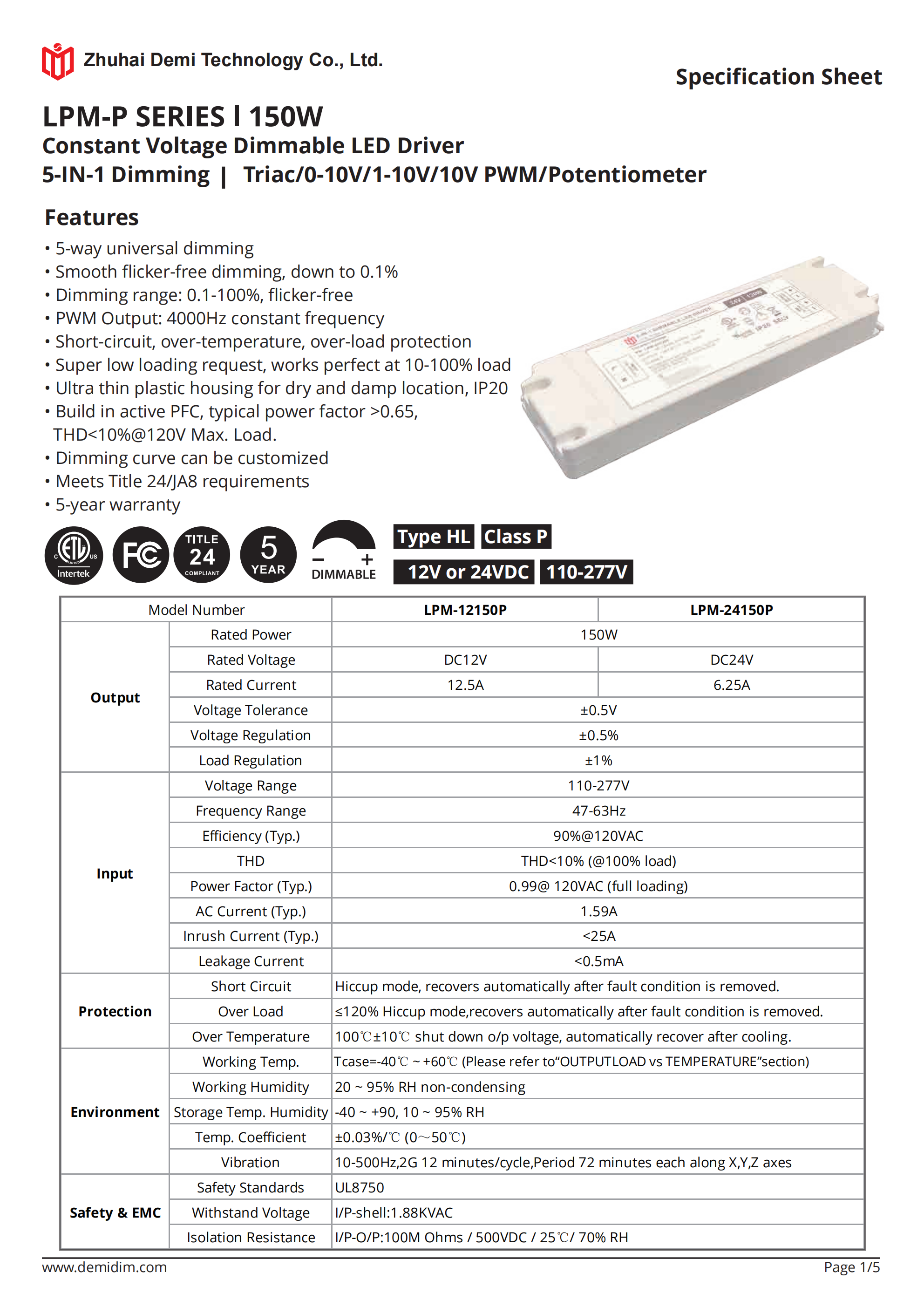 Item number: LPM-12150P,LPM-24150P Dim: Triac/0-10V/1-10V/10V PWM / Potentiometer Dimming method: PWM Input Voltage: 110-277V Output Voltage: 12V/24V PF: ≥0.9 Efficiency: ≥90% Warranty: 5 years. Protection: short circuit,overload,over-temperature, Certificate: ETL Brand: DEMI