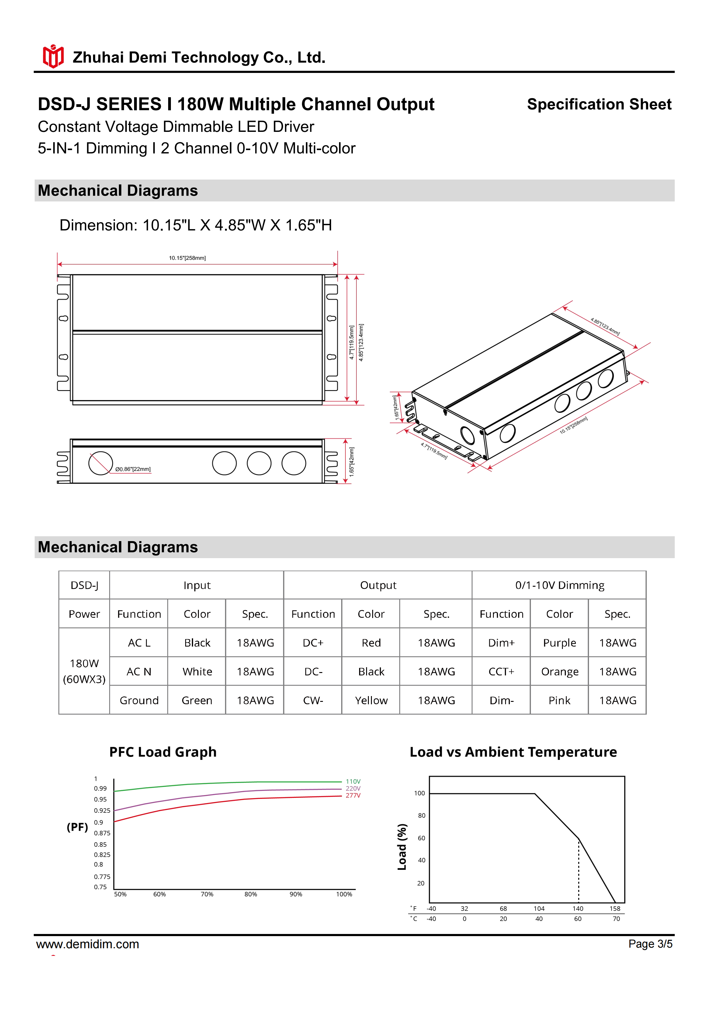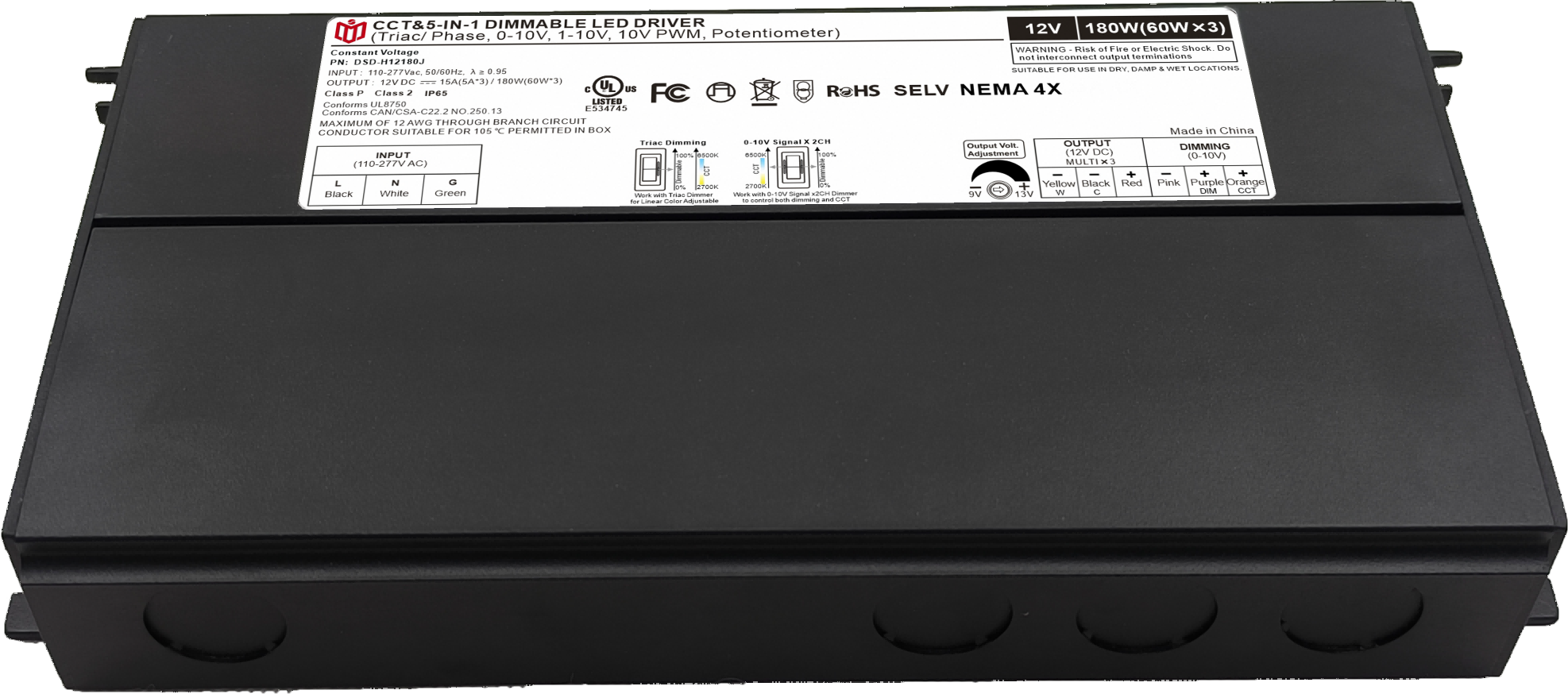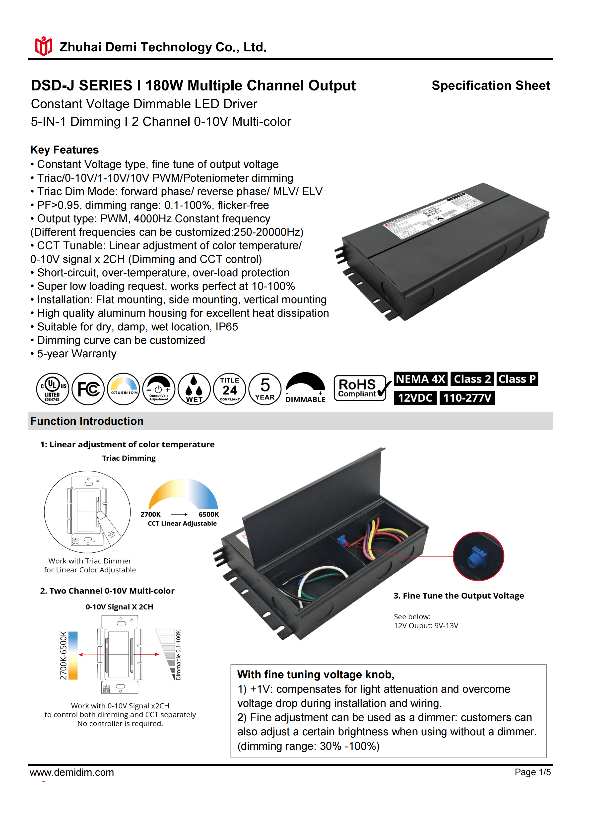 Item number: DSD-H12180J Dim: Triac/0-10V/1-10V/10V PWM / Potentiometer Dimming method: PWM Input Voltage: 110-277V Output Voltage: 12V PF: ≥0.9 Efficiency: ≥90% Protection: short circuit,overload,over-temperature, Certificate: UL list Brand: DEMI