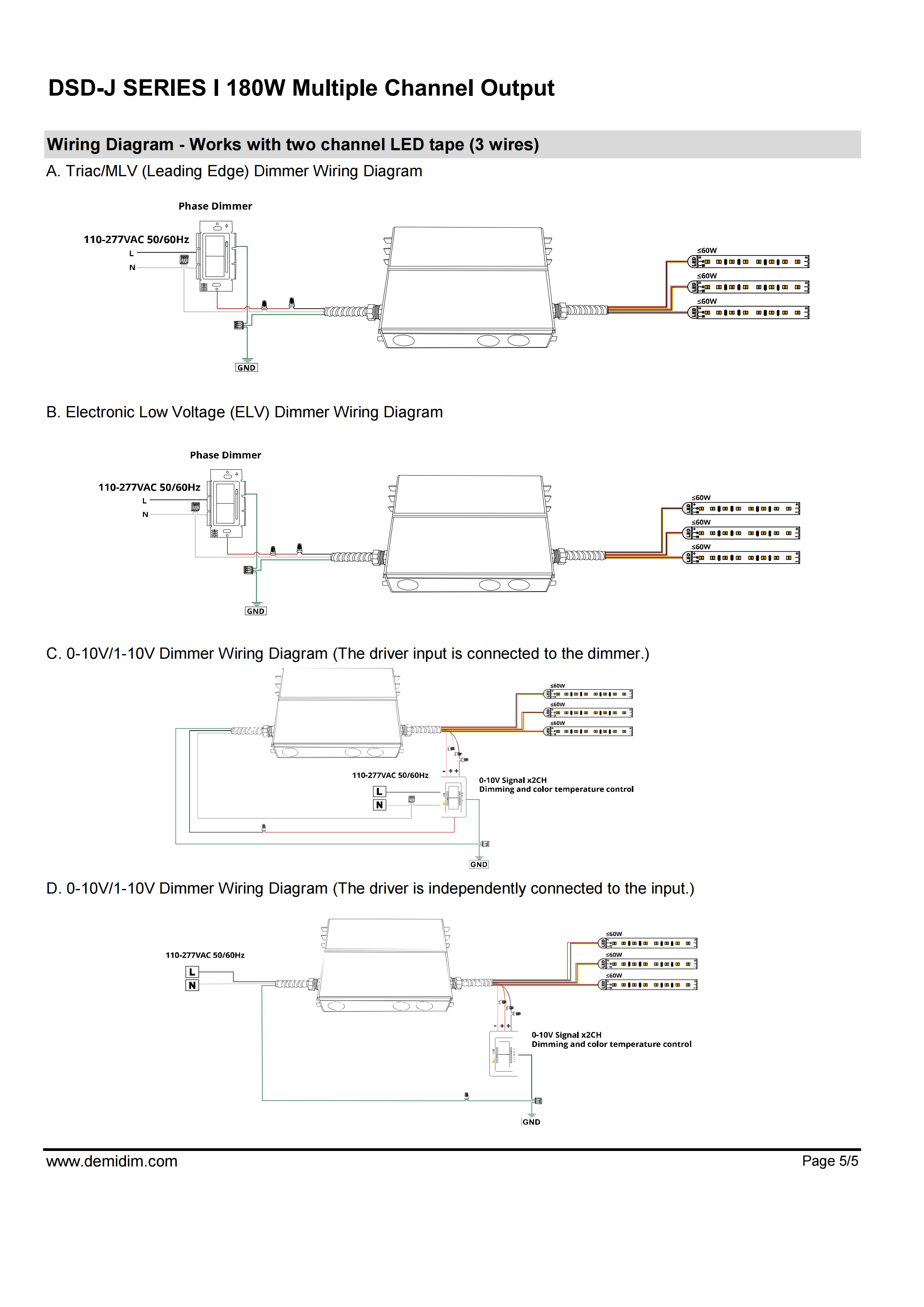 Item number: DSD-H12120J,DSD-H24120J Dim: Triac/0-10V/1-10V/10V PWM / Potentiometer Dimming method: PWM Input Voltage: 110-277V Output Voltage: 12V/24V PF: ≥0.9 Efficiency: ≥90% Protection: short circuit,overload,over-temperature, Certificate: UL list Brand: DEMI