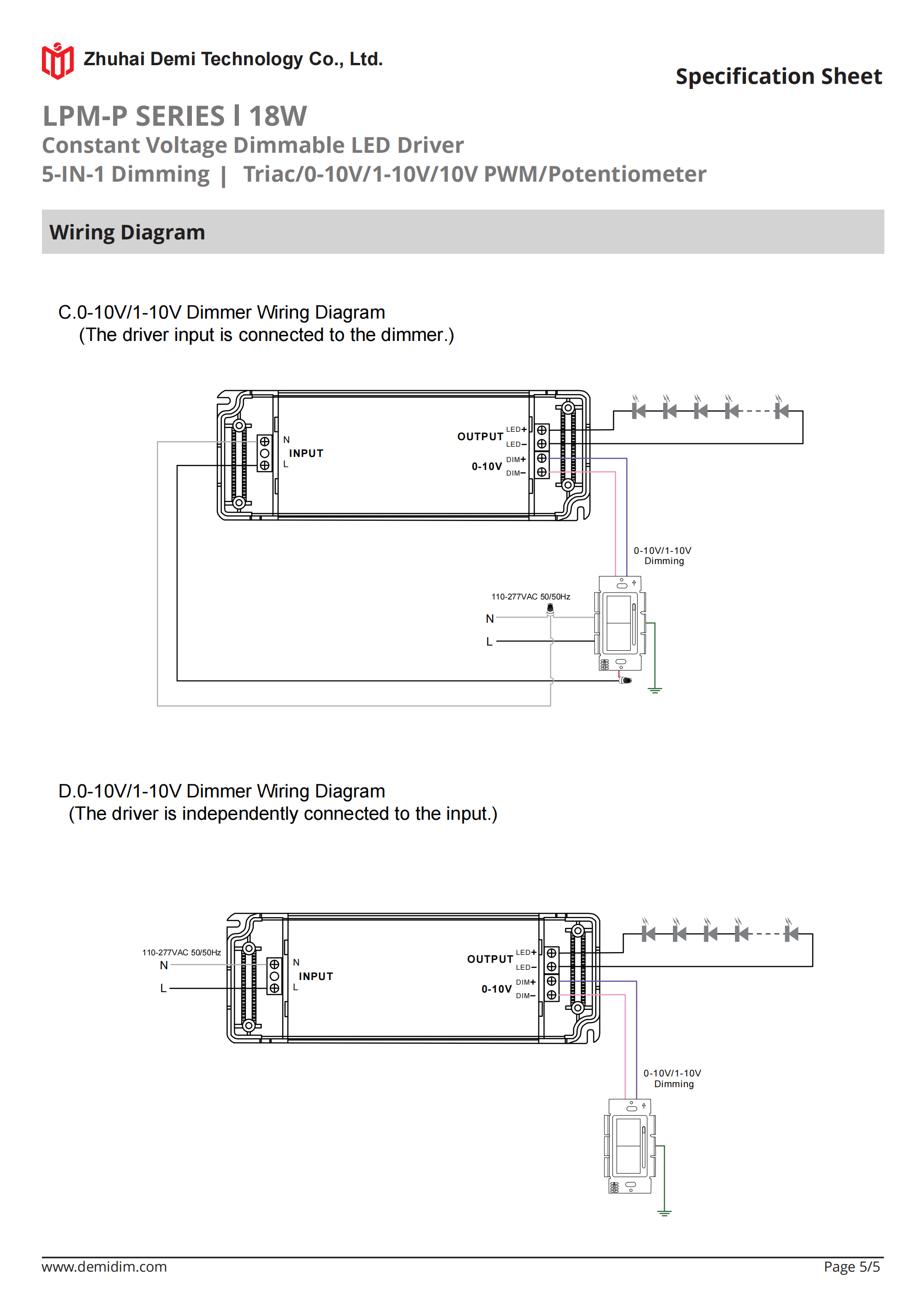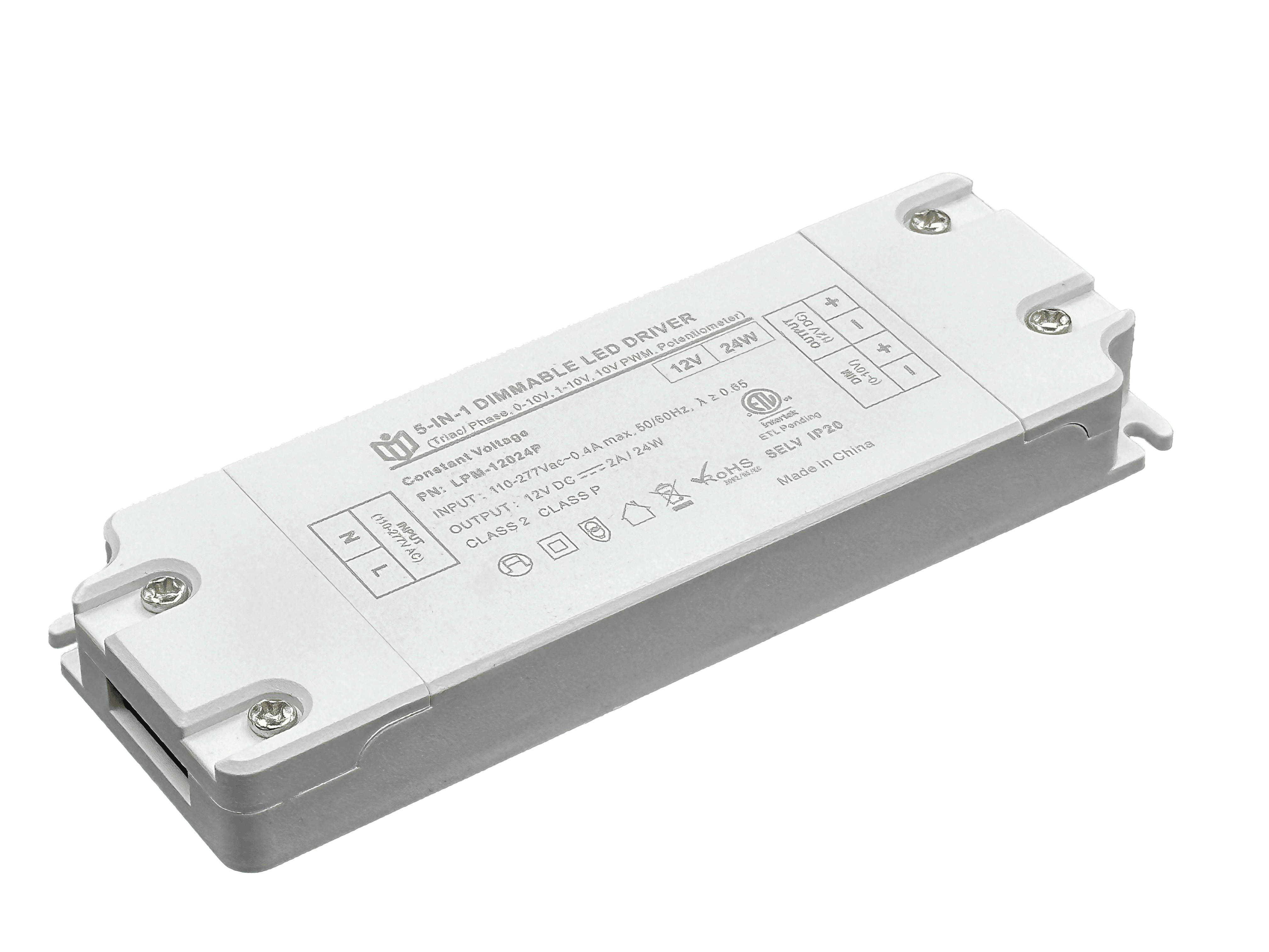 Item number: LPM-12120P,LPM-24120P Dim: Triac/0-10V/1-10V/10V PWM / Potentiometer Dimming method: PWM Input Voltage: 110-277V Output Voltage: 12V/24V PF: ≥0.9 Efficiency: ≥90% Warranty: 5 years. Protection: short circuit,overload,over-temperature, Certificate: ETL Brand: DEMI