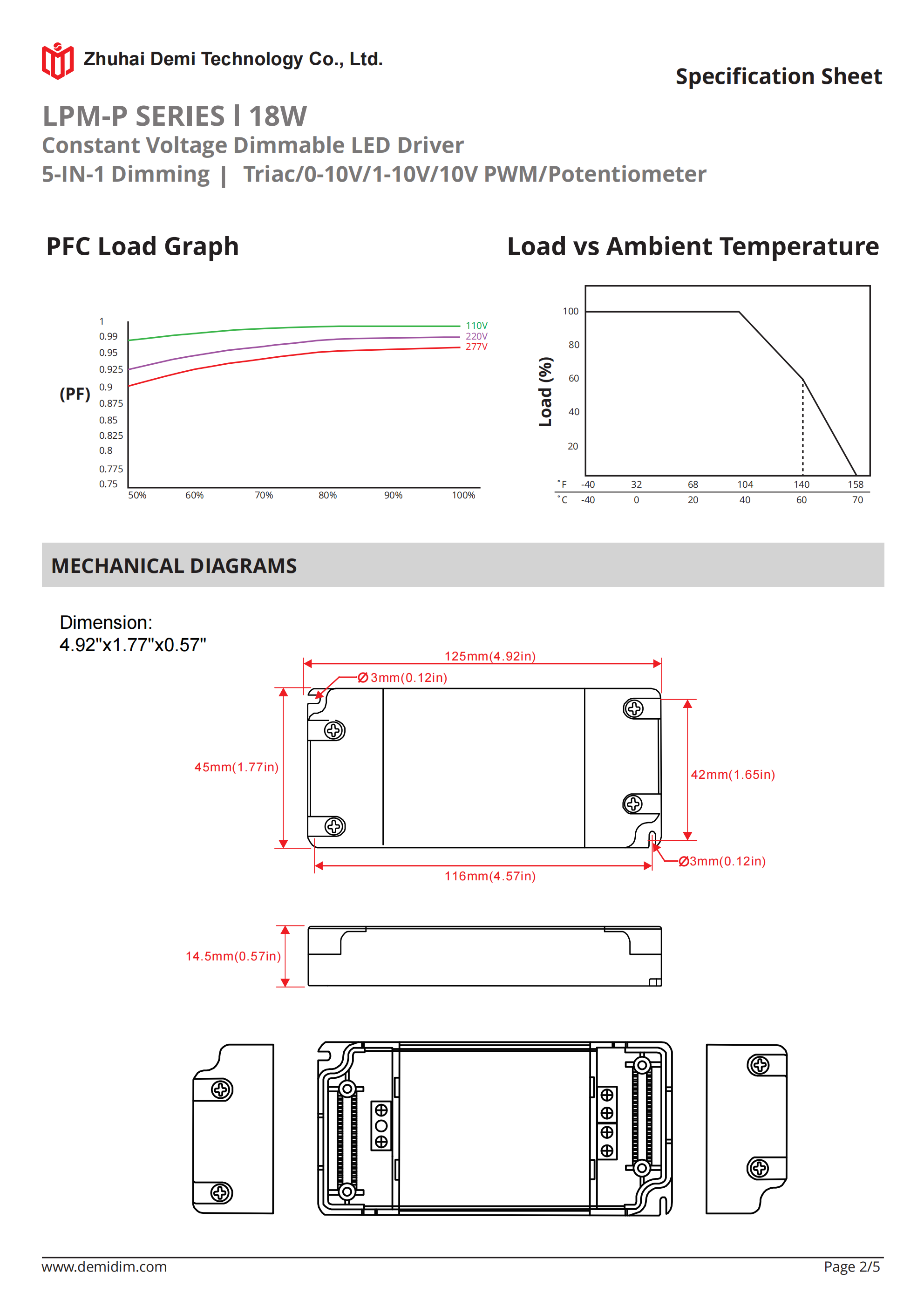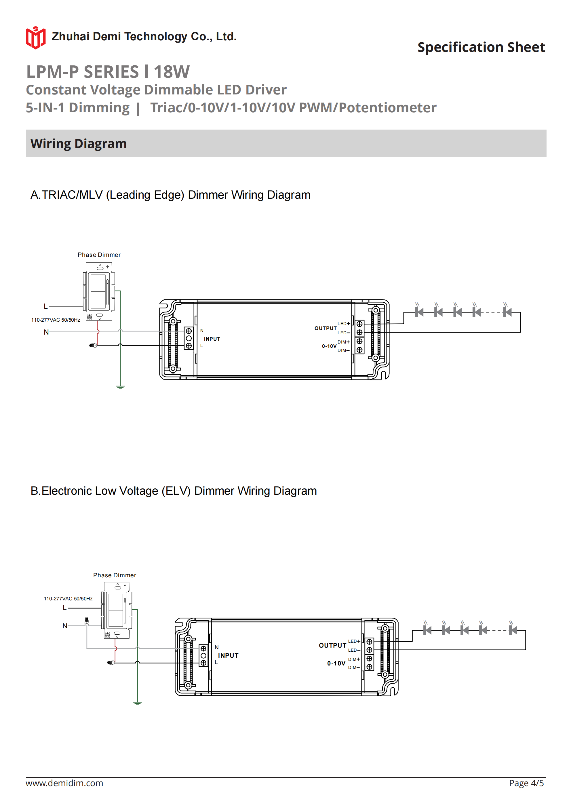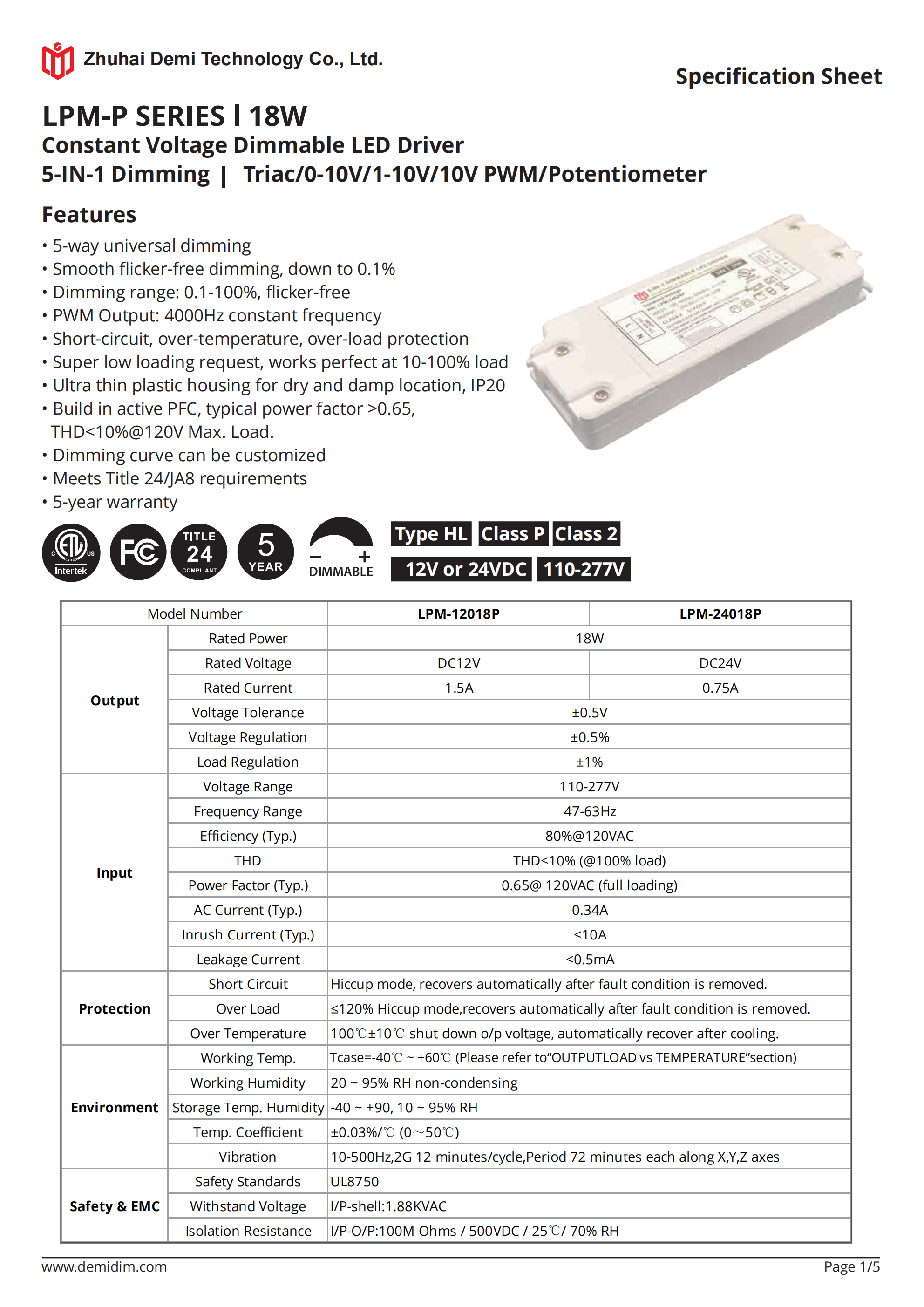 Item number: LPM-12018P,LPM-24018P Dim: Triac/0-10V/1-10V/10V PWM / Potentiometer Dimming method: PWM Input Voltage: 110-277V Output Voltage: 12V/24V PF: ≥0.65 Efficiency: ≥80% Warranty: 5 years. Protection: short circuit,overload,over-temperature, Certificate: ETL Brand: DEMI