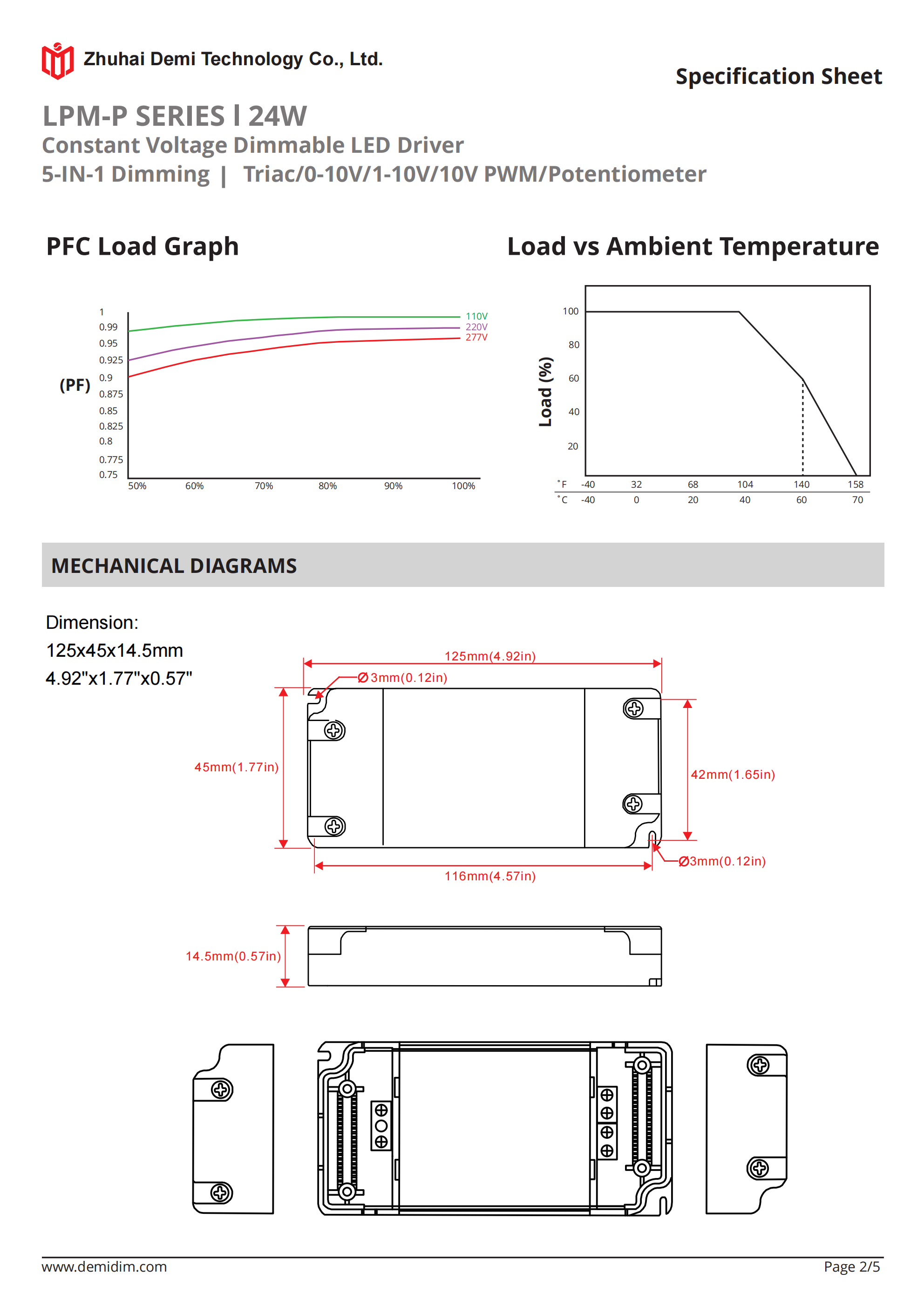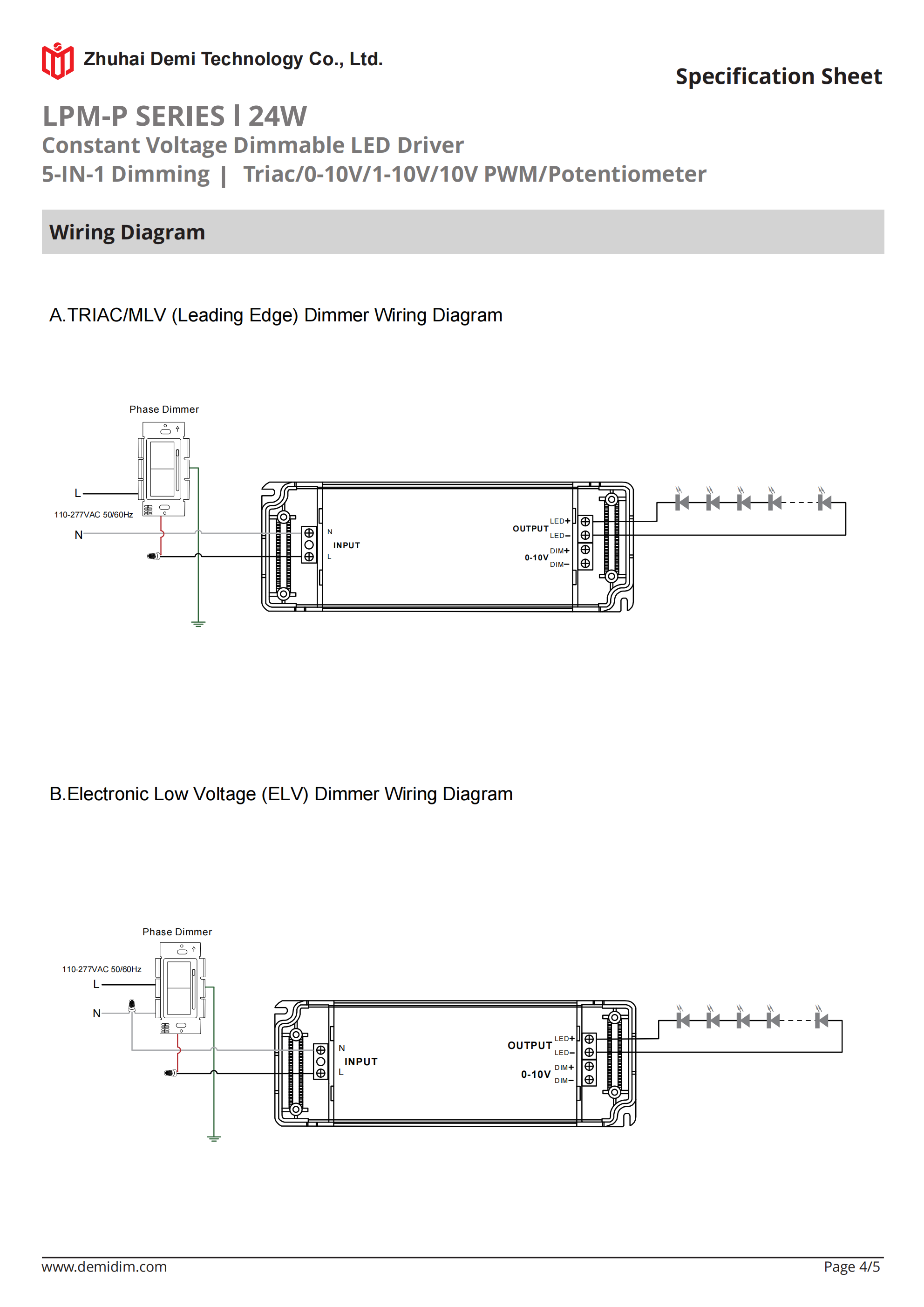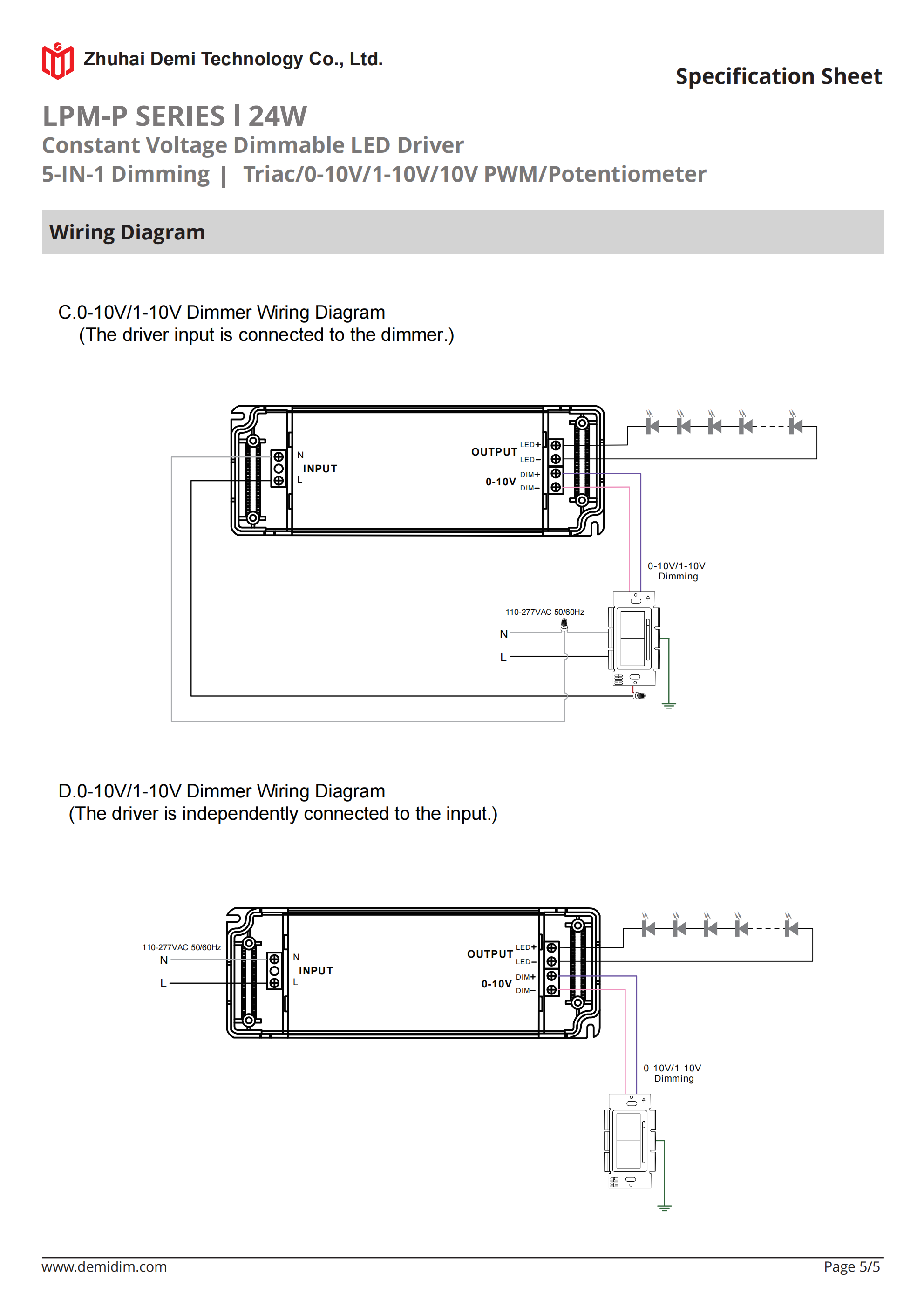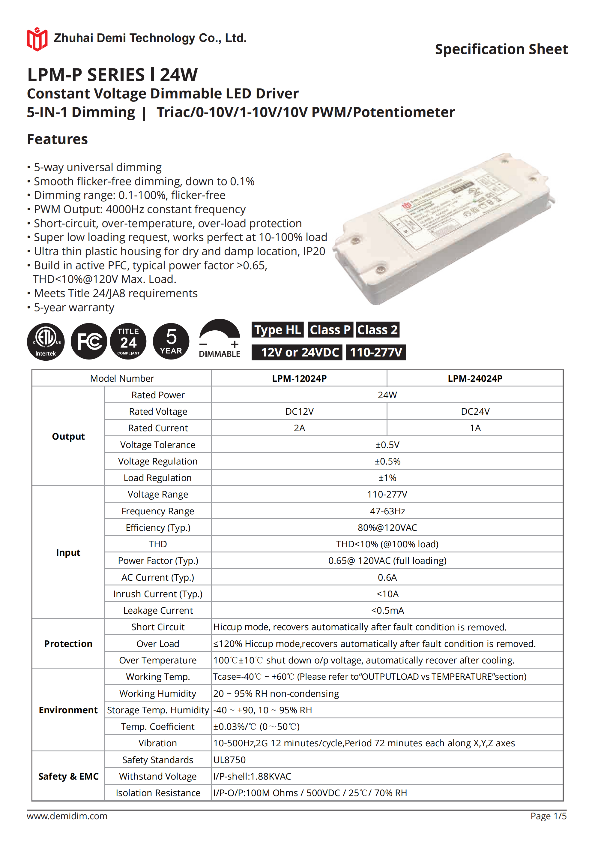 Item number: LPM-12120P,LPM-24120P Dim: Triac/0-10V/1-10V/10V PWM / Potentiometer Dimming method: PWM Input Voltage: 110-277V Output Voltage: 12V/24V PF: ≥0.9 Efficiency: ≥90% Warranty: 5 years. Protection: short circuit,overload,over-temperature, Certificate: ETL Brand: DEMI