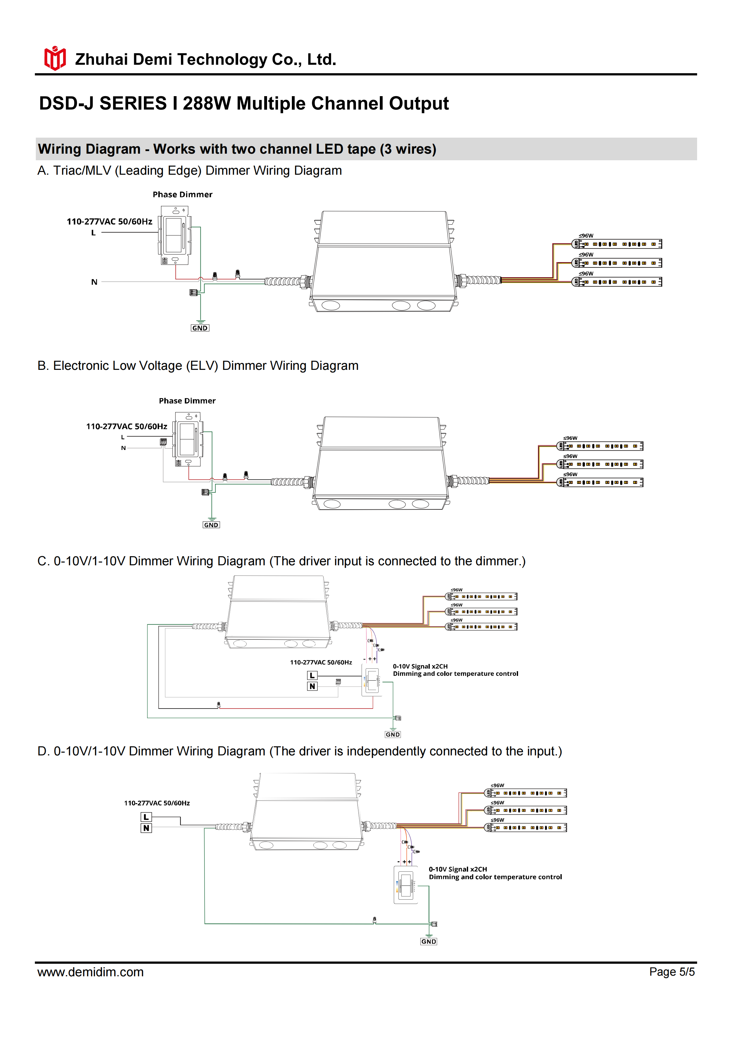 Item number: DSD-H12120J,DSD-H24120J Dim: Triac/0-10V/1-10V/10V PWM / Potentiometer Dimming method: PWM Input Voltage: 110-277V Output Voltage: 12V/24V PF: ≥0.9 Efficiency: ≥90% Protection: short circuit,overload,over-temperature, Certificate: UL list Brand: DEMI