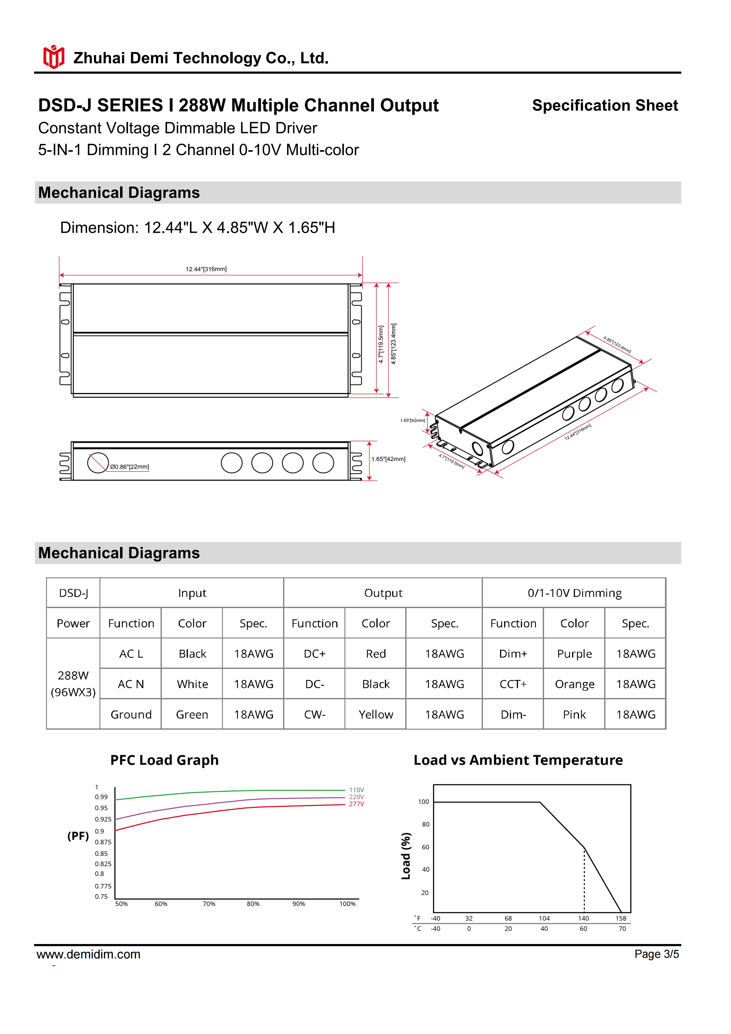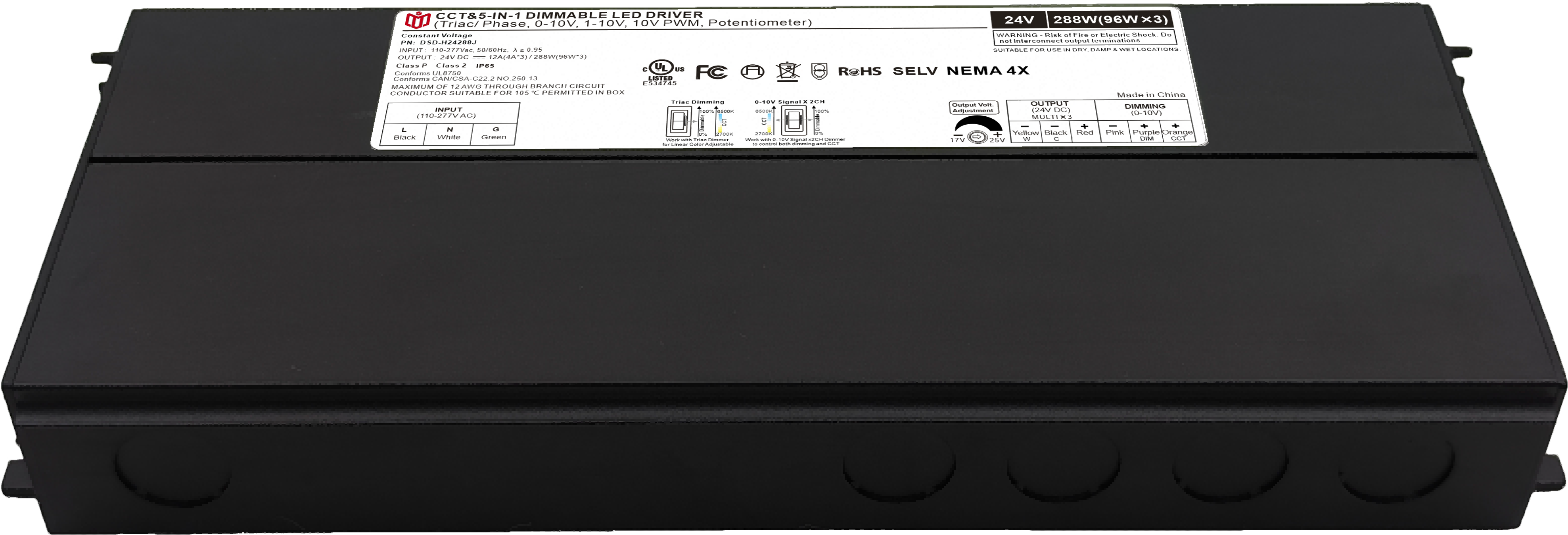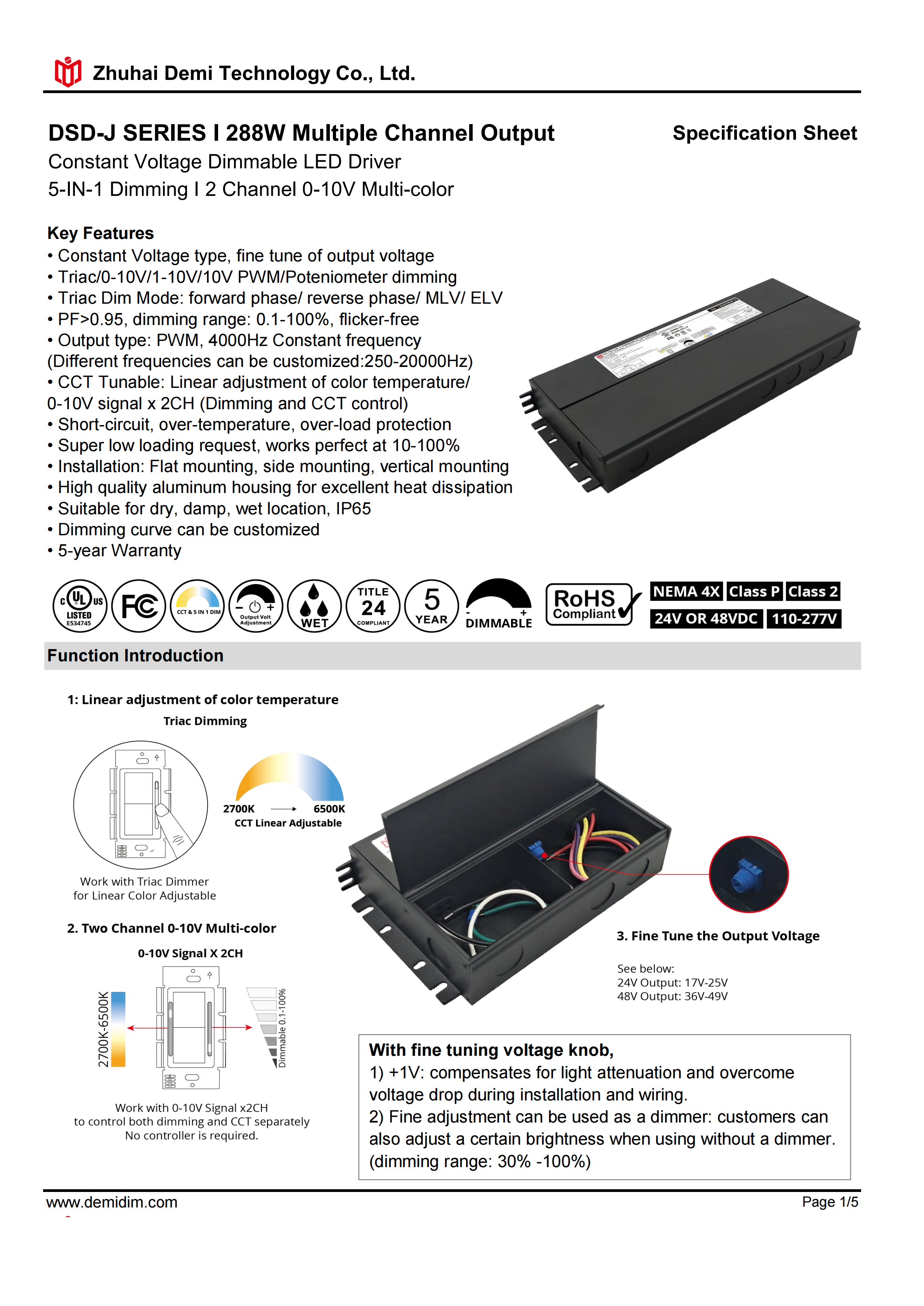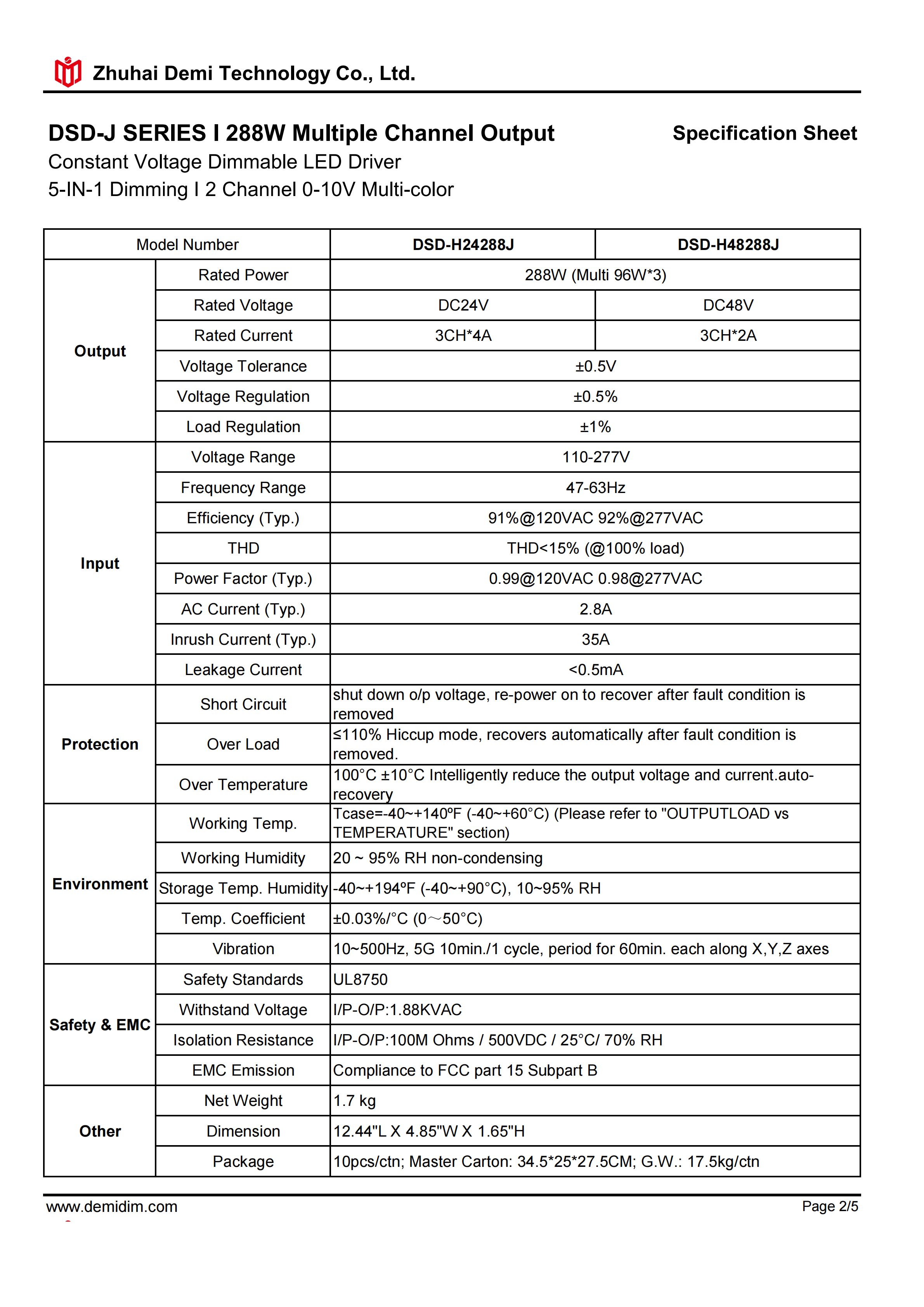 Item number: DSD-H24288J,DSD-H48288J Dim: Triac/0-10V/1-10V/10V PWM / Potentiometer Dimming method: PWM Input Voltage: 110-277V Output Voltage: 24V/48V PF: ≥0.9 Efficiency: ≥91% Protection: short circuit,overload,over-temperature, Certificate: UL list Brand: DEMI