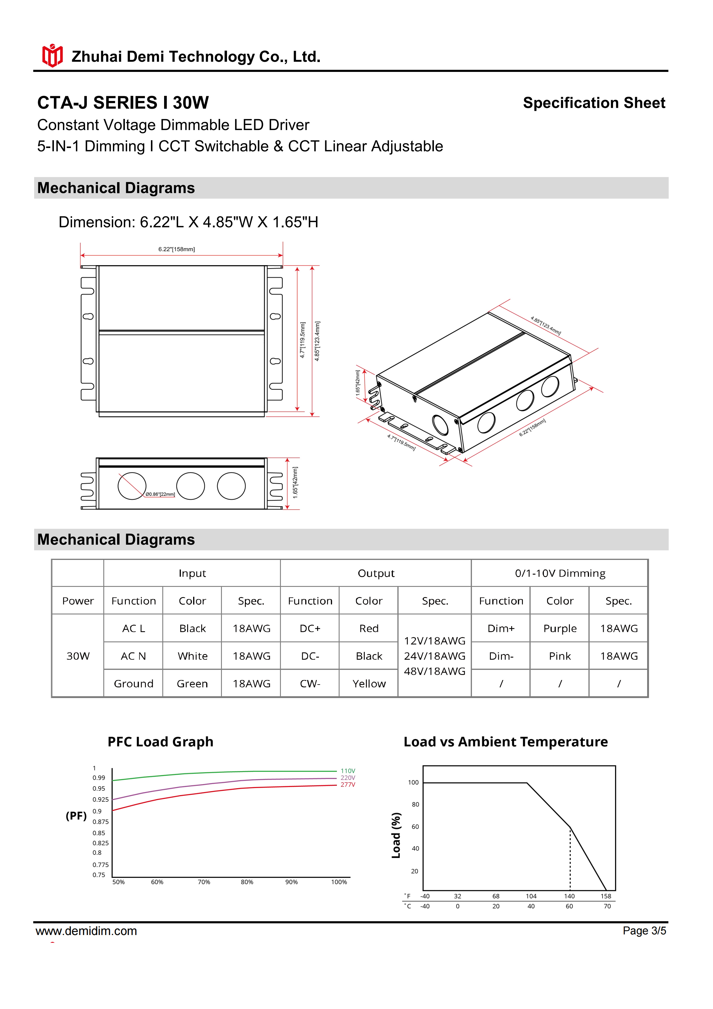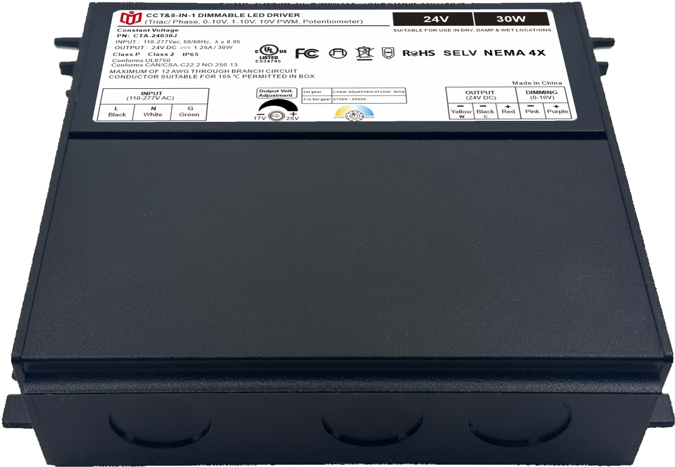 Item number: CTA-12030J,CTA-24030J,CTA-48030J Dim: Triac/0-10V/1-10V/10V PWM / Potentiometer Dimming method: PWM Input Voltage: 110-277V Output Voltage: 12V/24V/48V PF: ≥0.9 Efficiency: ≥85% Protection: short circuit,overload,over-temperature, Certificate: UL list Brand: DEMI