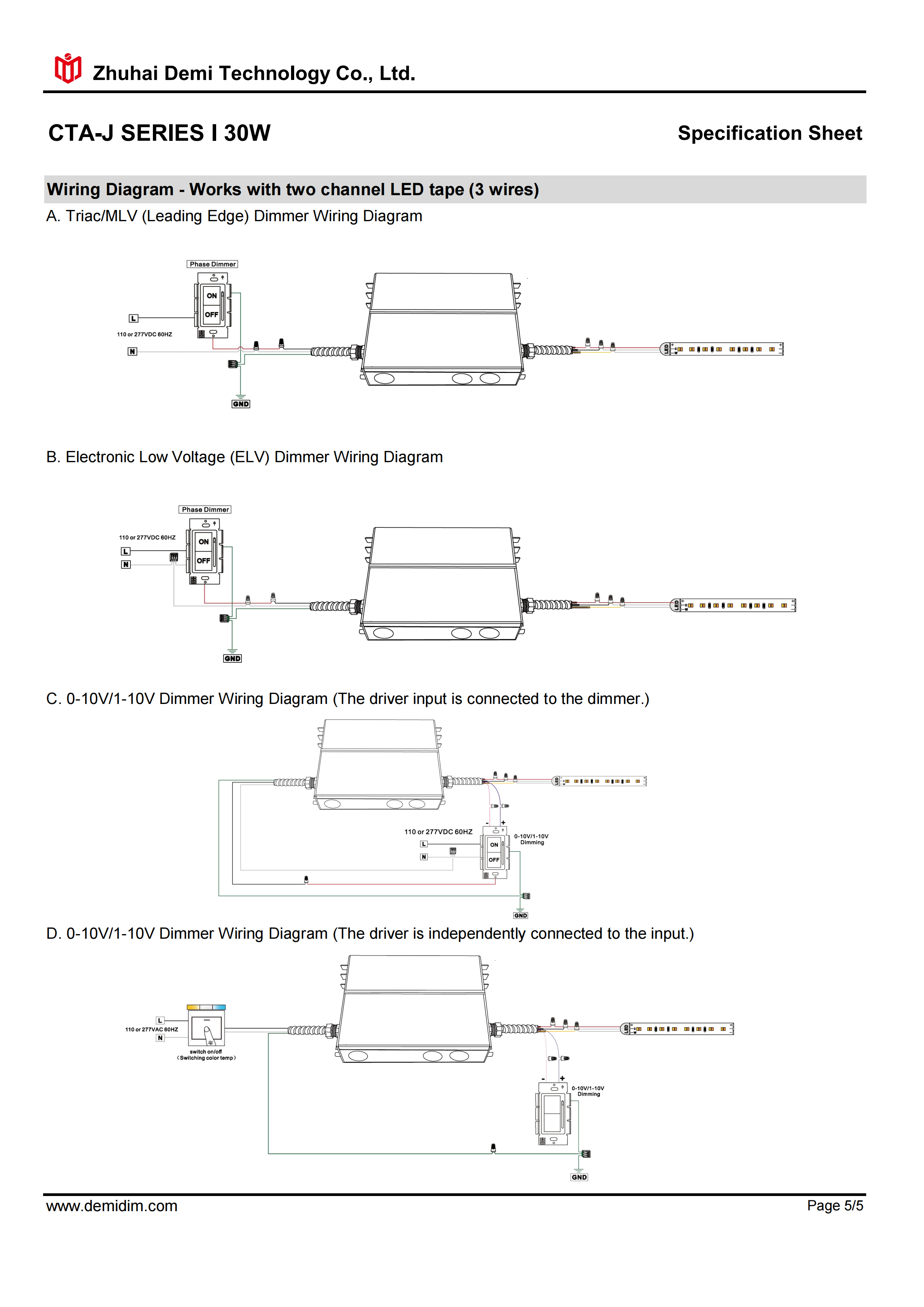 Item number: CTA-12300J,CTA-24300J,CTA-48300J Dim: Triac/0-10V/1-10V/10V PWM / Potentiometer Dimming method: PWM Input Voltage: 110-277V Output Voltage: 12V/24V/48V PF: ≥0.9 Efficiency: ≥90% Protection: short circuit,overload,over-temperature, Certificate: UL list Brand: DEMI Item number: CTA-H12120J,CTA-H24120J,CTA-48192J Dim: Triac/0-10V/1-10V/10V PWM / Potentiometer Dimming method: PWM Input Voltage: 110-277V Output Voltage: 12V/24V/48V PF: ≥0.9 Efficiency: ≥91% Protection: short circuit,overload,over-temperature, Certificate: UL list Brand: DEM