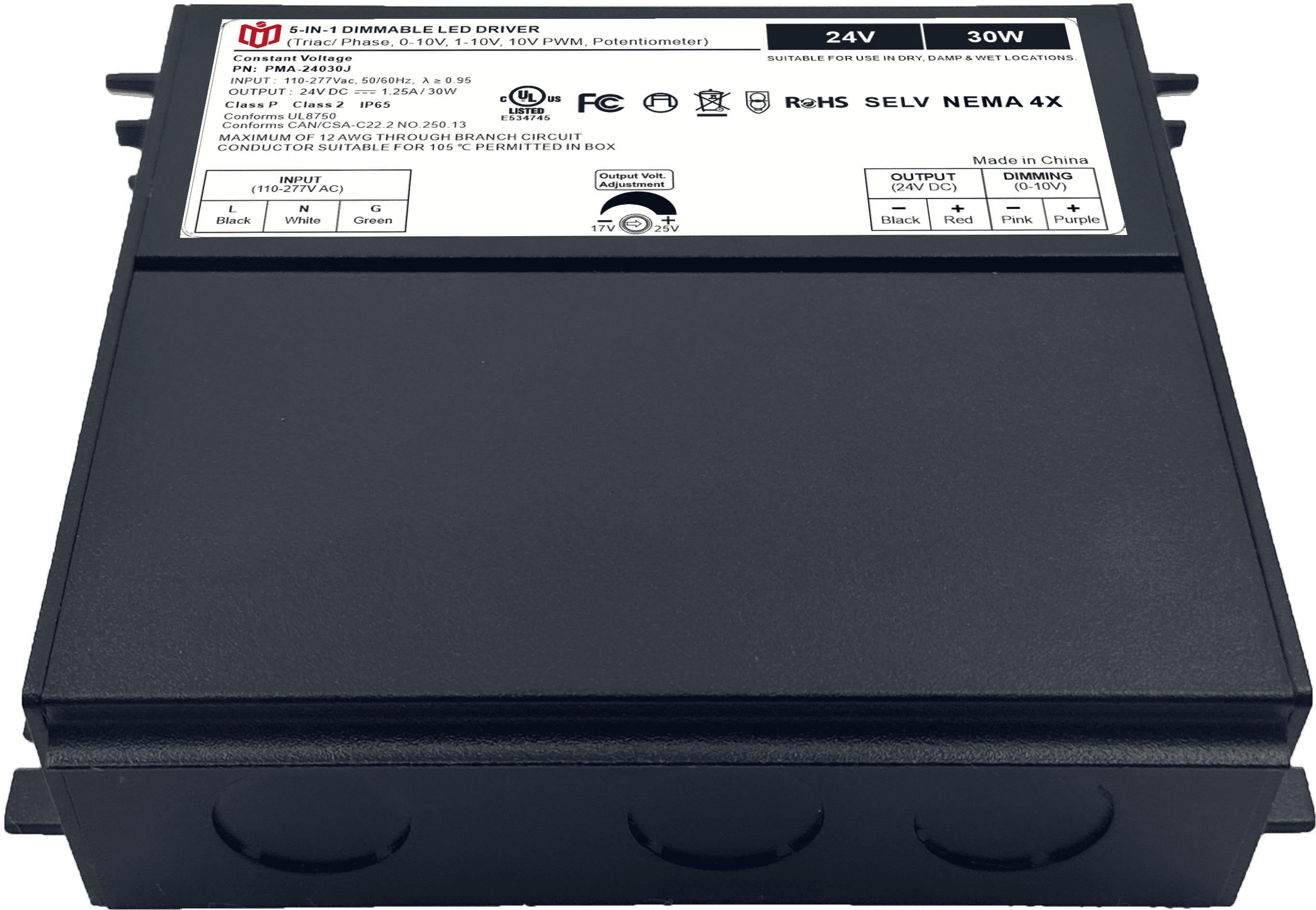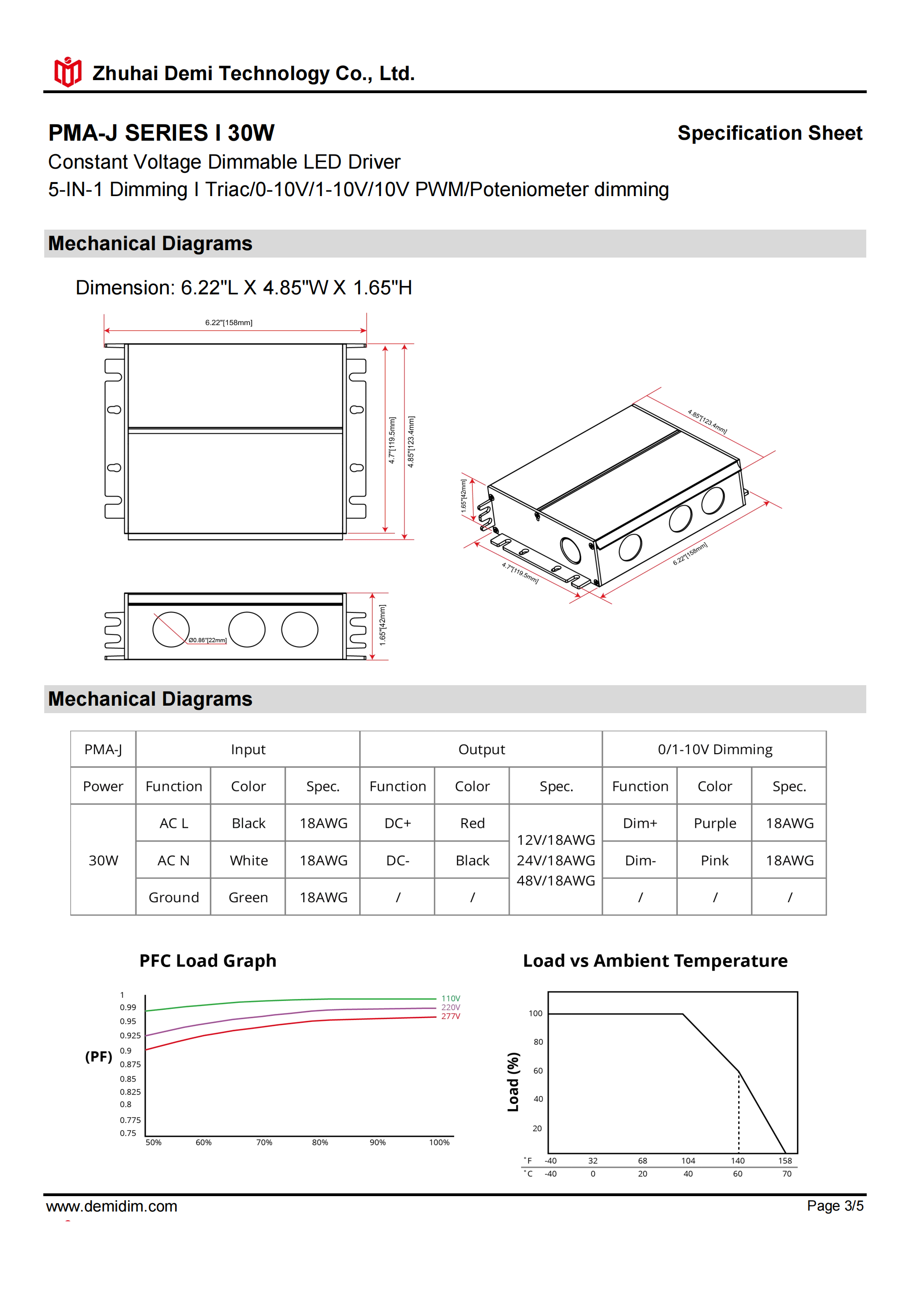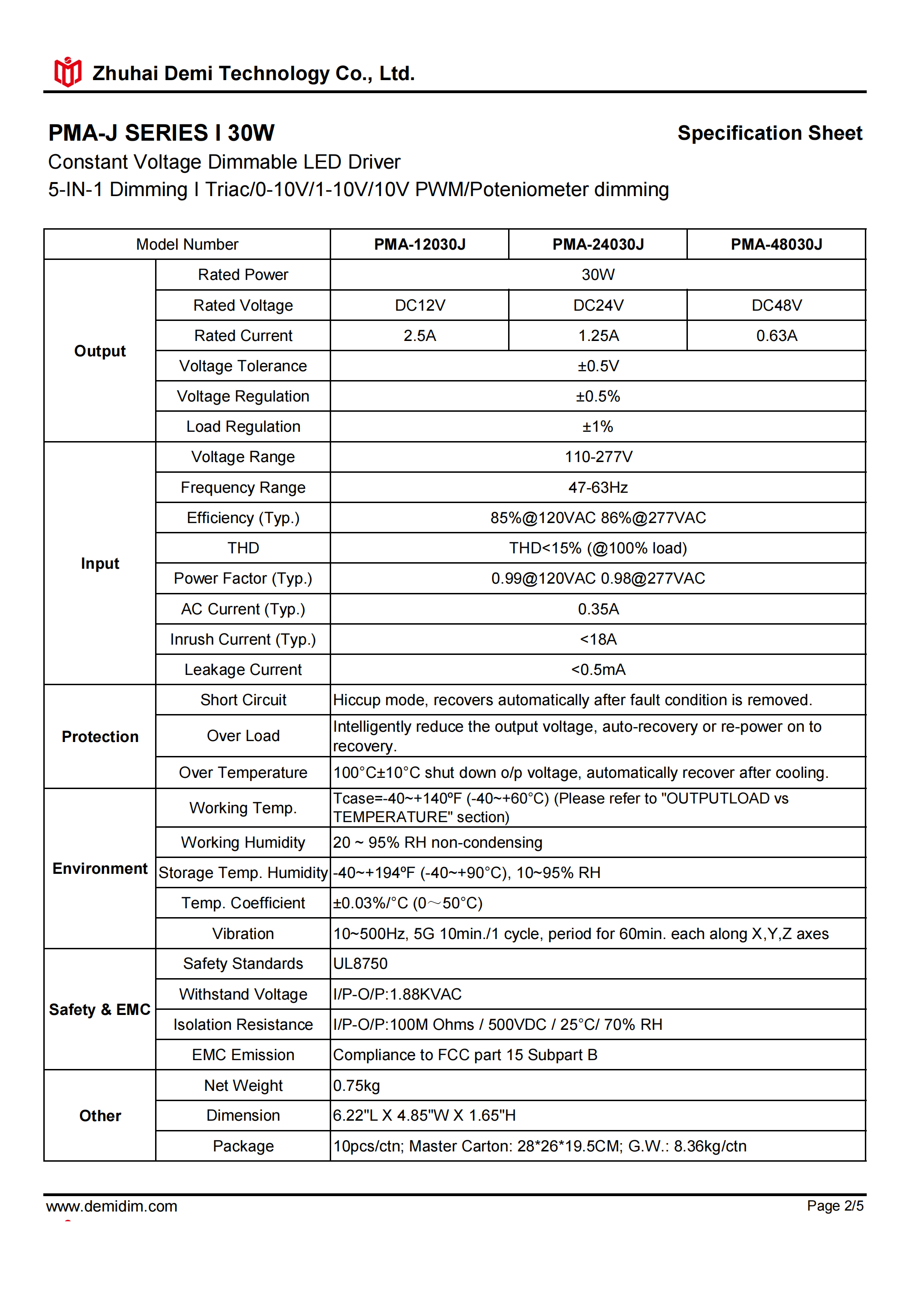 Item number: PMA-12030J,PMA-24030J,PMA-48030J, Type: Constant Voltage Dim: Triac/0-10V/1-10V/10V PWM / Potentiometer Output Method: PWM Input Voltage: 110-277V Output Voltage: 12V/24V/48V PF: ≥0.9 Efficiency: ≥85% Warranty: 5 years. Protection: short circuit,overload,over-temperature, Certificate: UL list Brand: DEMI
