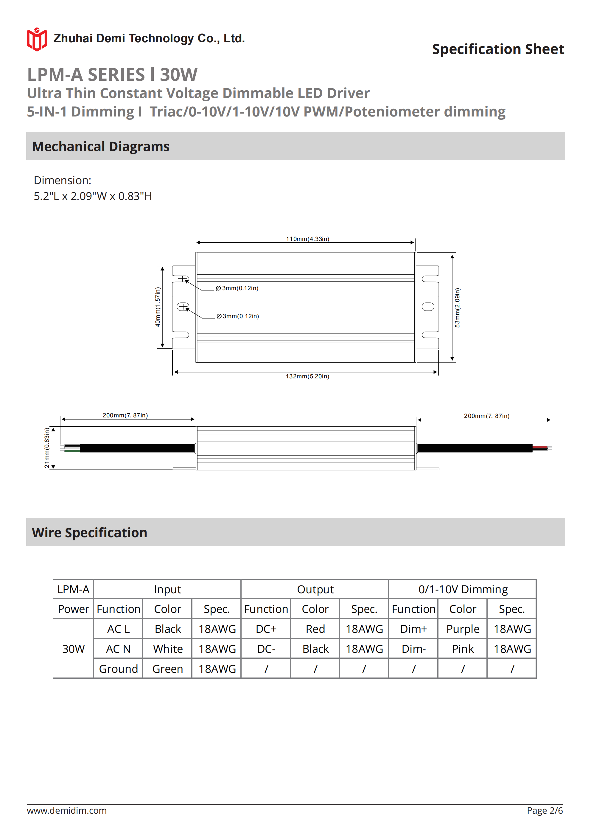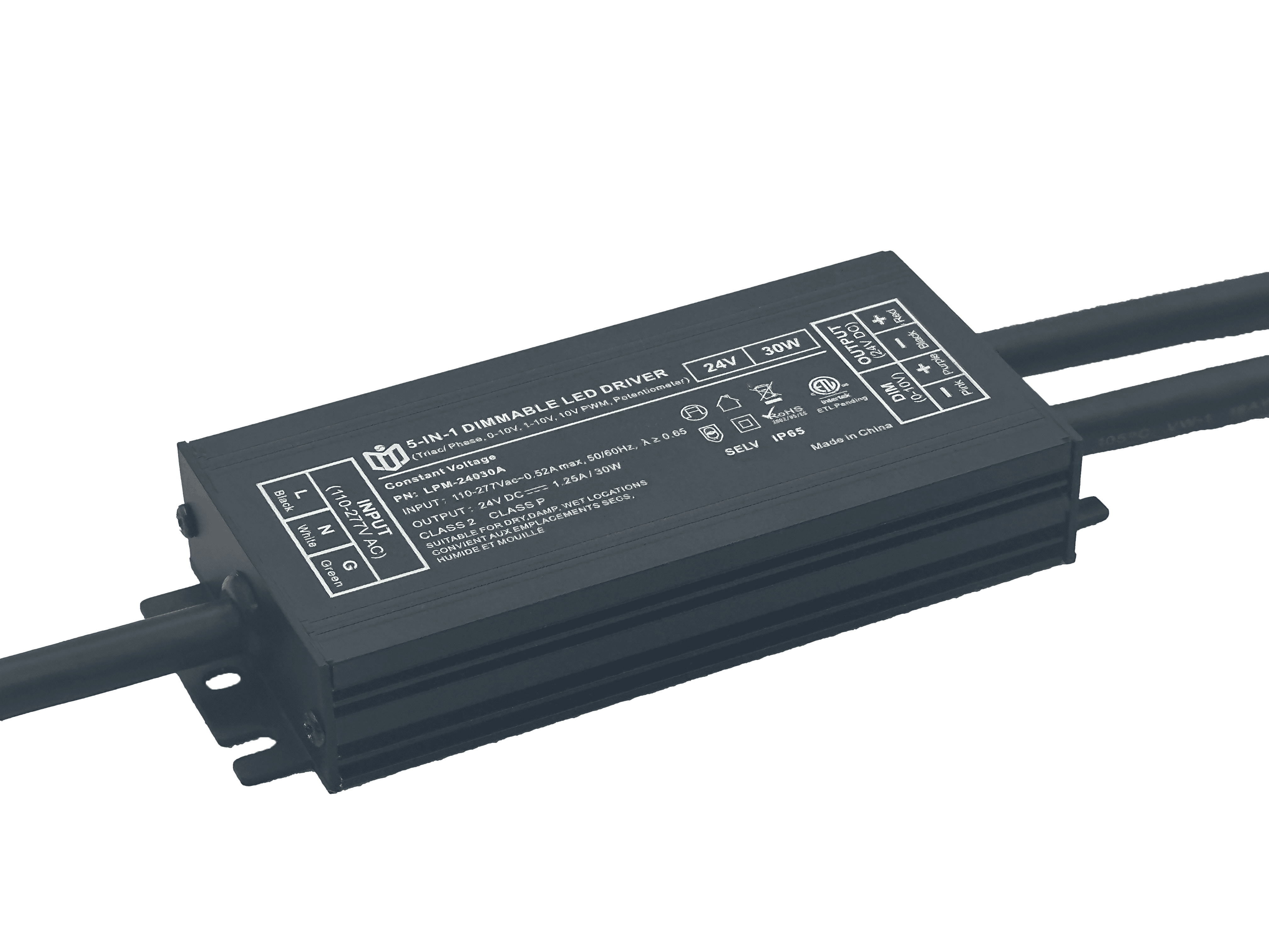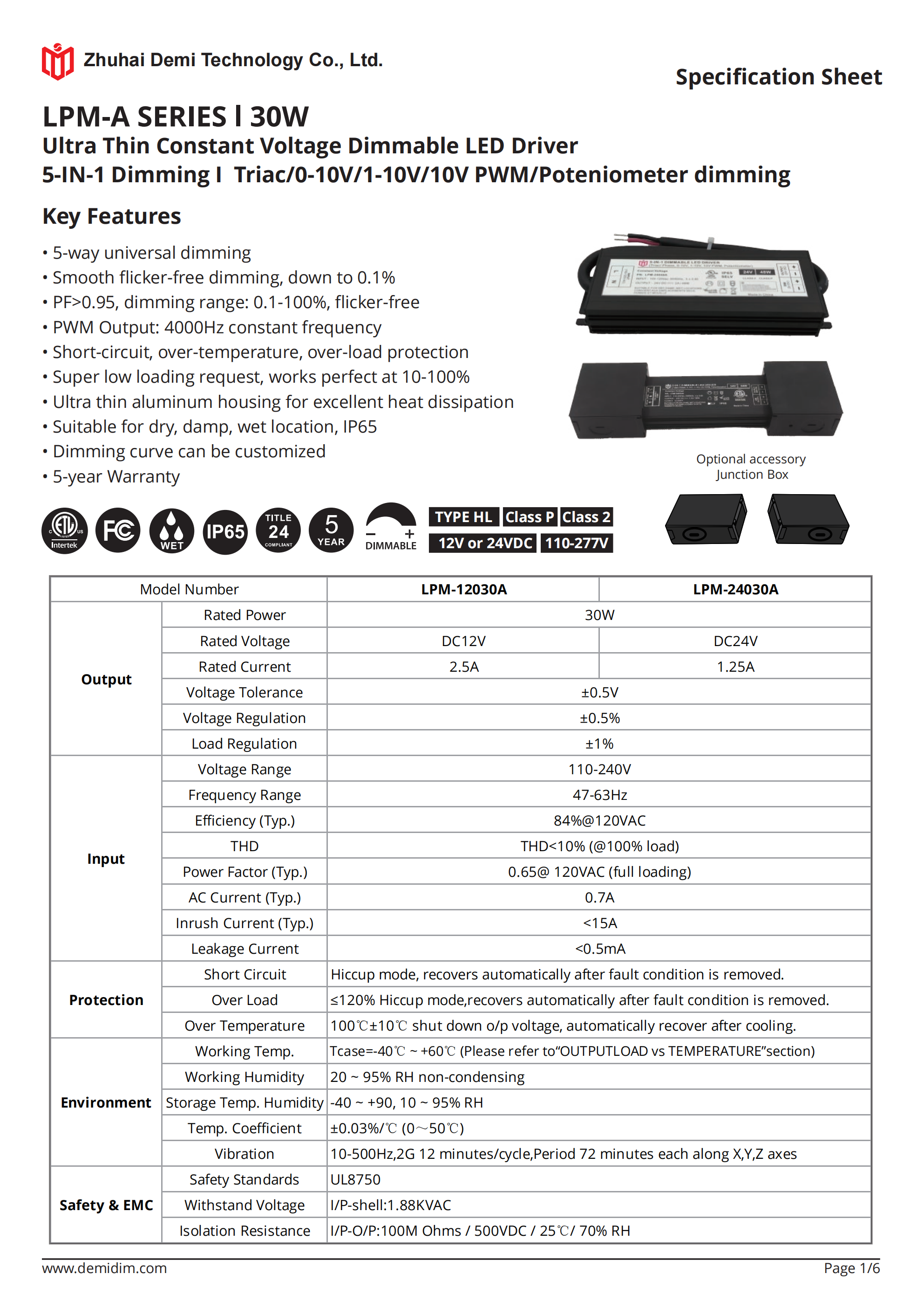 Item number: LPM-12030A,LPM-24030A Dim: Triac/0-10V/1-10V/10V PWM / Potentiometer Dimming method: PWM Input Voltage: 110-277V Output Voltage: 12V/24V PF: ≥0.65 Efficiency: ≥84% Warranty: 5 years. Protection: short circuit,overload,over-temperature, Certificate: ETL list Brand: DEMI