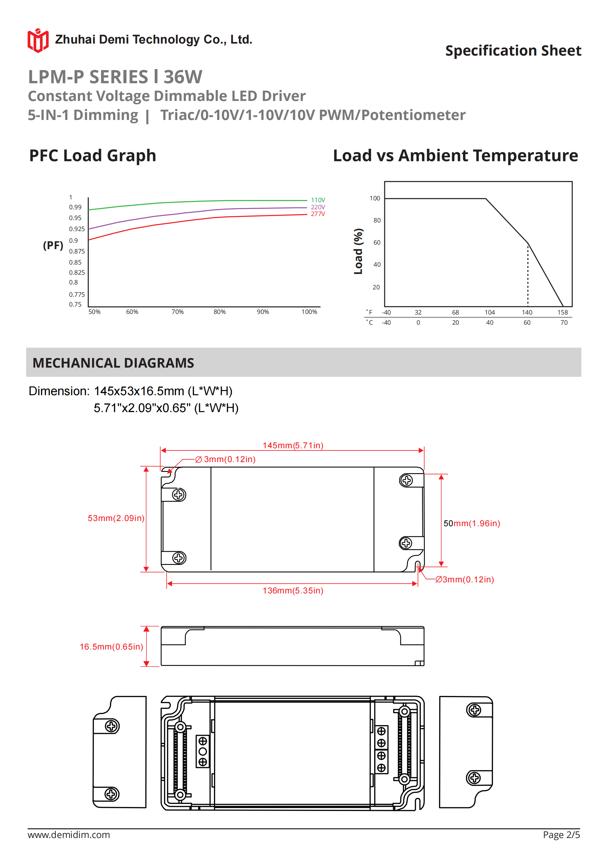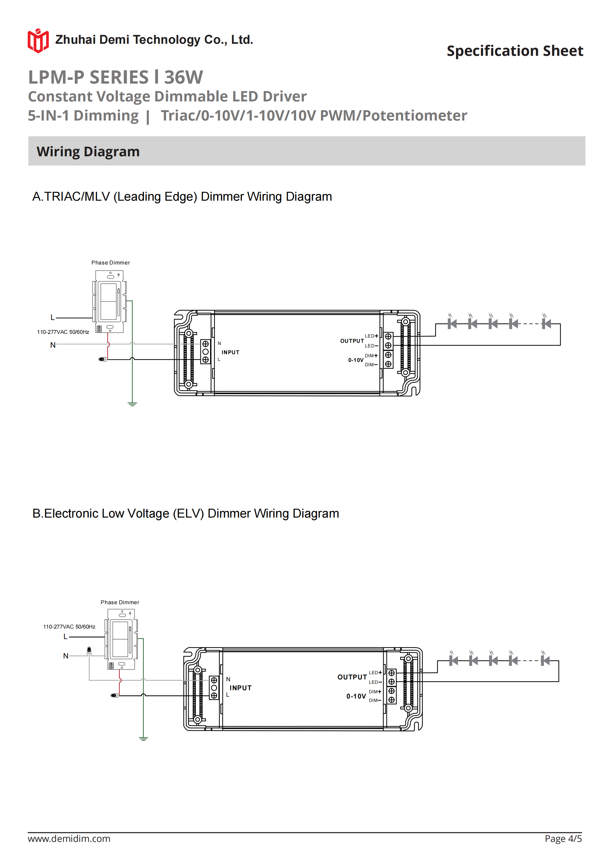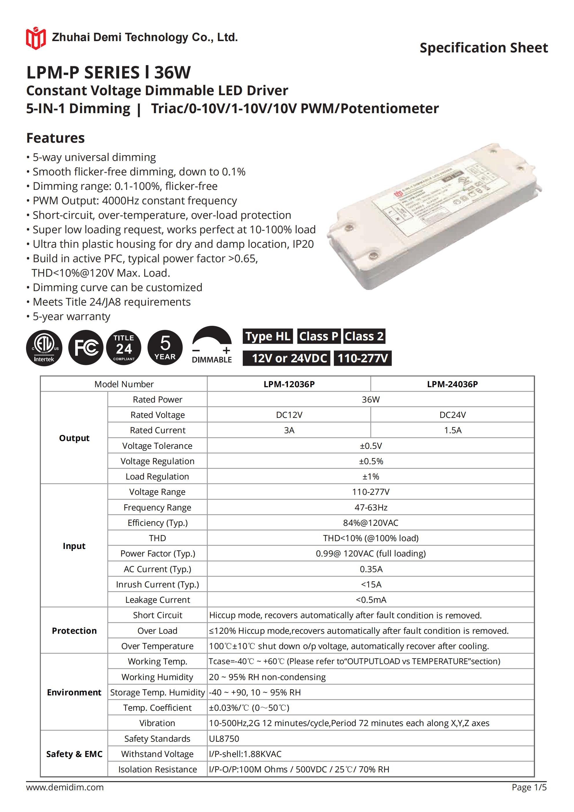 Item number: LPM-12036P,LPM-24036P Dim: Triac/0-10V/1-10V/10V PWM / Potentiometer Dimming method: PWM Input Voltage: 110-277V Output Voltage: 12V/24V PF: ≥0.9 Efficiency: ≥84% Warranty: 5 years. Protection: short circuit,overload,over-temperature, Certificate: ETL Brand: DEMI