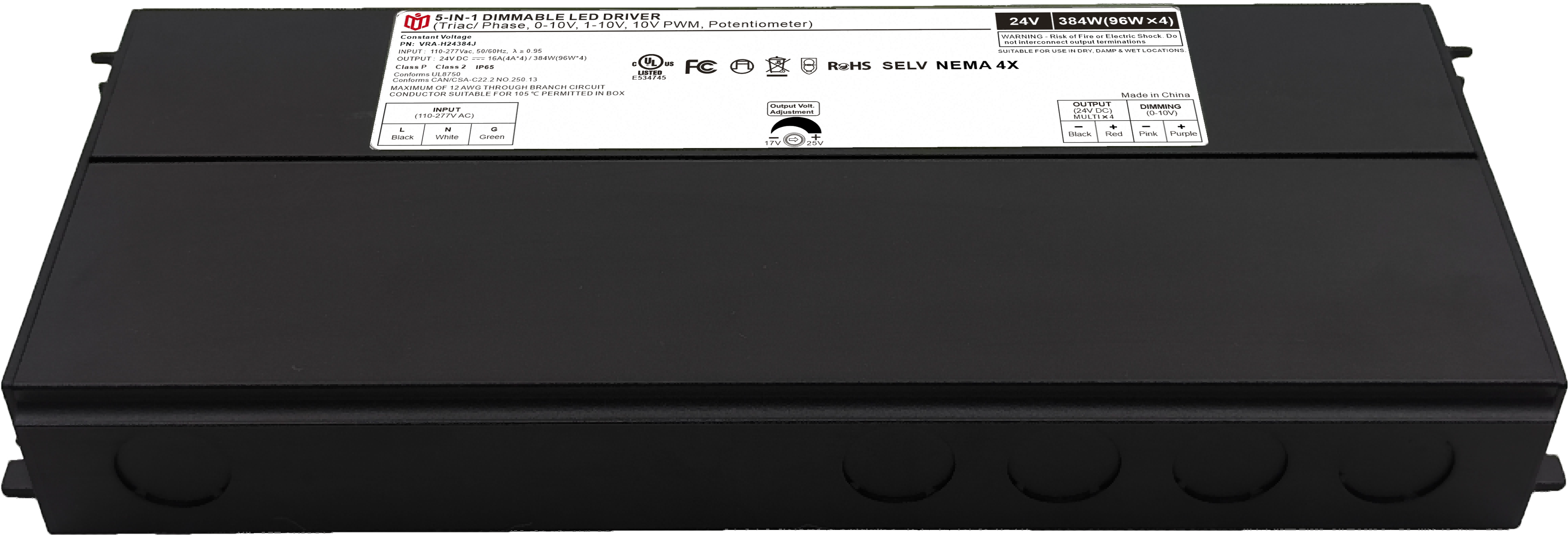 Item number: VRA-H24384J,VRA-H48384J, Dimming Mode: Triac/0-10V/1-10V/10V PWM / Potentiometer Output Method: Amplitude Modulation Input Voltage: 110-277V Output Voltage: 24V/48V PF: ≥0.9 Efficiency: ≥92% Warranty: 5 years. Protection: short circuit,overload,over-temperature, Certificate: UL list Brand: DEMI