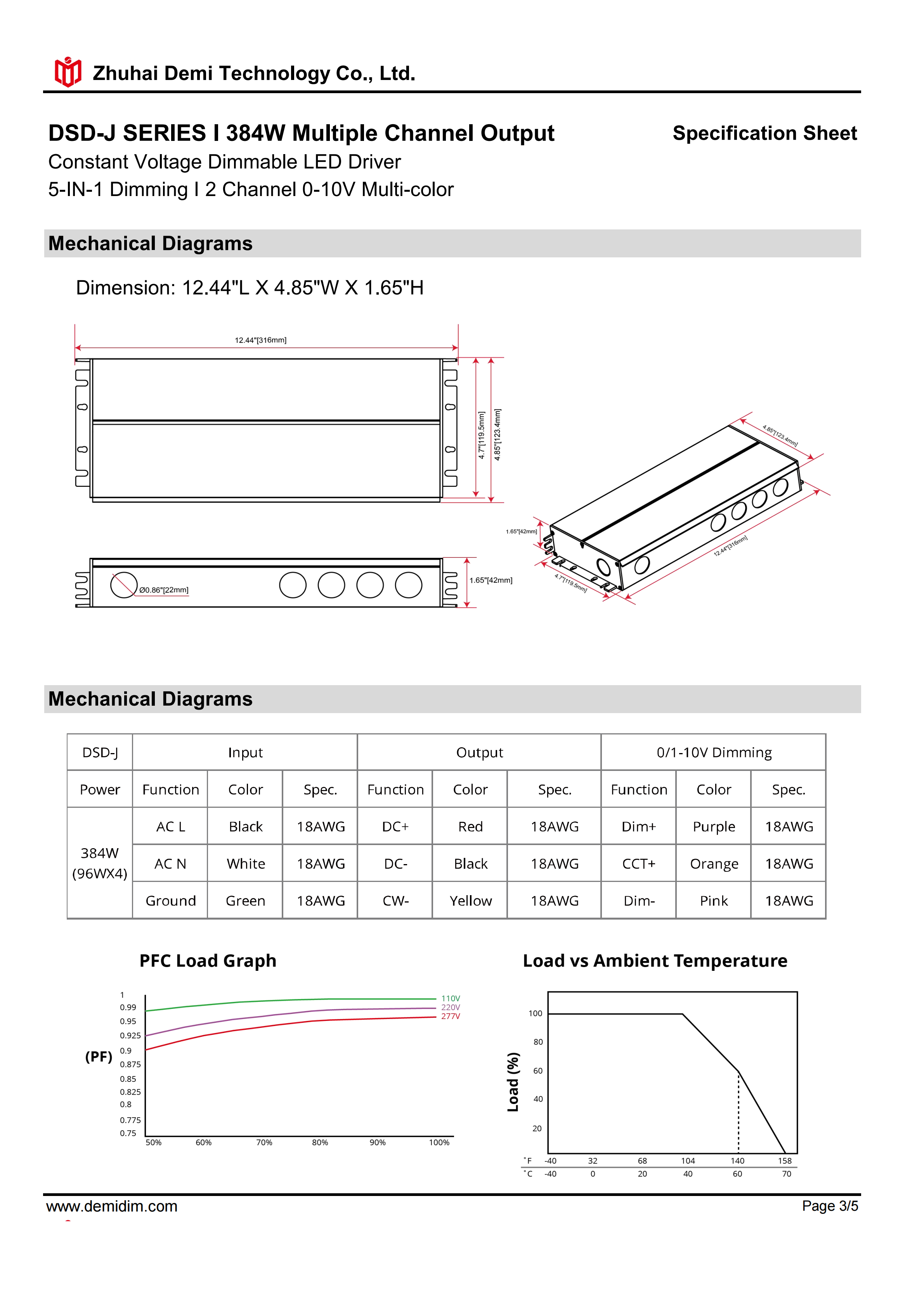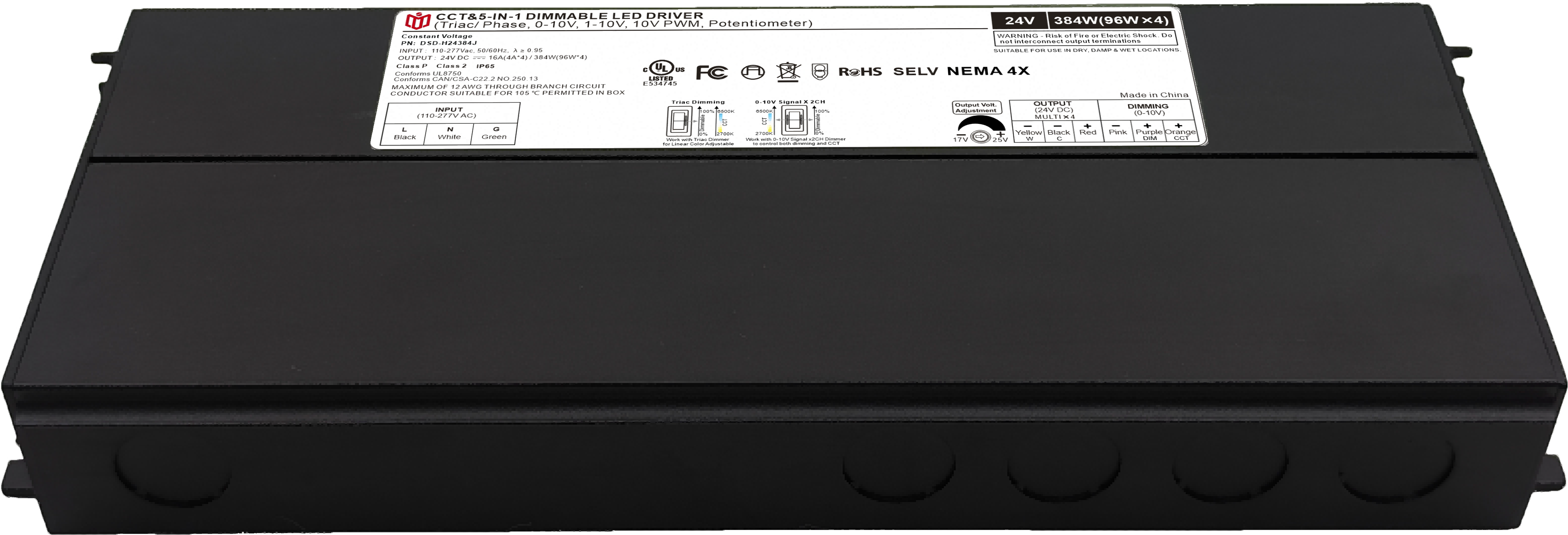 Item number: DSD-H24384J,DSD-H48384J Dim: Triac/0-10V/1-10V/10V PWM / Potentiometer Dimming method: PWM Input Voltage: 110-277V Output Voltage: 24V/48V PF: ≥0.9 Efficiency: ≥91% Protection: short circuit,overload,over-temperature, Certificate: UL list Brand: DEMI