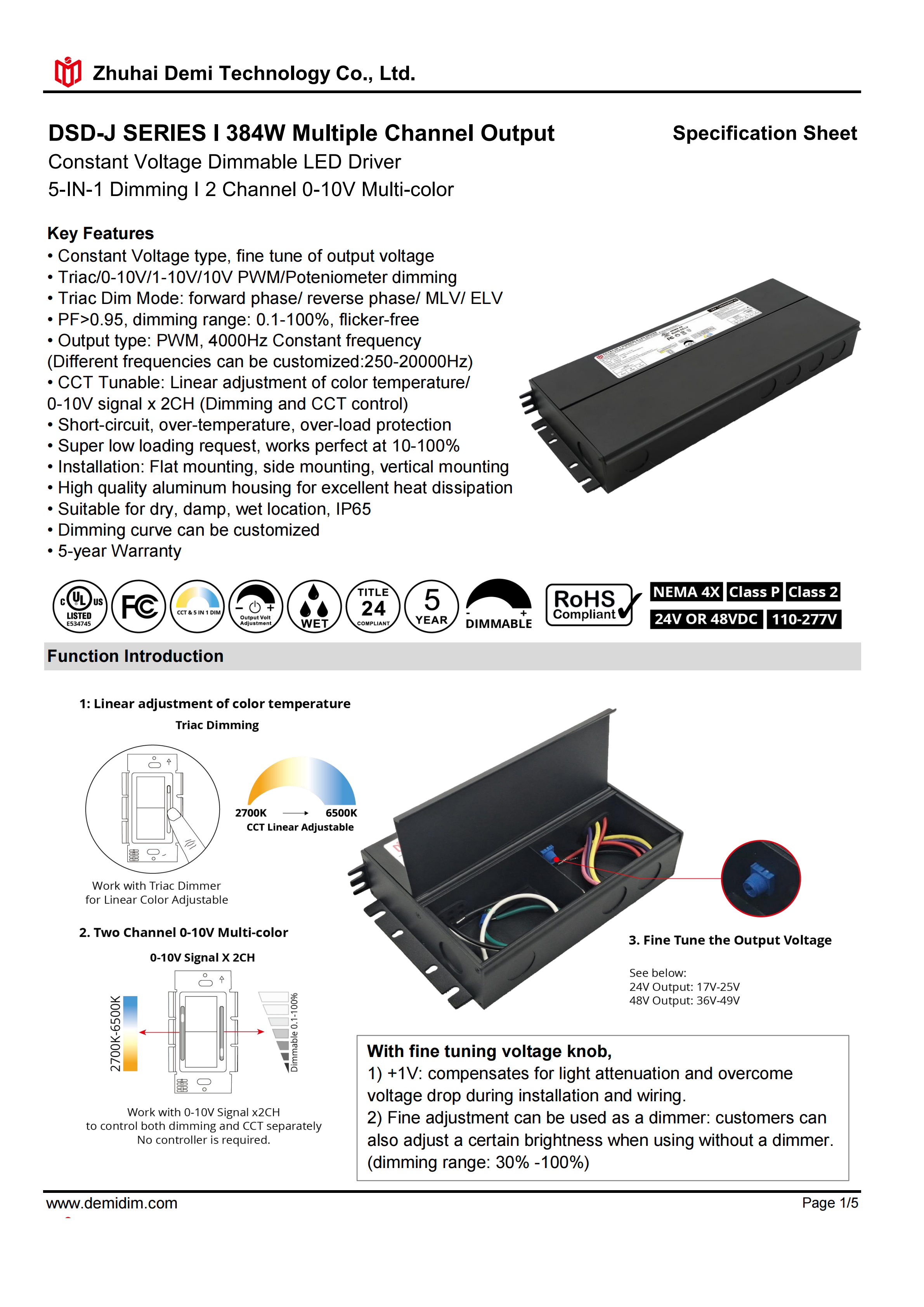 Item number: DSD-H12120J,DSD-H24120J Dim: Triac/0-10V/1-10V/10V PWM / Potentiometer Dimming method: PWM Input Voltage: 110-277V Output Voltage: 12V/24V PF: ≥0.9 Efficiency: ≥90% Protection: short circuit,overload,over-temperature, Certificate: UL list Brand: DEMI