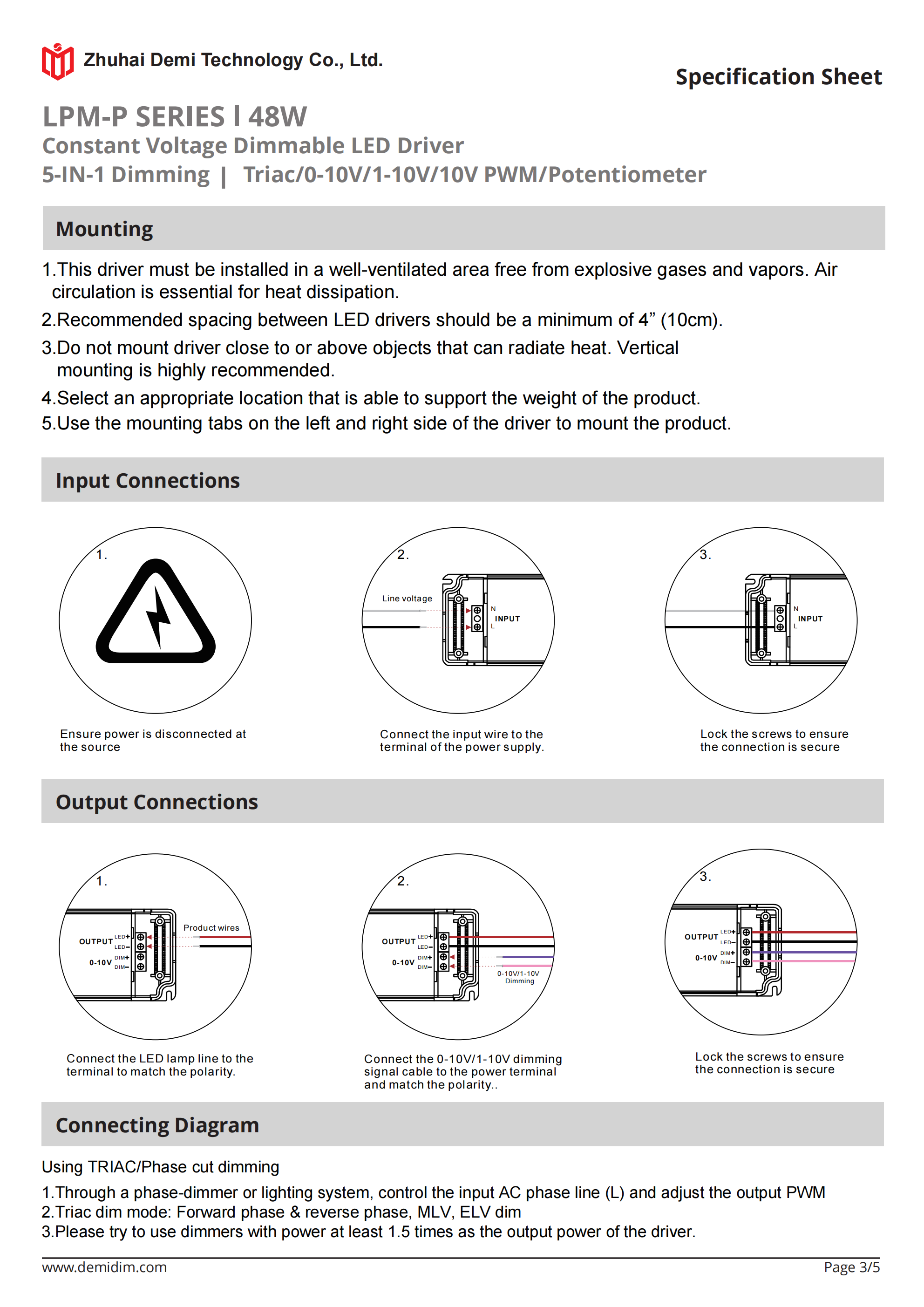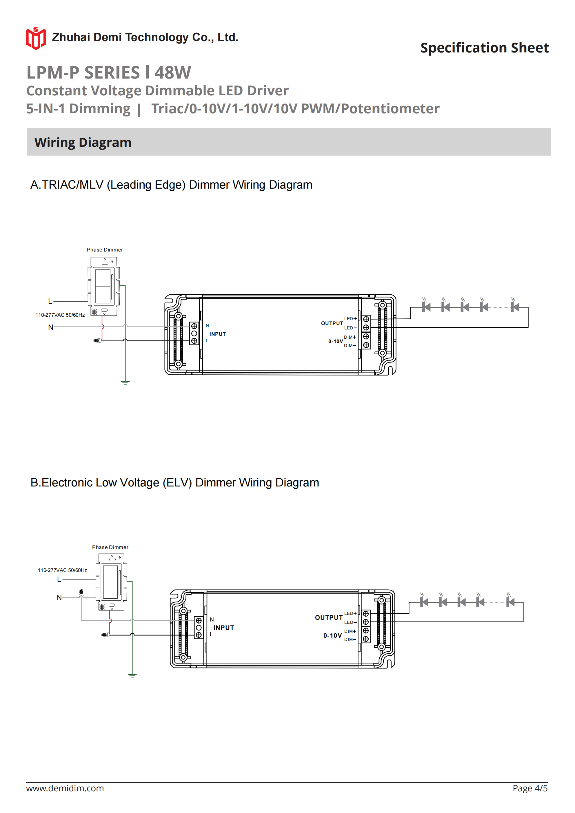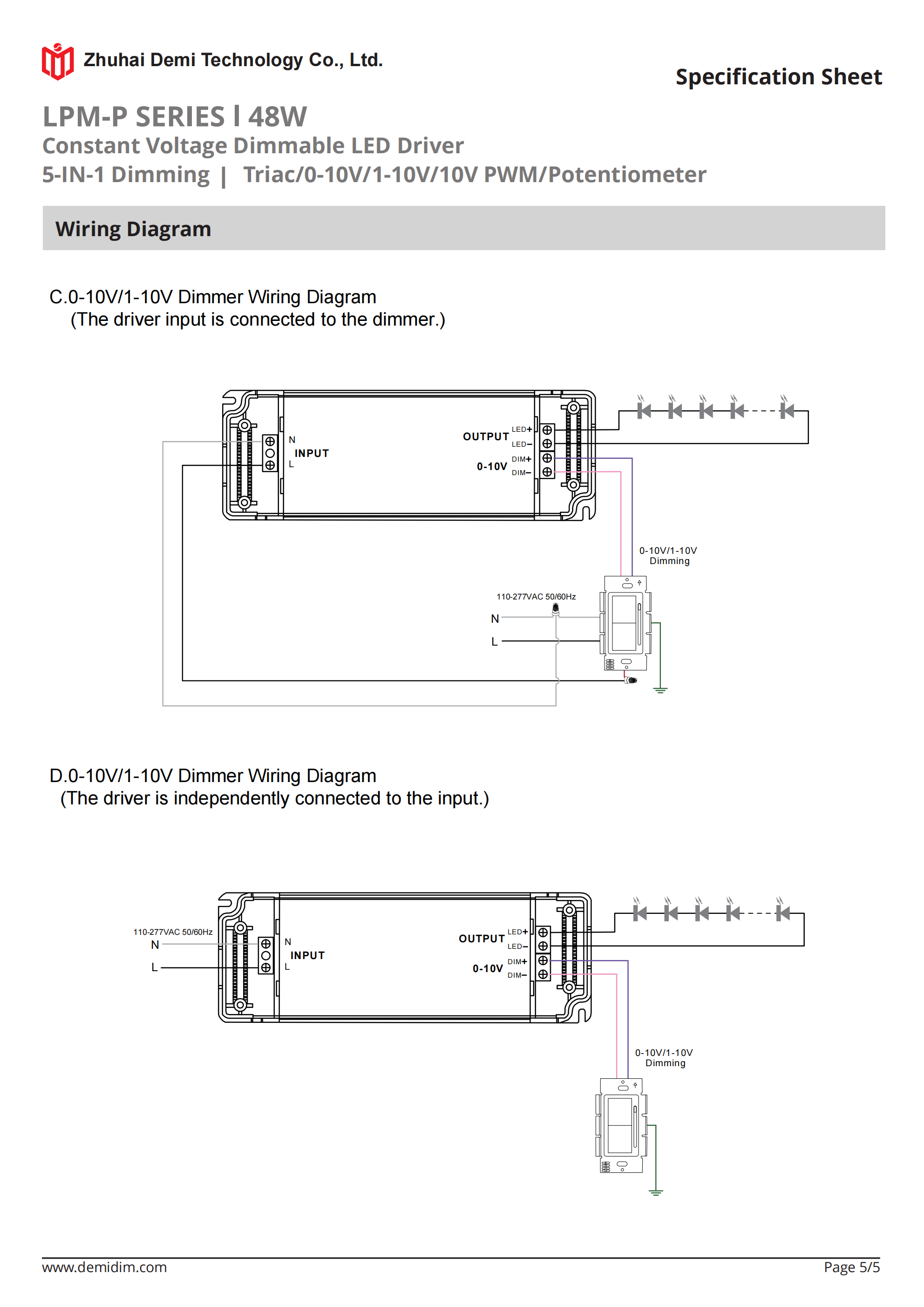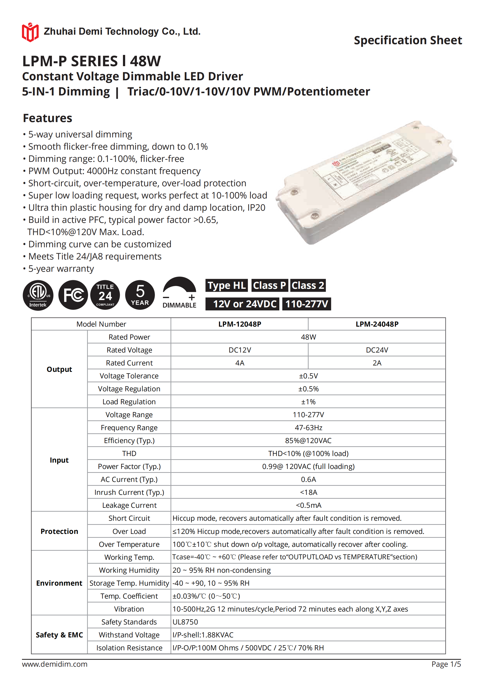 Item number: LPM-12048P,LPM-24048P Dim: Triac/0-10V/1-10V/10V PWM / Potentiometer Dimming method: PWM Input Voltage: 110-277V Output Voltage: 12V/24V PF: ≥0.9 Efficiency: ≥85% Warranty: 5 years. Protection: short circuit,overload,over-temperature, Certificate: ETL Brand: DEMI