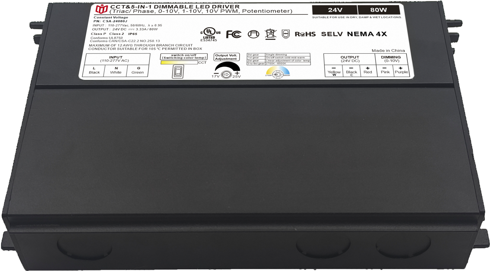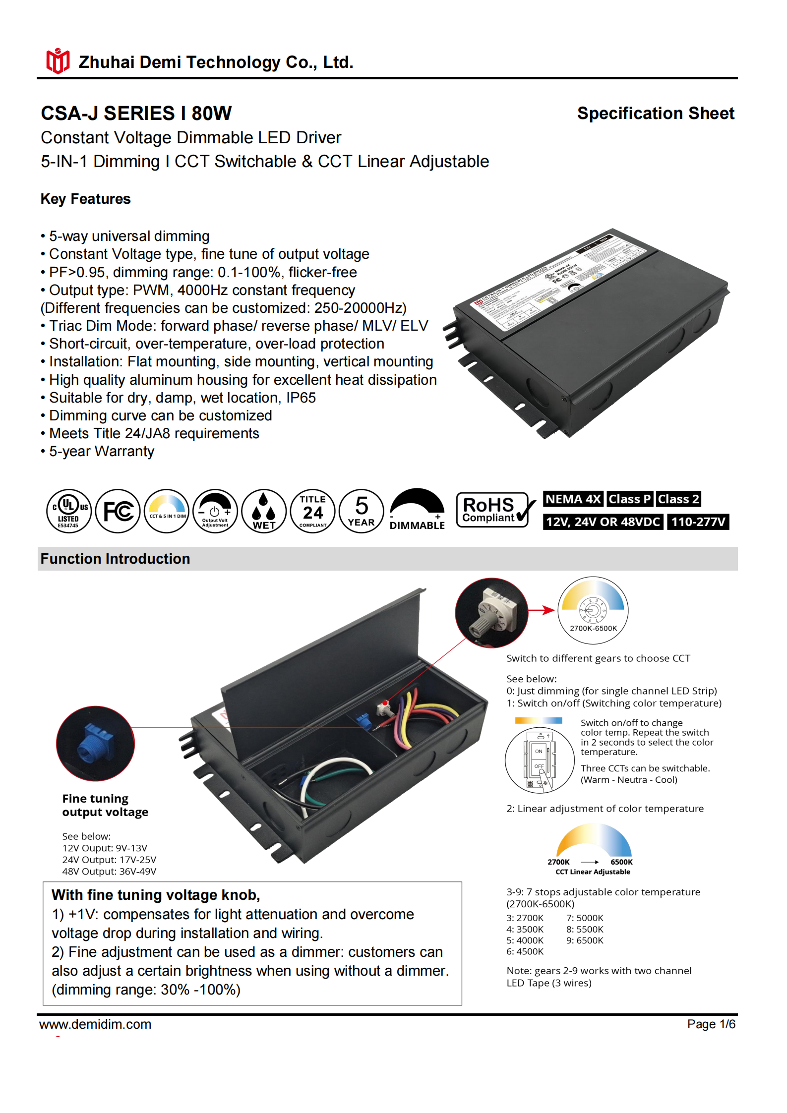 Item number: CSA-12100J,CSA-24100J,CSA-48100J Dim: Triac/0-10V/1-10V/10V PWM / Potentiometer Output Method: PWM Input Voltage: 110-277V Output Voltage: 12V/24V/48V PF: ≥0.9 Efficiency: ≥90% Warranty: 5 years. Protection: short circuit,overload,over-temperature, Certificate: UL list Brand: DEMI