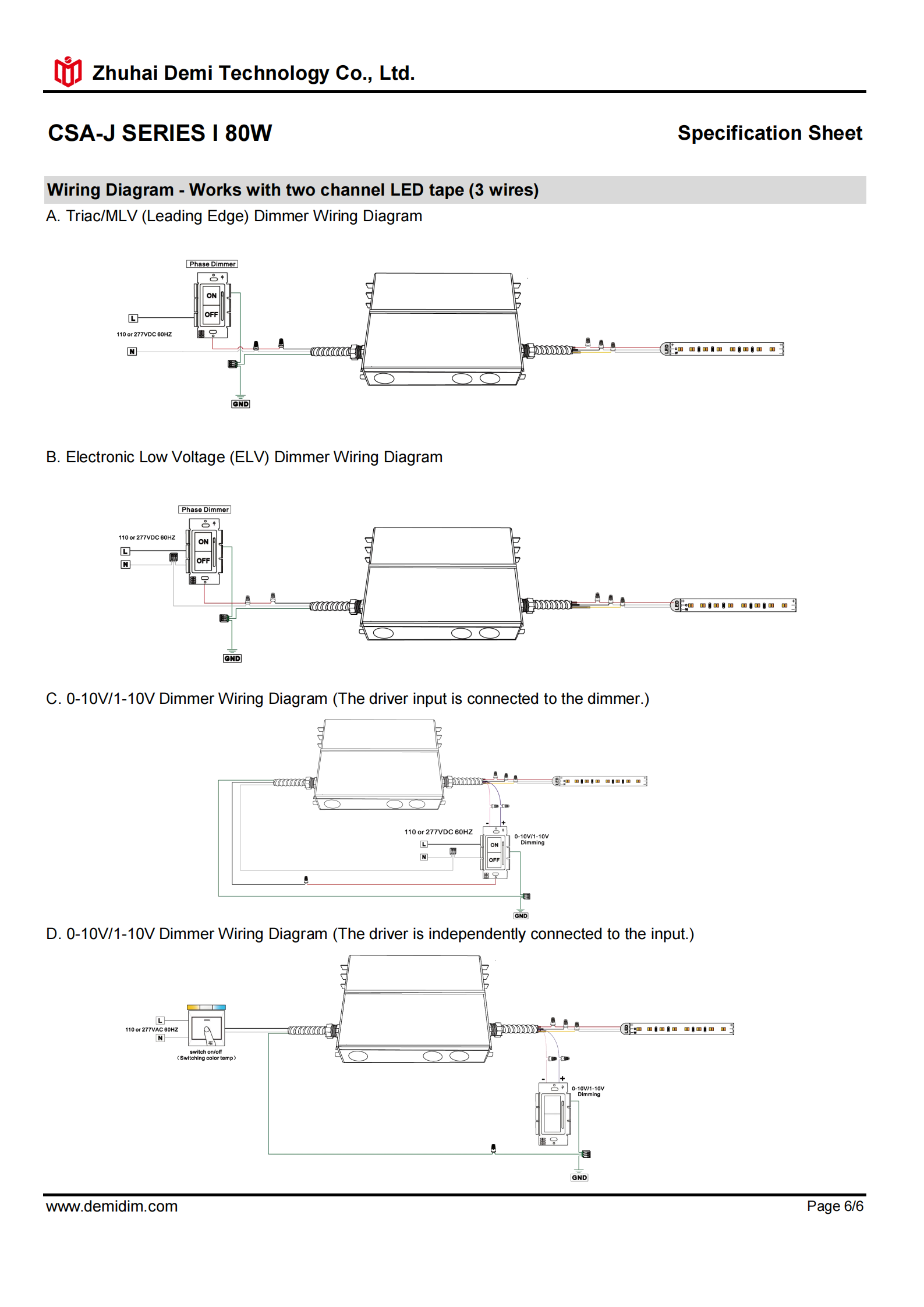 Item number: CSA-12120J,CSA-24120J,CSA-48120J Dim: Triac/0-10V/1-10V/10V PWM / Potentiometer Output Method: PWM Input Voltage: 110-277V Output Voltage: 12V/24V/48V PF: ≥0.9 Efficiency: ≥90% Warranty: 5 years. Protection: short circuit,overload,over-temperature, Certificate: UL list Brand: DEMI