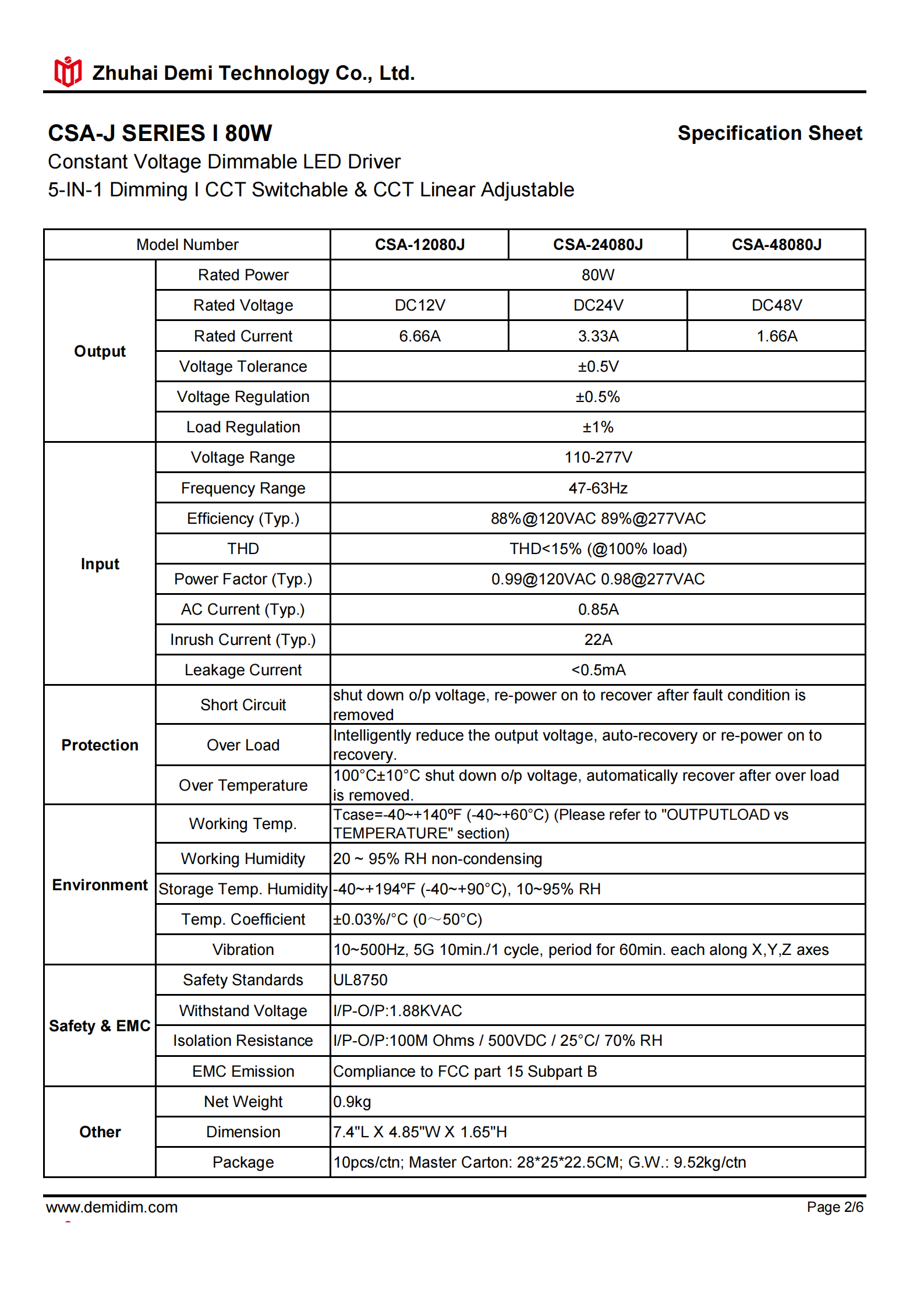 Item number: PMA-12080J,PMA-24080J,PMA-48080J Type : Constant voltage Dim: Triac/0-10V/1-10V/10V PWM / Potentiometer Output Method: PWM Input Voltage: 110-277V Output Voltage: 12V/24V/48V PF: ≥0.9 Efficiency: ≥88% Warranty: 5 years. Protection: short circuit,overload,over-temperature, Certificate: UL list Brand: DEMI